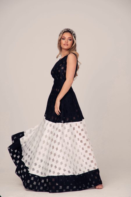 Beautiful women’s set of two parts. Gorgeous and rich skirt in a classic combination – black and white. High waist, skirt with zipper and pockets. The set has a bustier top, which is padded and tied at the waist.