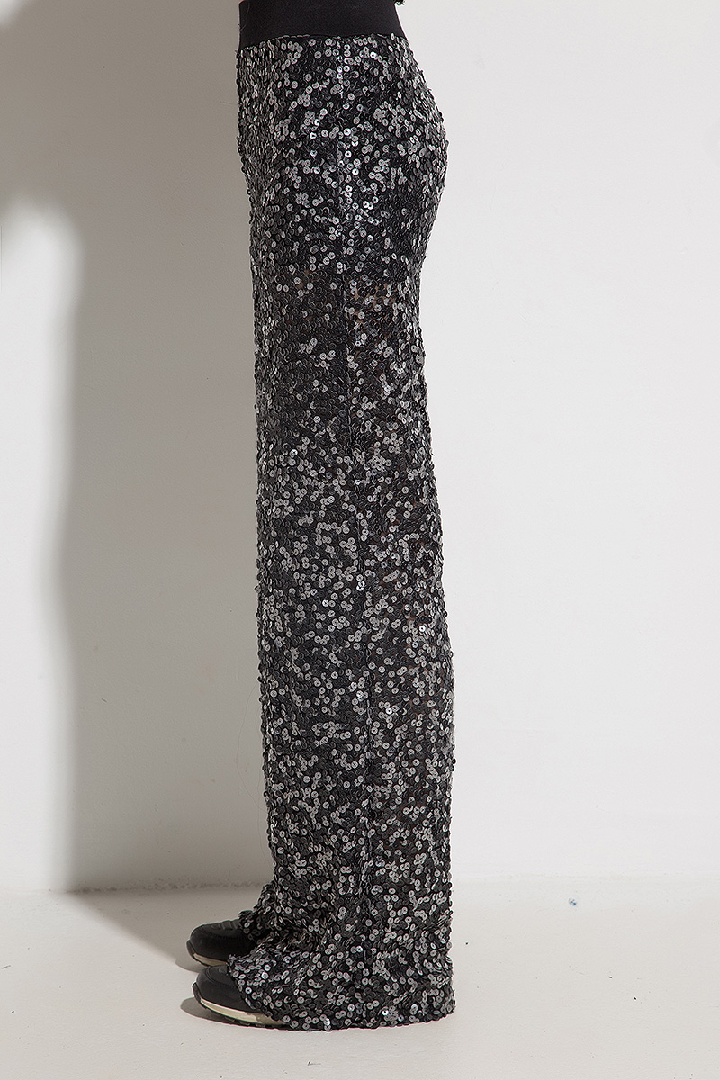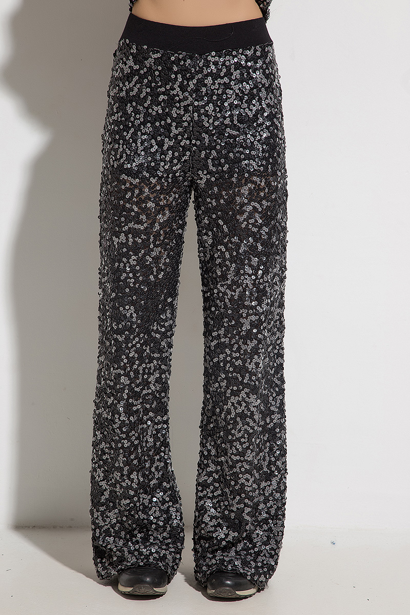 The set consists of a wide asymmetrical vest and free trousers. Effective sequins of leather sequins and linen make the model fashionable and extravagant, yet extremely comfortable and suitable for any occasion.