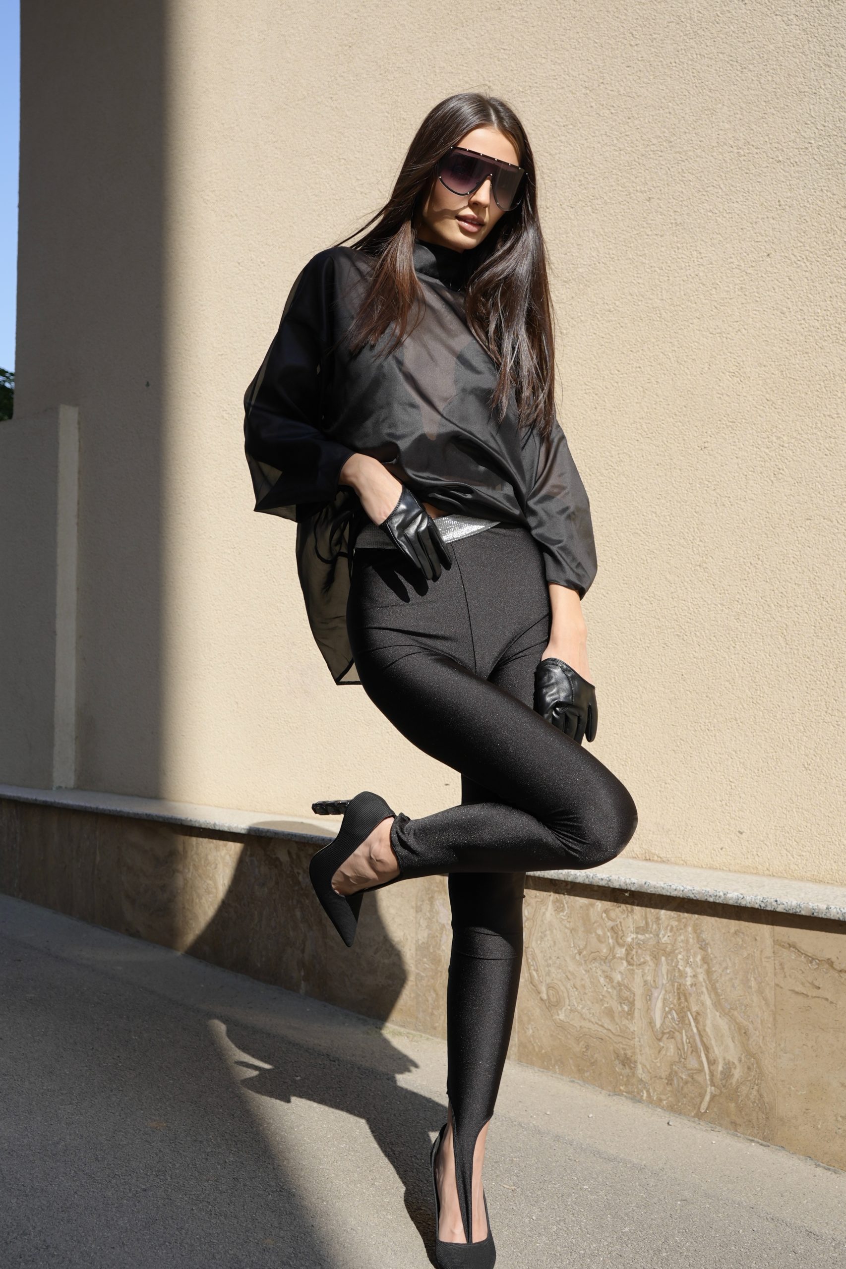 Modern leggings with a high waist and a light satin texture that emphasizes the silhouette. The model has a high waist and a perfect fit on the body, providing comfort and sophistication at the same time. The decorative slit at the bottom gives a bold look – perfect for heels and evening outings.