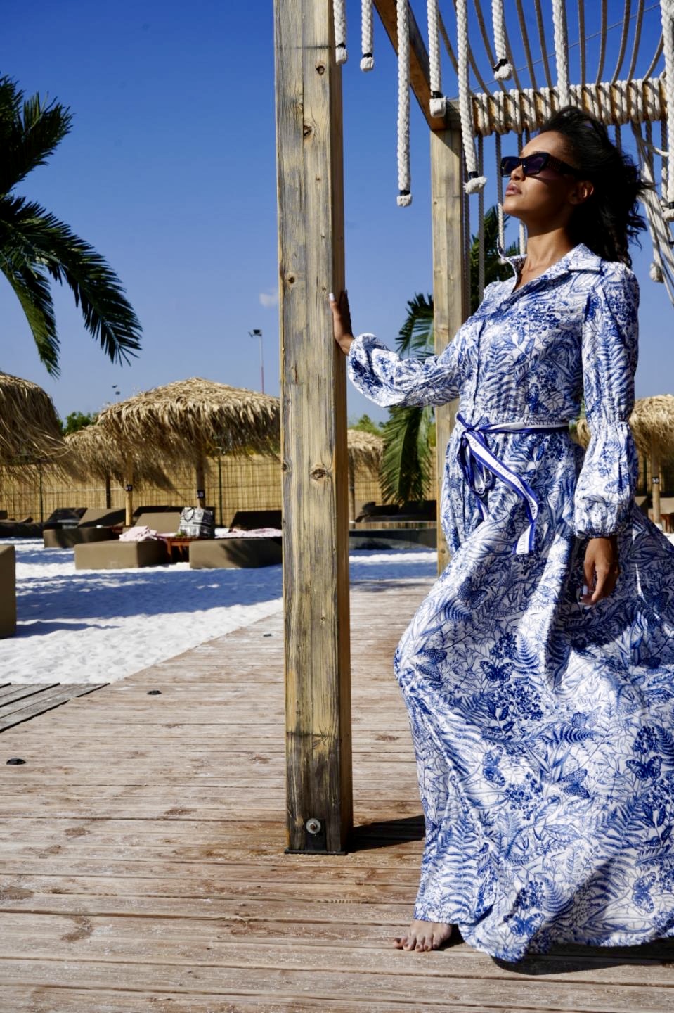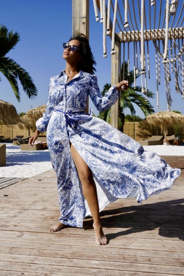 An elegant long dress with a classic collar and front button fastening. Made of fine satin with a slight sheen that gently hugs the body. The designer floral print in blue creates a feeling of freshness and style. An elegant belt at the waist, decorated with the Vanitta Fashion logo, emphasizes the silhouette and brings a subtle accent of branded identity.