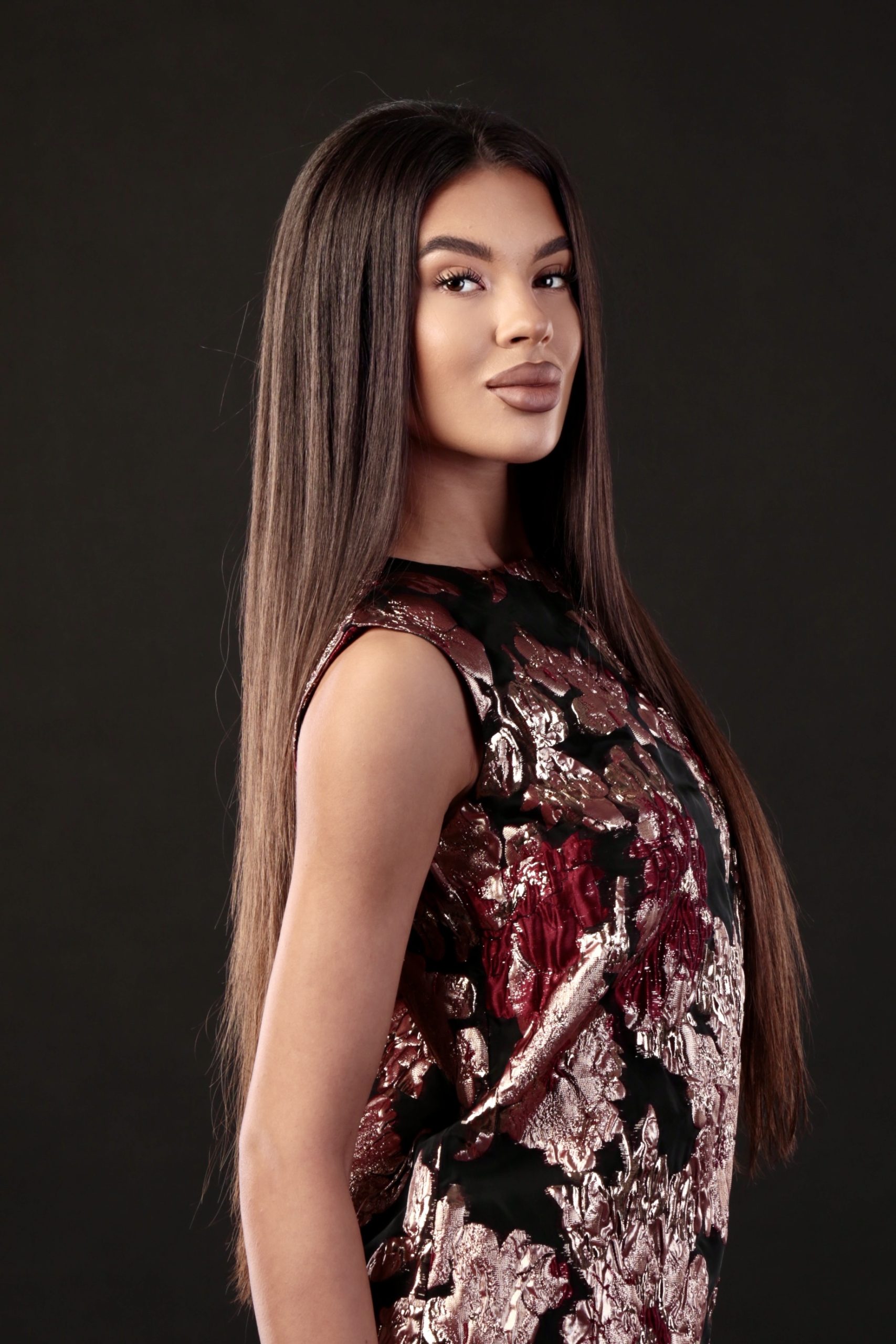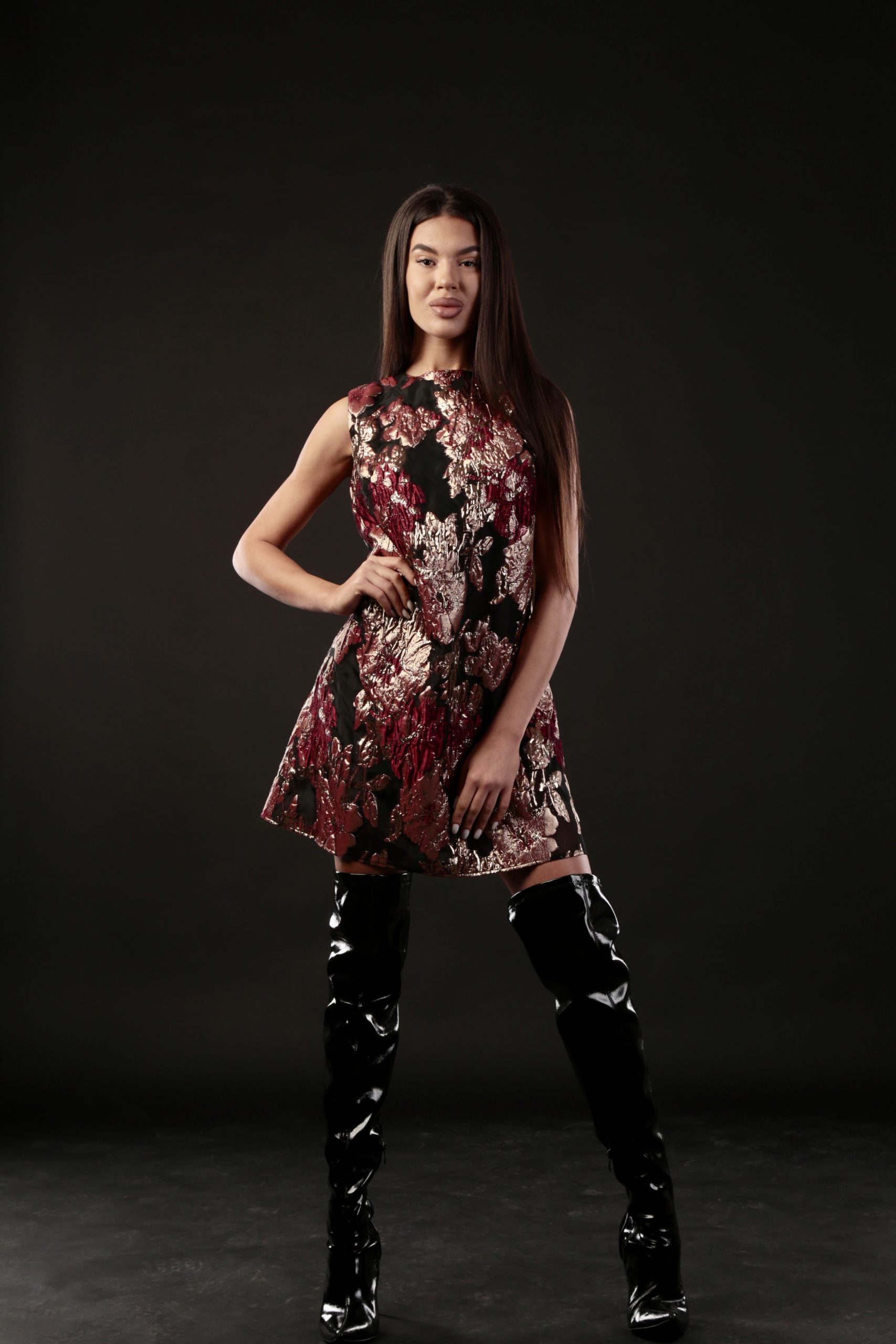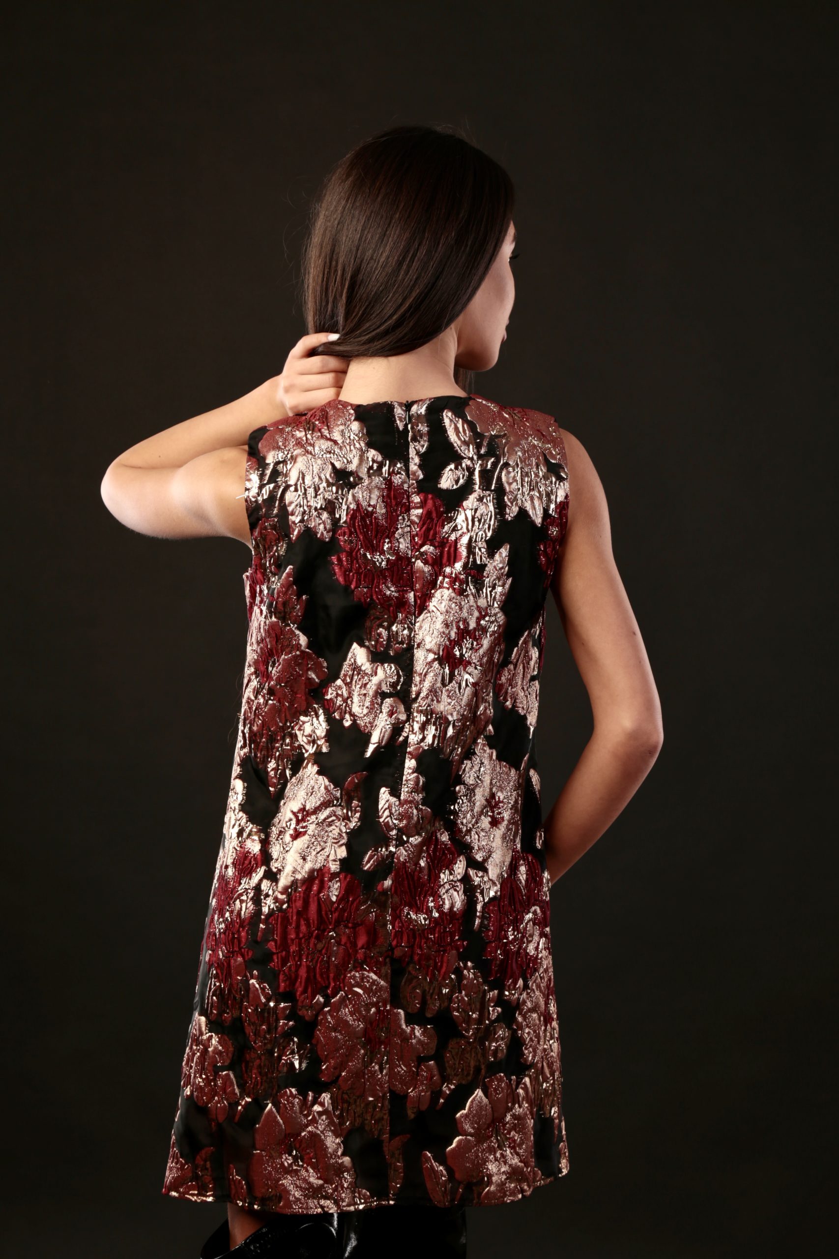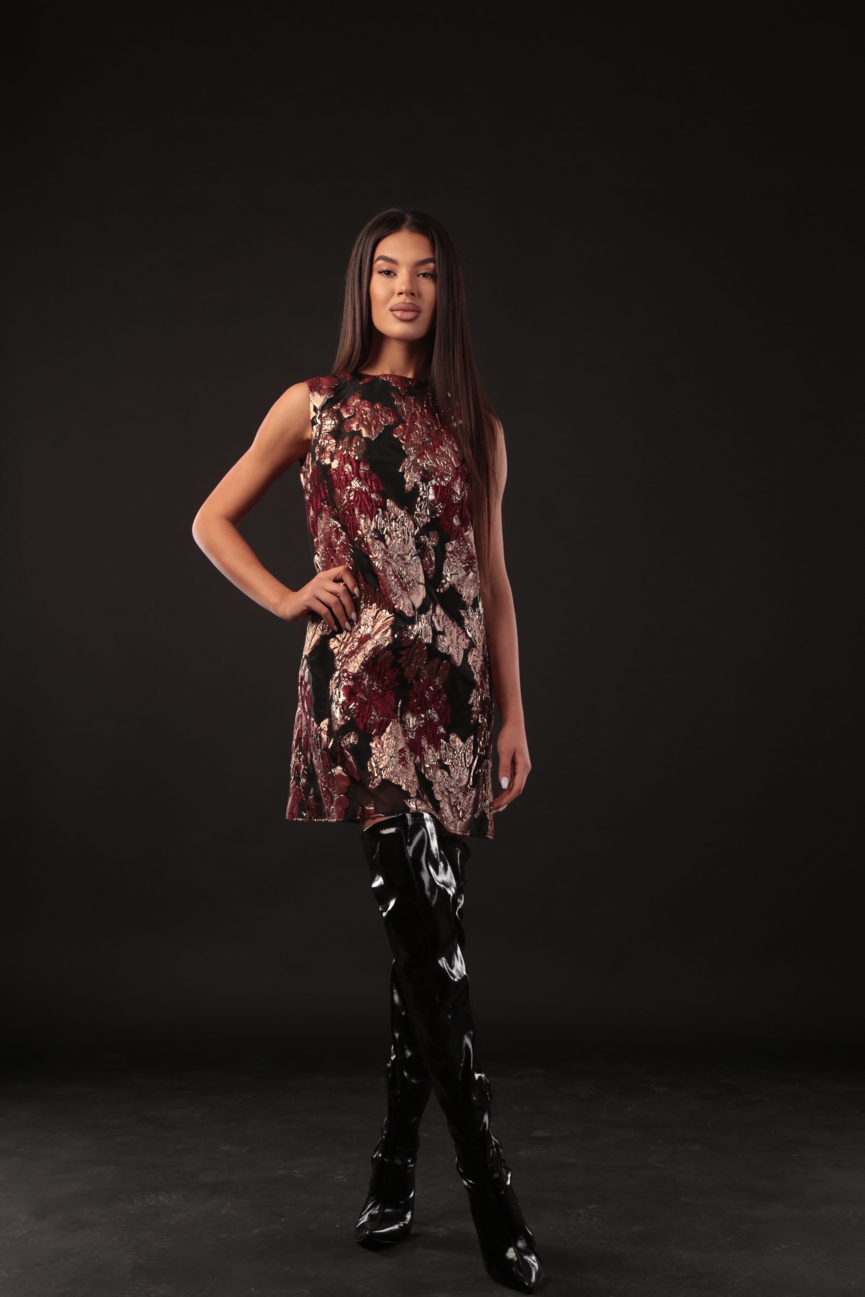 This beautiful dress is made of spectacular, embossed and shiny taffeta, which gives a sophisticated and festive look. The model is sleeveless, with an elegant straight cut and a classic mini length. The warm shade of burgundy with metallic highlights emphasizes the structure of the fabric and creates a feeling of luxury and style. A perfect choice for an evening event or a special occasion where you want to look elegant and memorable.