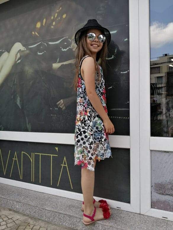 A children’s dress made of fine viscose on which there is a beautiful, lacy lace.