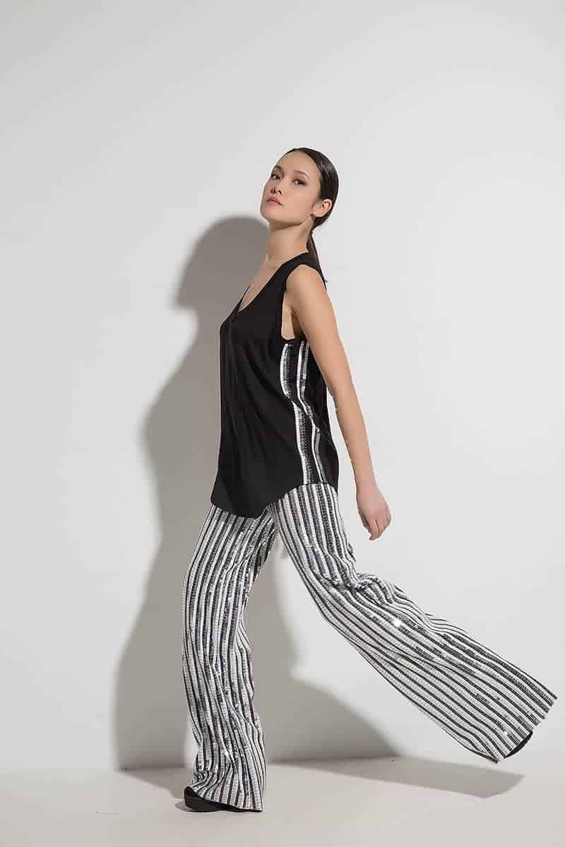 Elegant ladies trousers made of heavy fall fabric with glamorous sequins. The model has a waistband and wide legs. Stylish and extravagant, suitable for formal and party events.