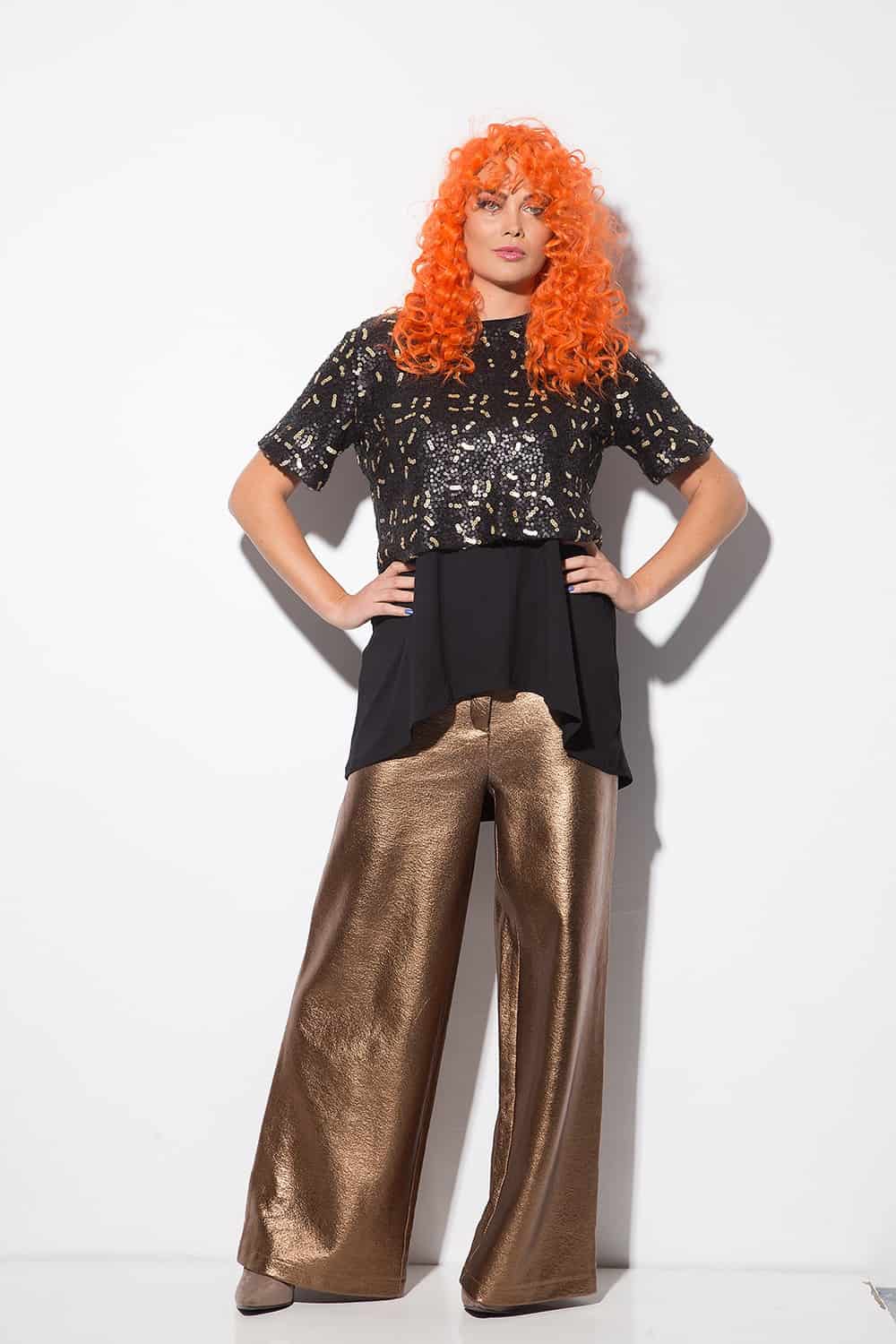 Elegant ladies’ set consisting of a two-piece blouse, a wide jersey of fine knitwear and a short sequined sweater and broad trouser waistband, made of a stretch-tight, tight-fitting trinket with a glossy coating that comes in a length of 7/8.
