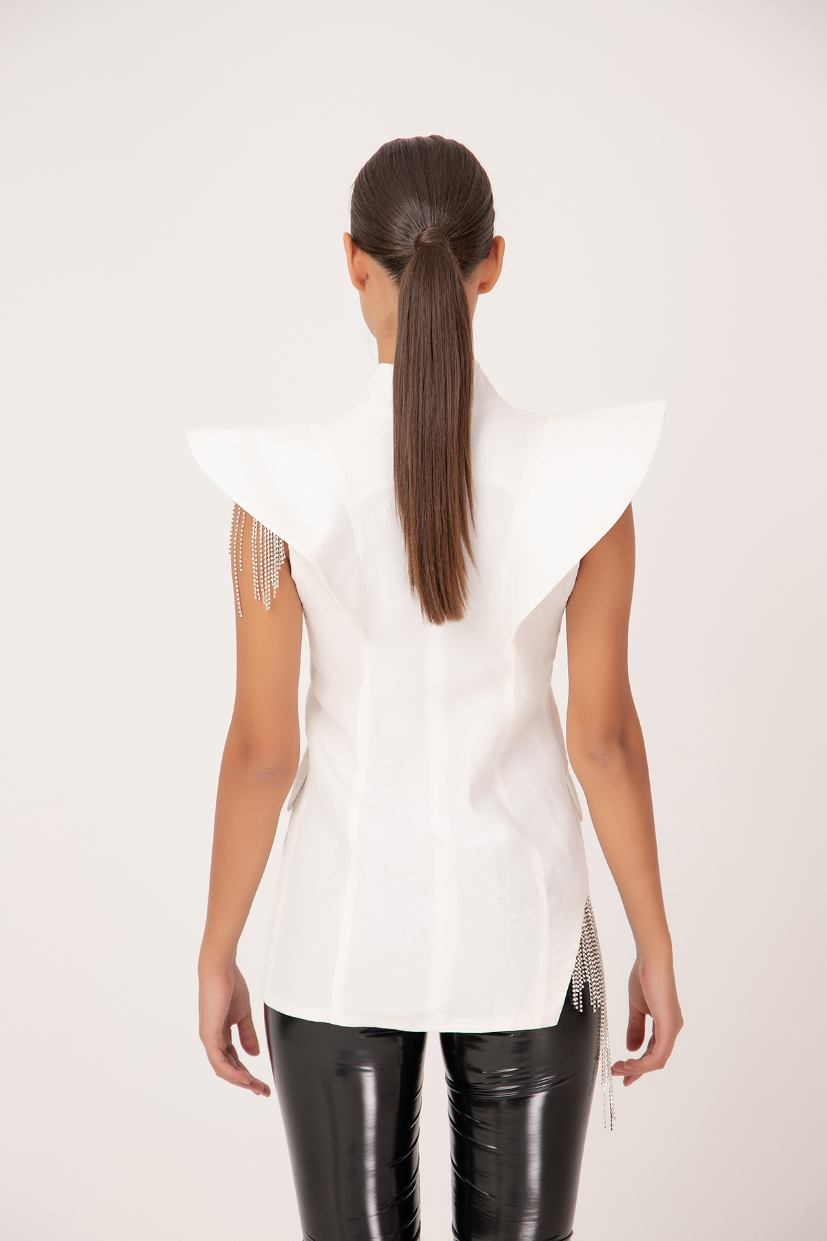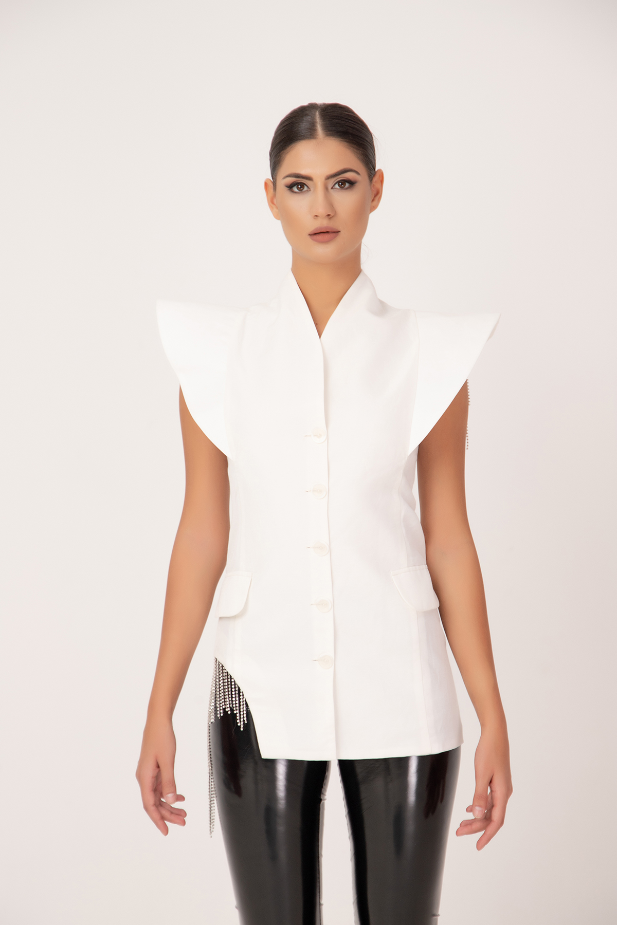 Amazing women’s jacket made of 100% taffeta with fringes of silver crystals in the hips and shoulders. The jacket model is an elegant and extravagant look.