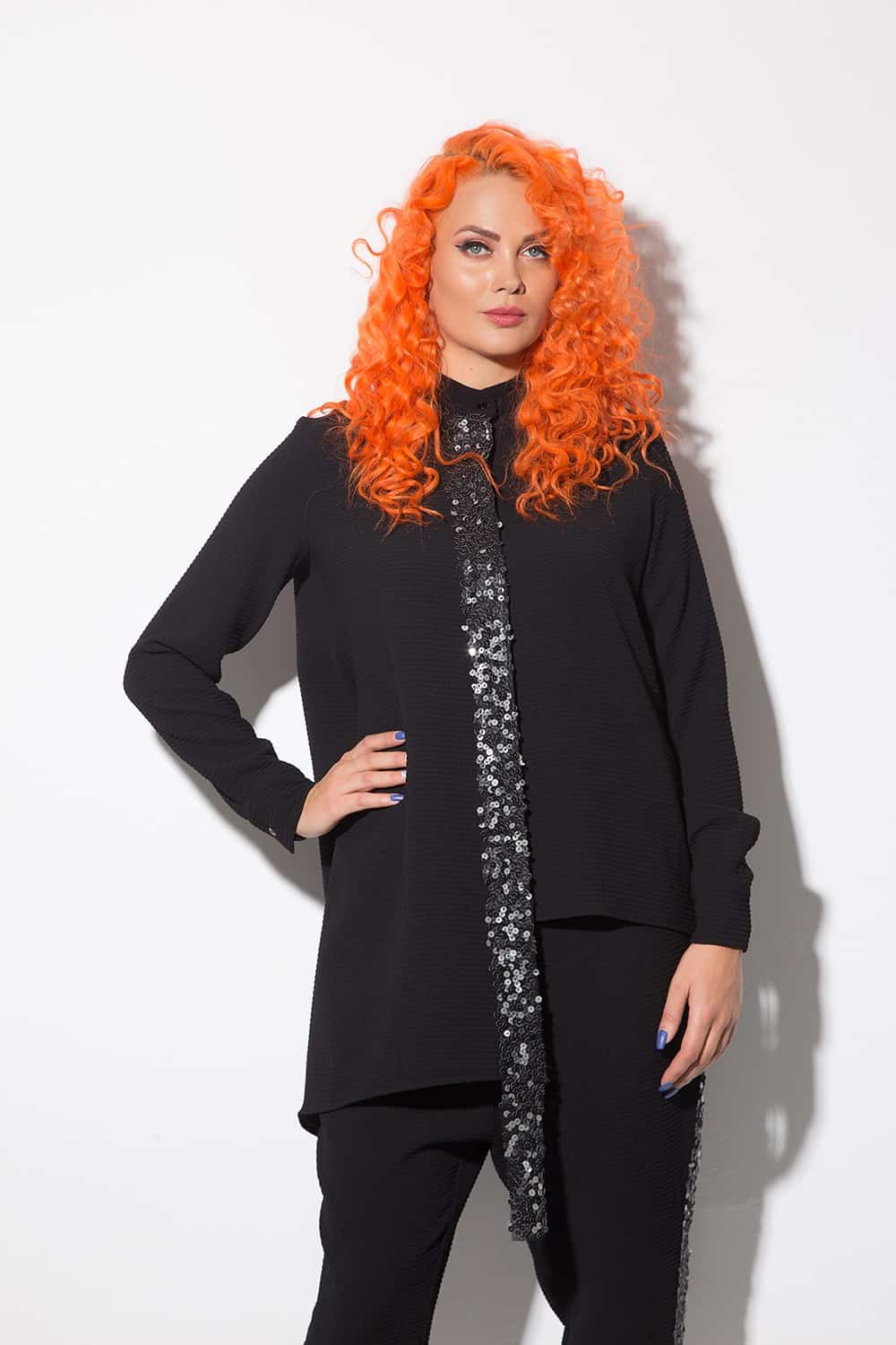 Elegant women’s set, made of heavy falling fabric with leather sequins. It consists of an asymmetrical shirt with concealed buttoning and a collar chair and loose trousers with a waist elastic.