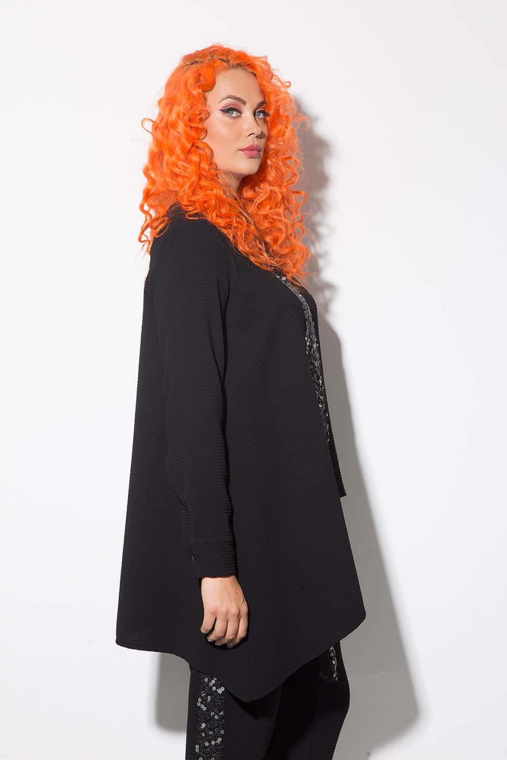 Extravagant ladies tunic with slits and outer seams made of elastic cotton fabric. An interesting and different model, suitable for every day. The product is available in one size.