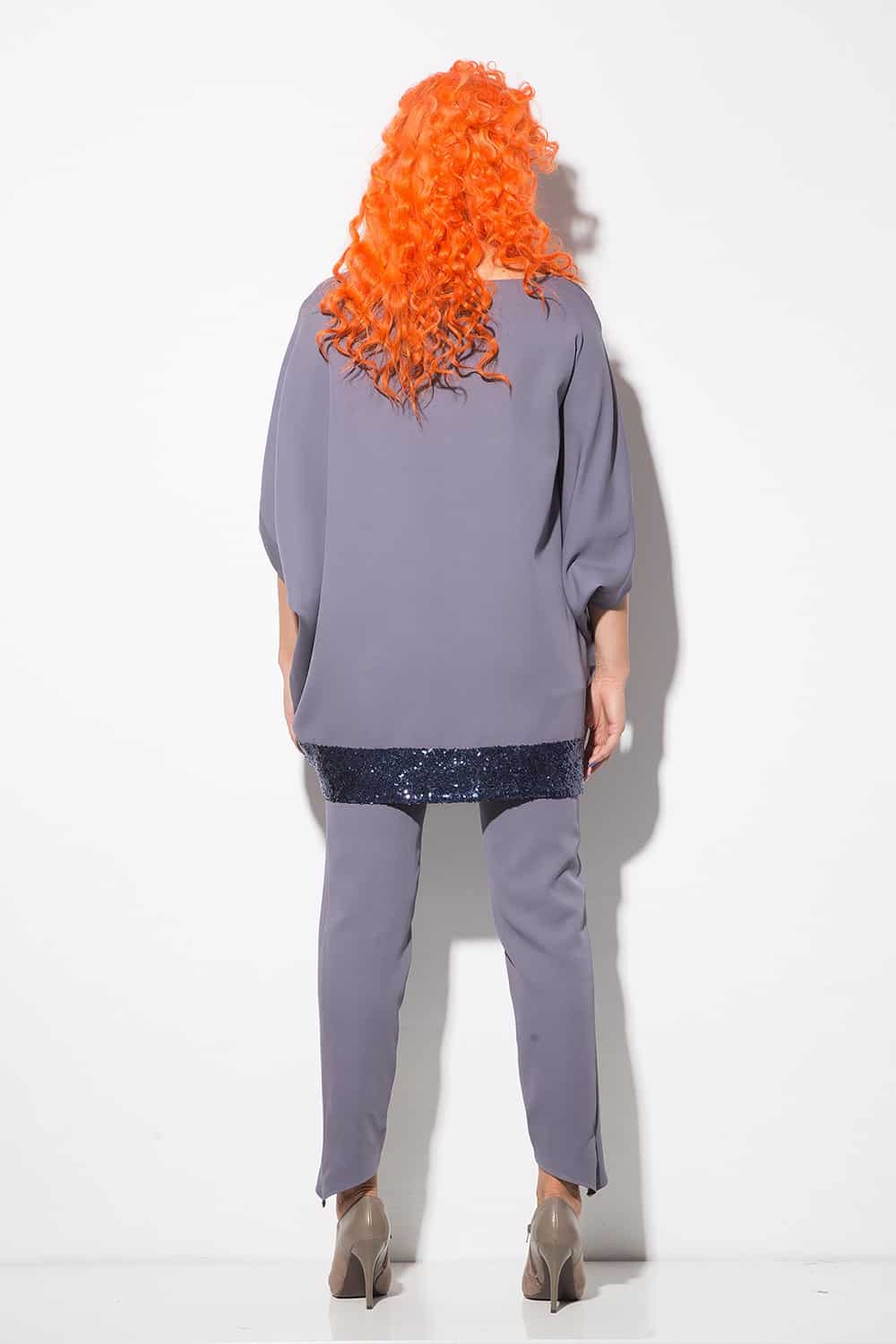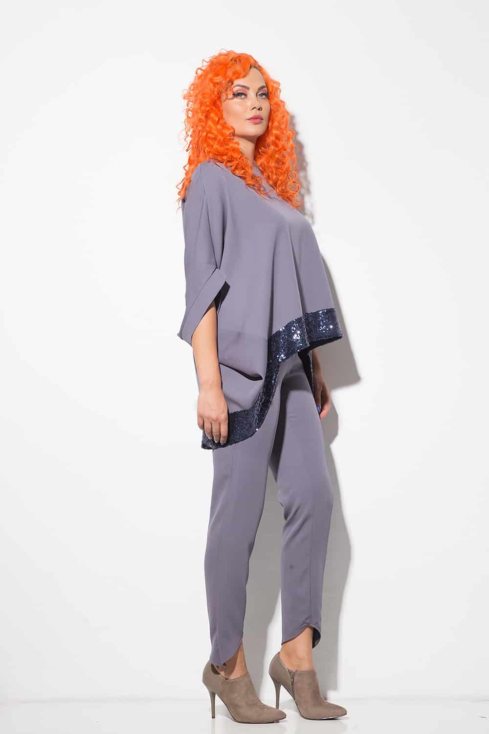 Elegant women’s set made of high quality silk. It consists of a straight trouser with a sharp detail in the lower legs and a loose blouse, longer in the back with sequin details.