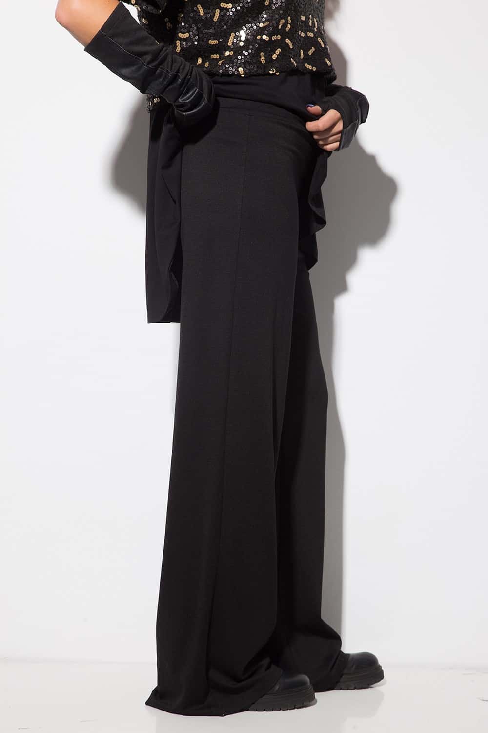 Elegant women’s set, consisting of a blouse made of three parts – a wide jersey of fine leotard with a short blouse of sequins and wide trousers made of elastic tight leotard.