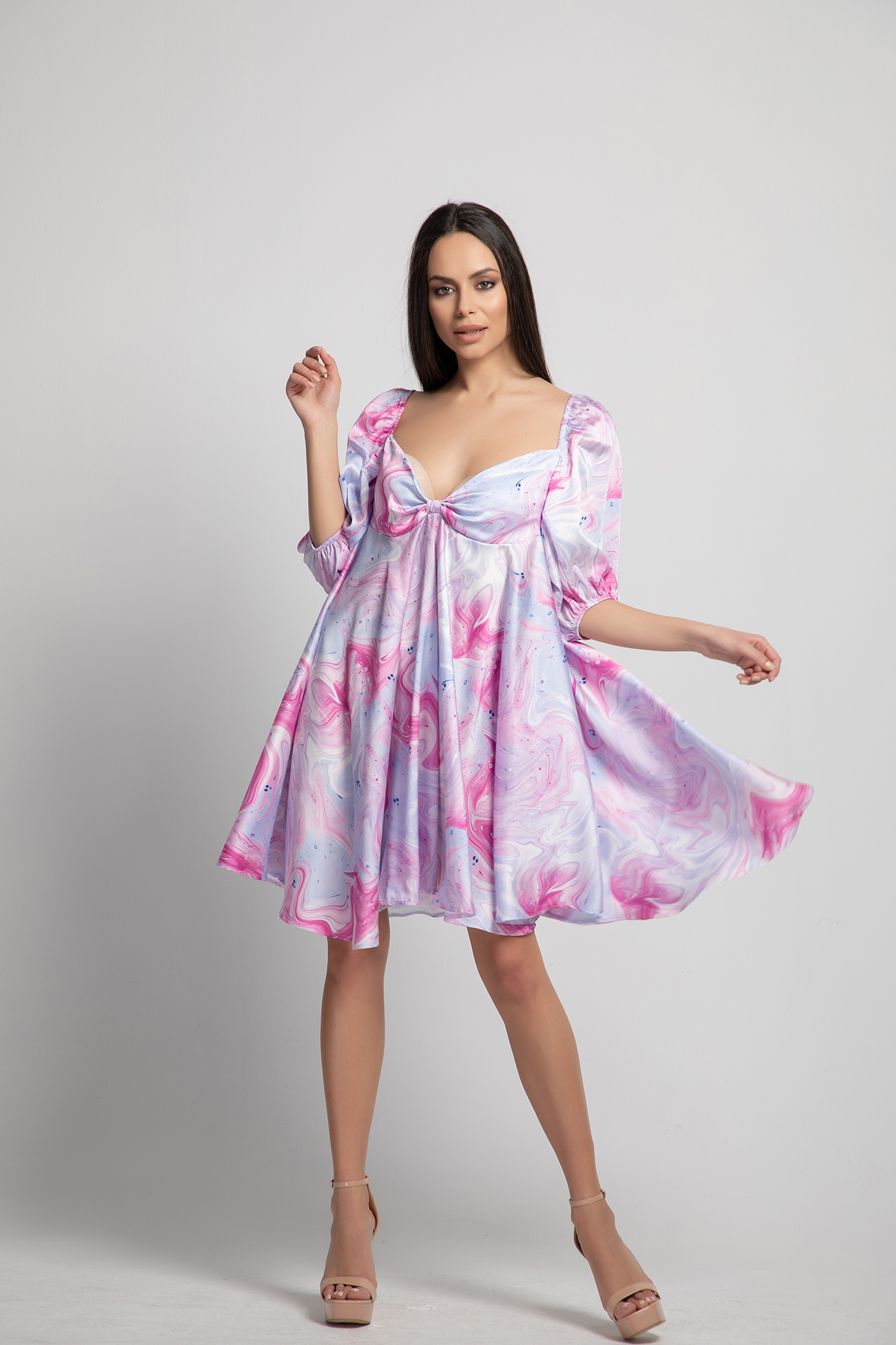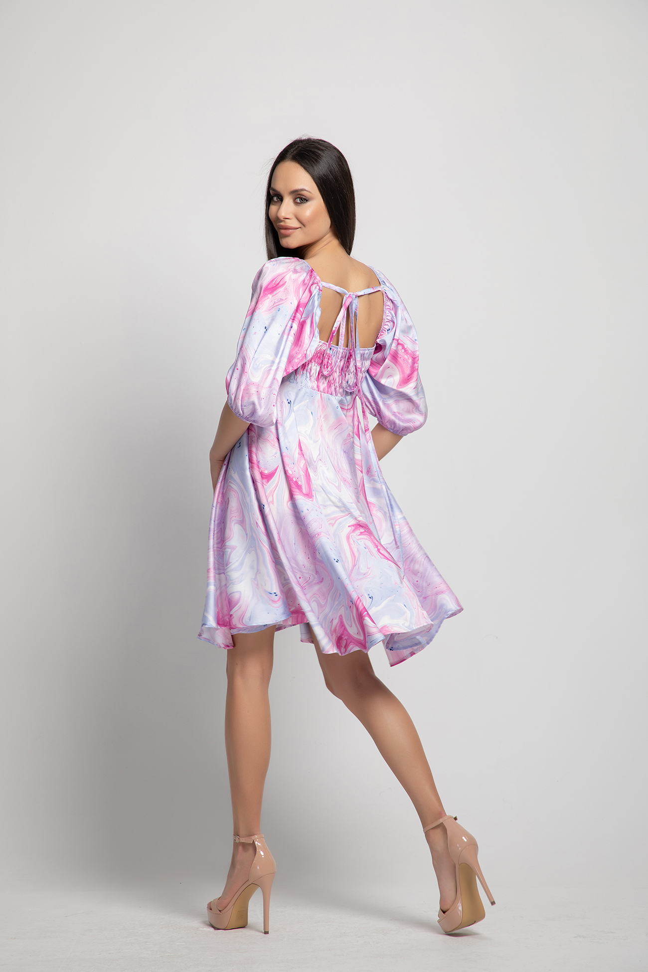 Generous sleeves with elastic, bustier neckline. The dress has a tailored fit, an elegant elastic set at the back.