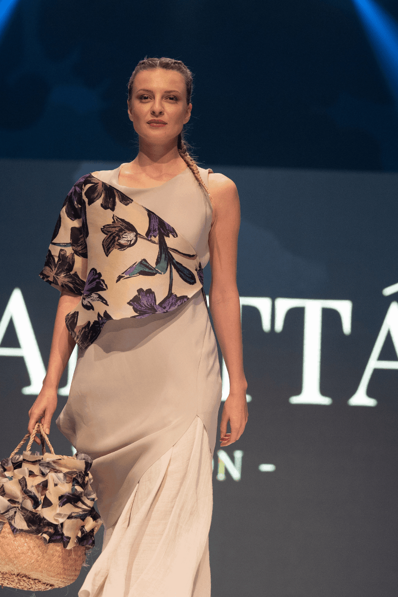 Long ladies dress made of linen and silk with additional floral detail at the top.