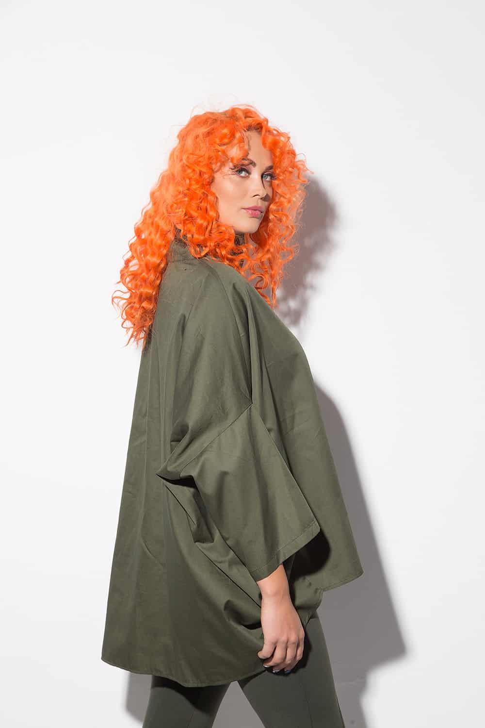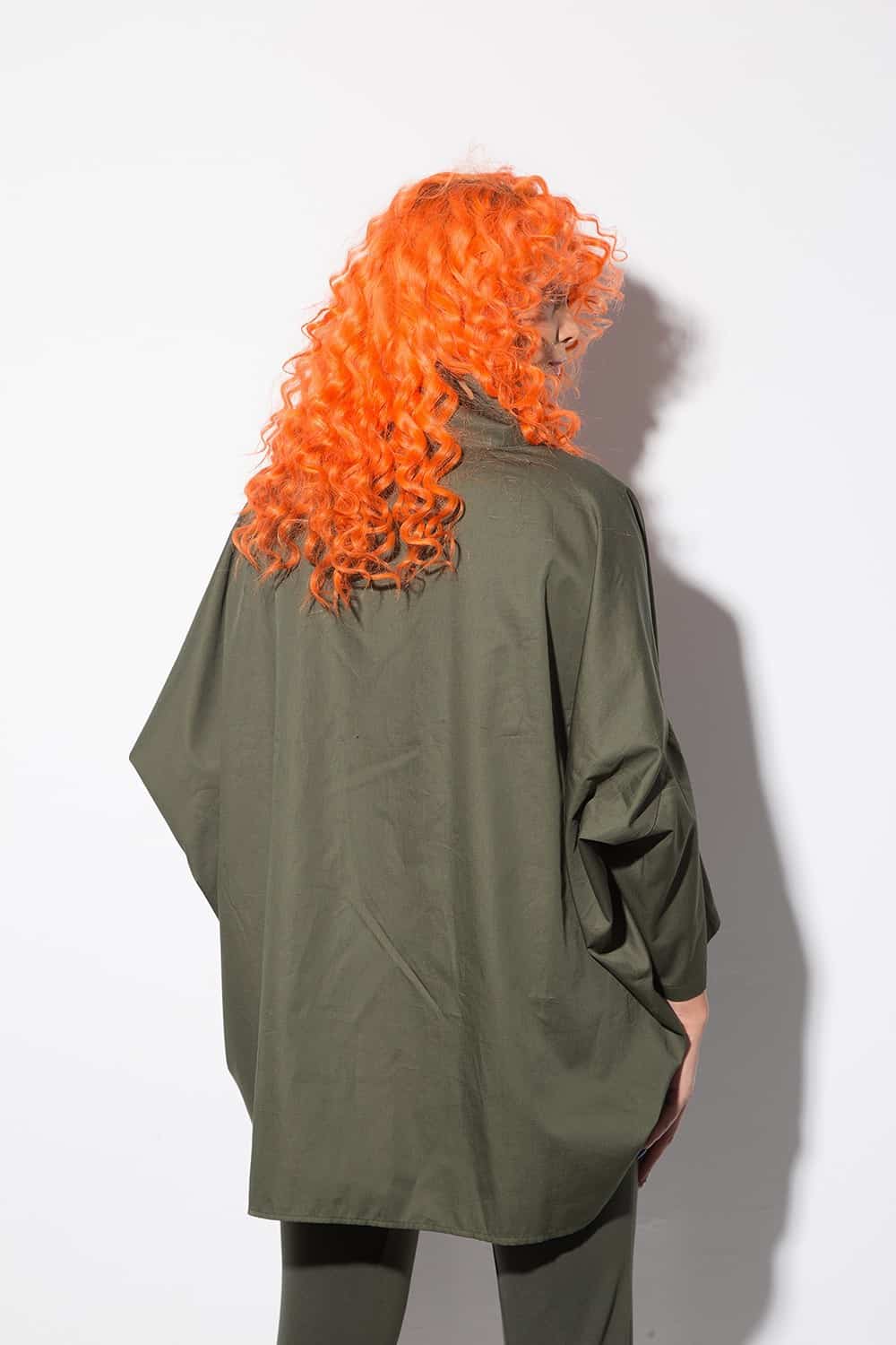 A casual women’s shirt made of fine cotton fabric with a loose cut. Asymmetrical front zipper and wide sleeves.