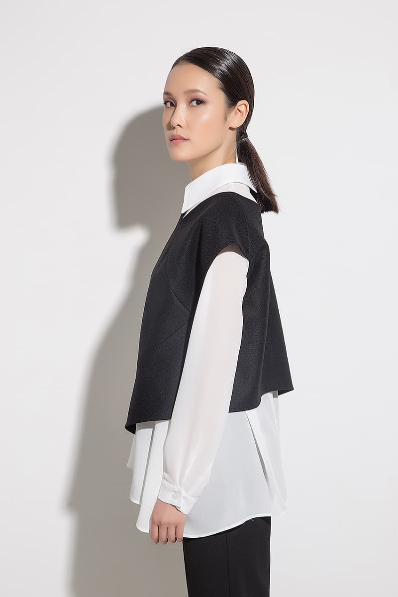 Free white long-sleeved shirt with an asymmetrical top in black. Both parts can be worn separately. The model is suitable for everyday life as well as for the office.