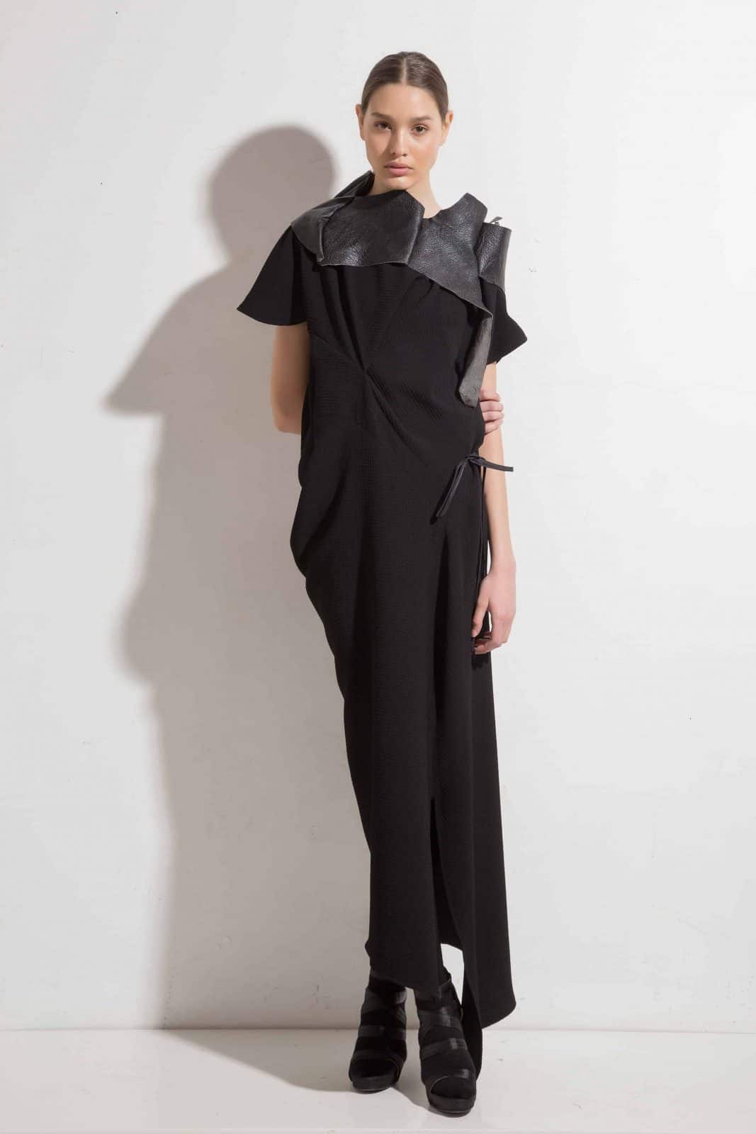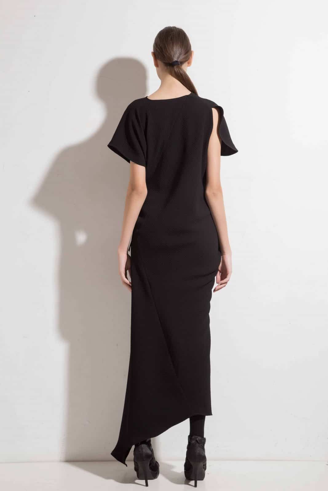 Long asymmetrical dress made from interesting heavy fall fabric. Suitable for any type of figure. Accessories are not included in the price.