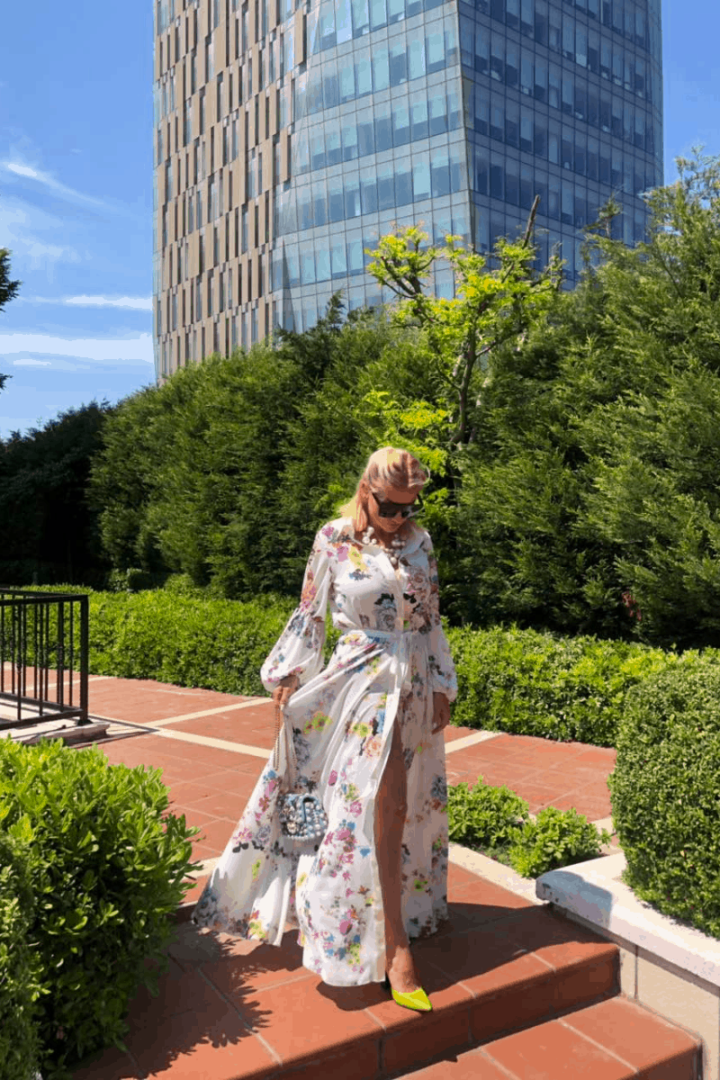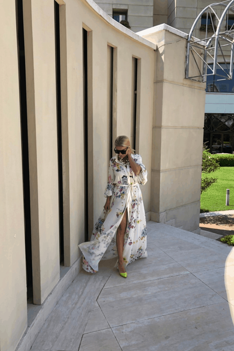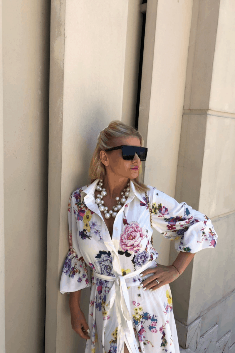 Long ladies dress made of sheer lightweight fabric with an interesting pattern. The model has a front fastener and wide sleeves, with a waist elastic. Suitable for any type of figure.
