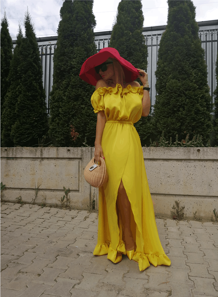 Long ladies’ dress with a slit in the front, made of a heavy drop material in yellow.
