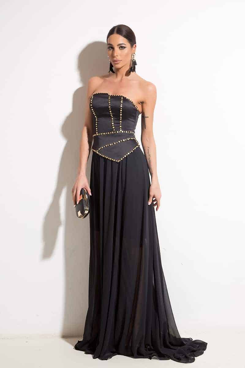 Elegant ladies dress made of a satin corset with spectacular oxidized details and a free falling lower part of the ethereal chiffon. Suitable for official events.