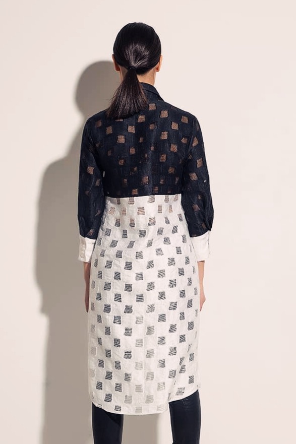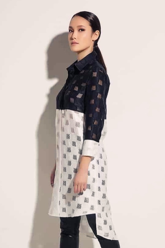 Designer long shirt made of pleasant fabric in combination of black and white with interesting right. Comfortable and stylish, suitable for every day.