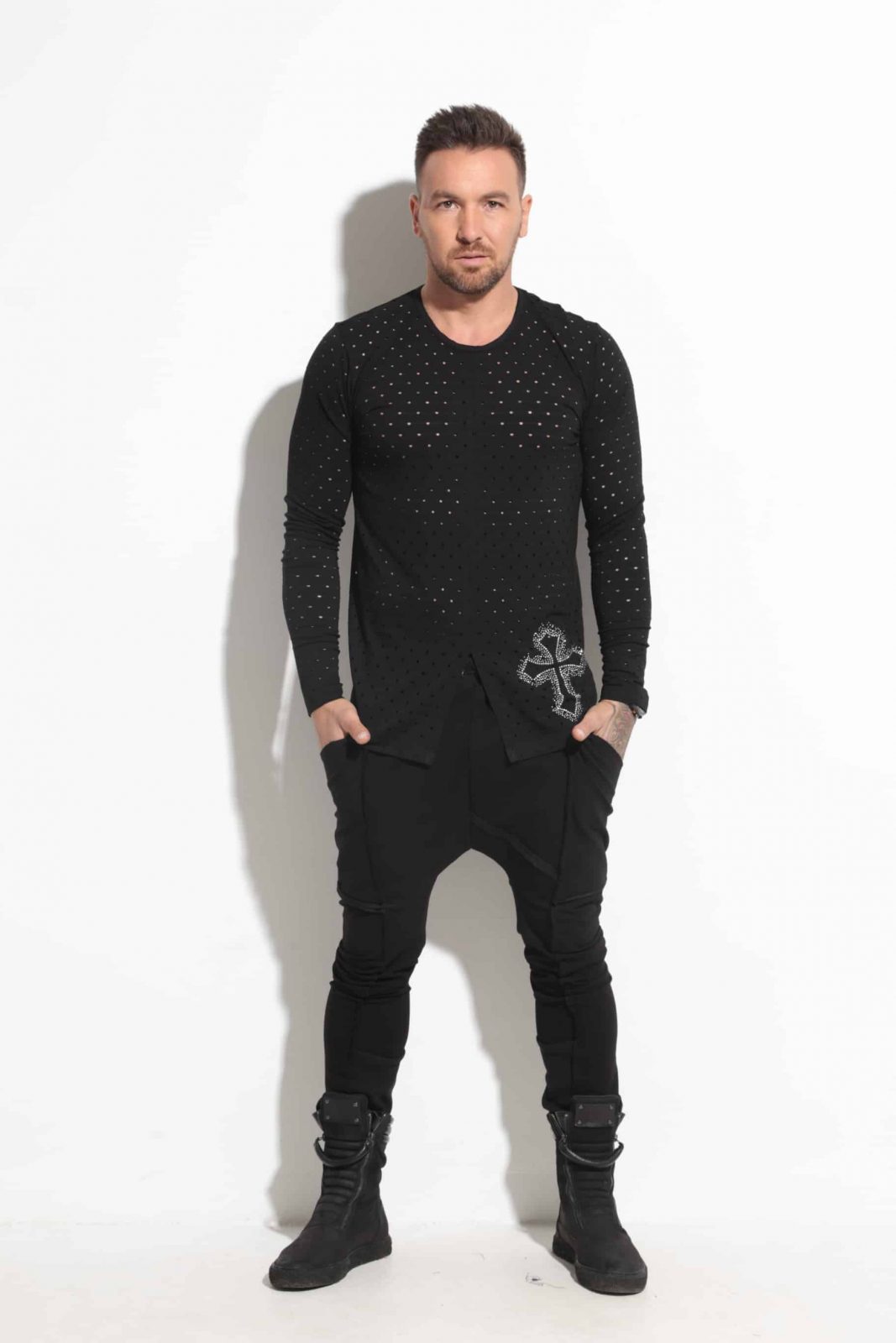 Men’s blouse with two-piece appliqué – the upper is made of elastic material in holes and the lower one is made of thin viscose.