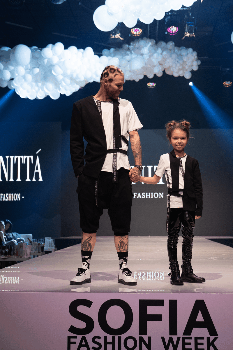 Sporty-elegant jacket made of padded linen with asymmetrical fastening. The model has hand-painted sleeve details and the effect of rough seams.