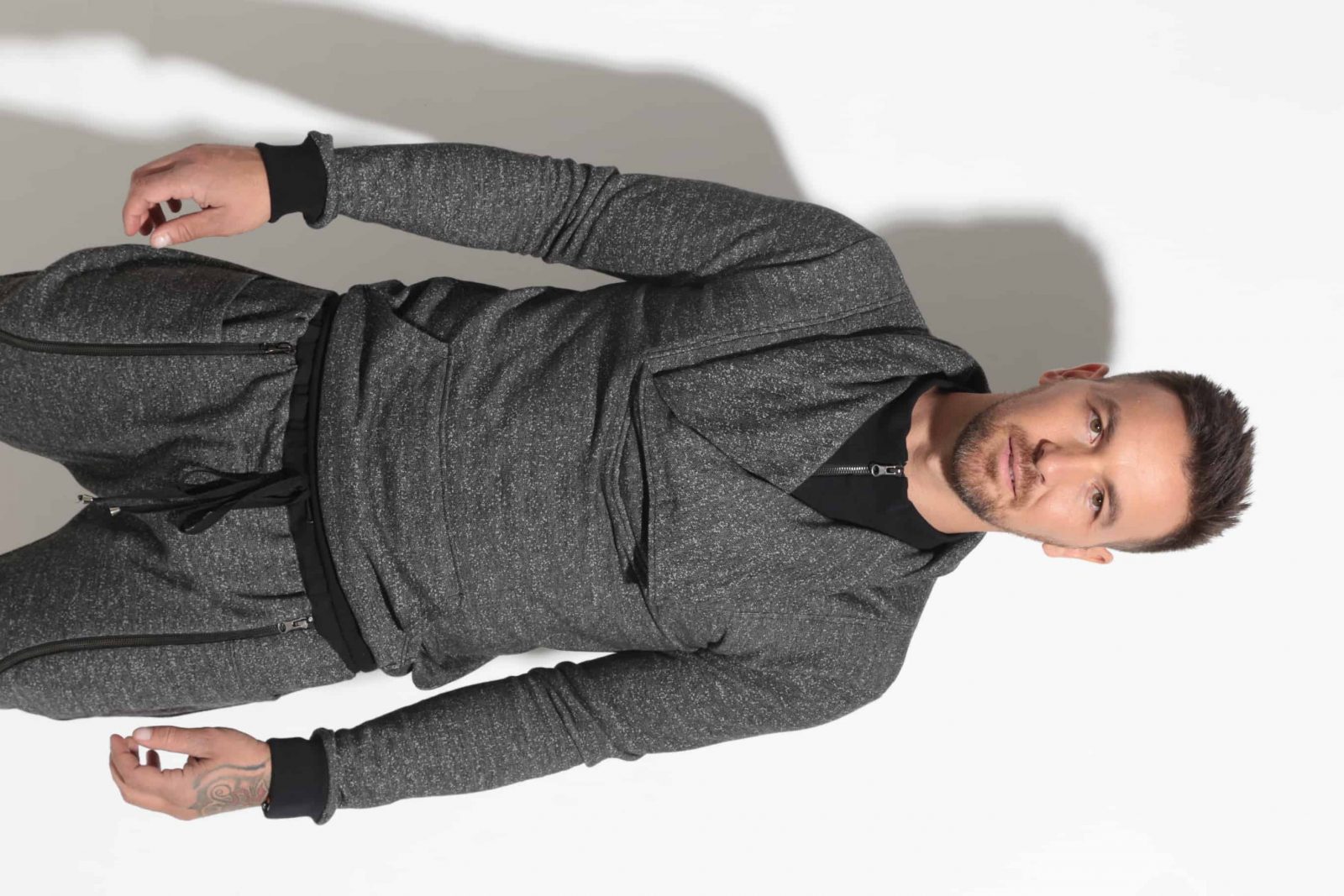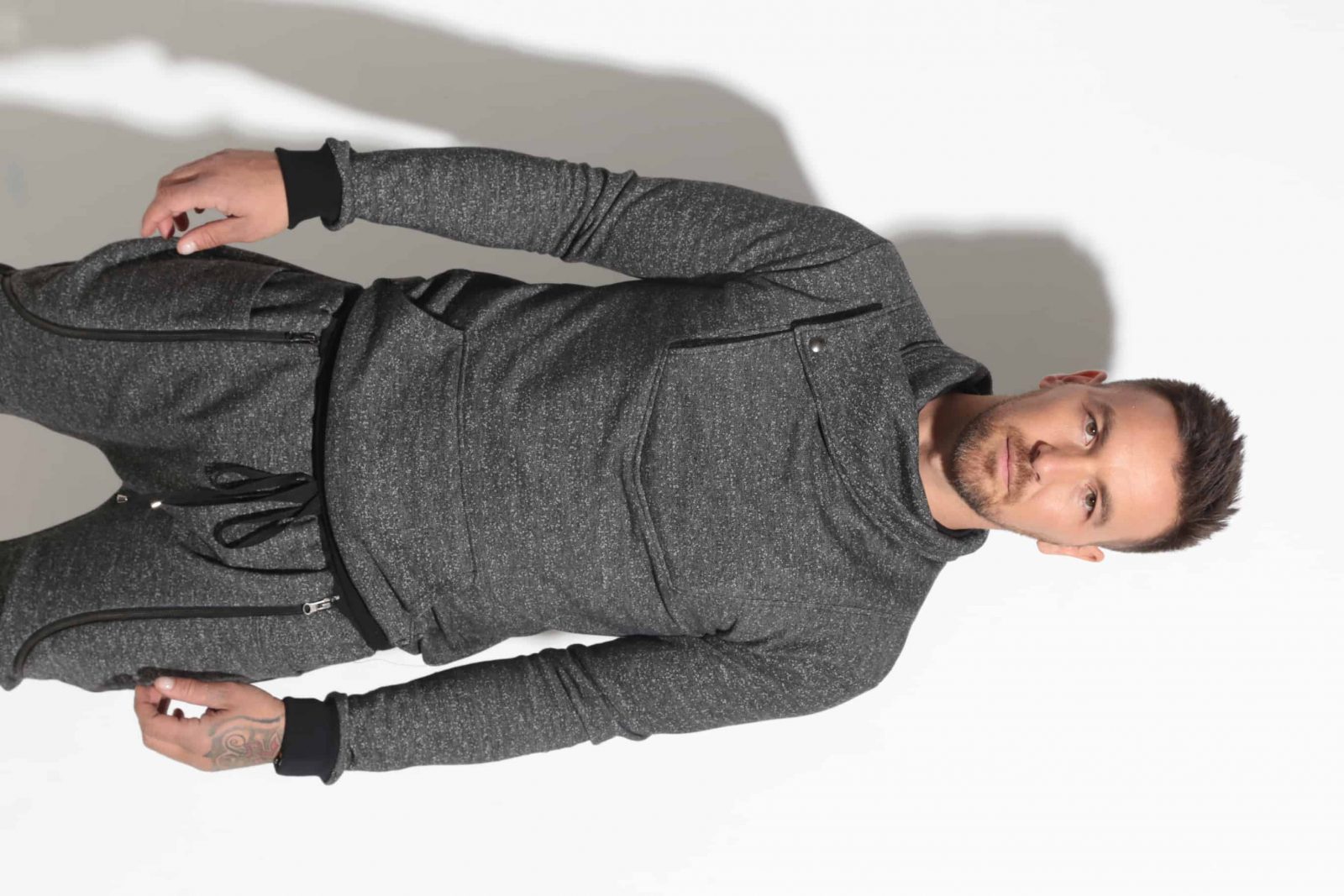 Sporty men’s set made of thick elastic fabric. The trouser waistband and striped zippers around the front pockets. Sweatshirt has a large collar with a fastening and a front pocket.