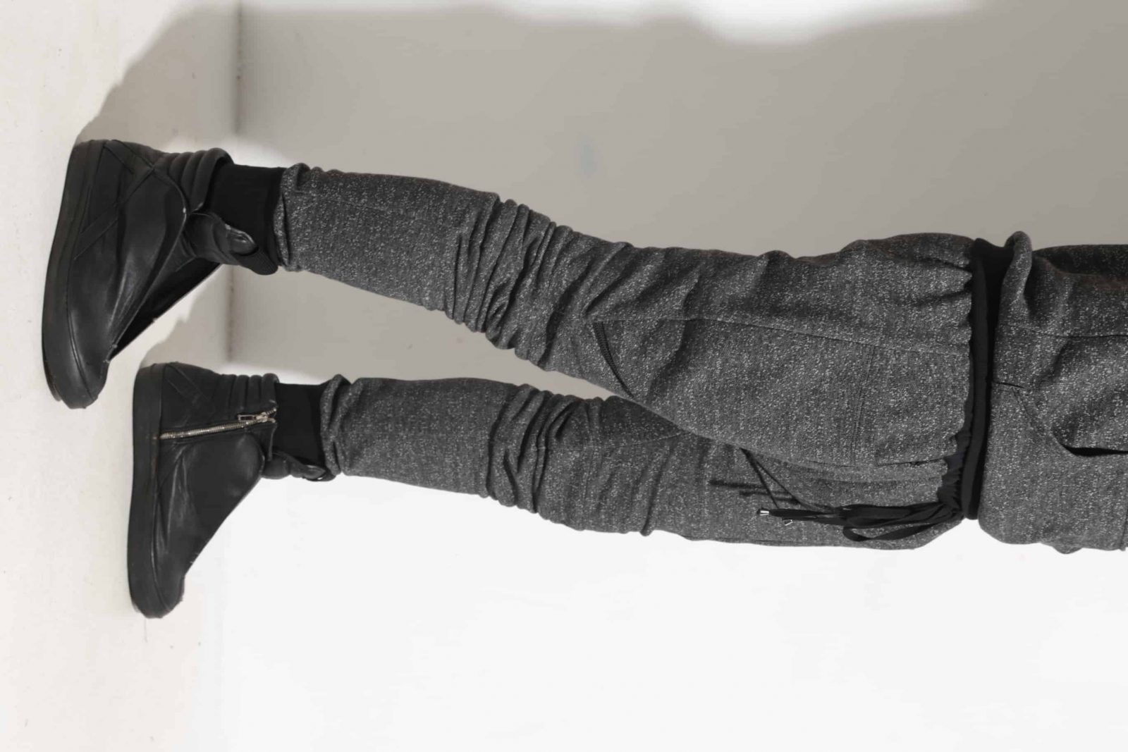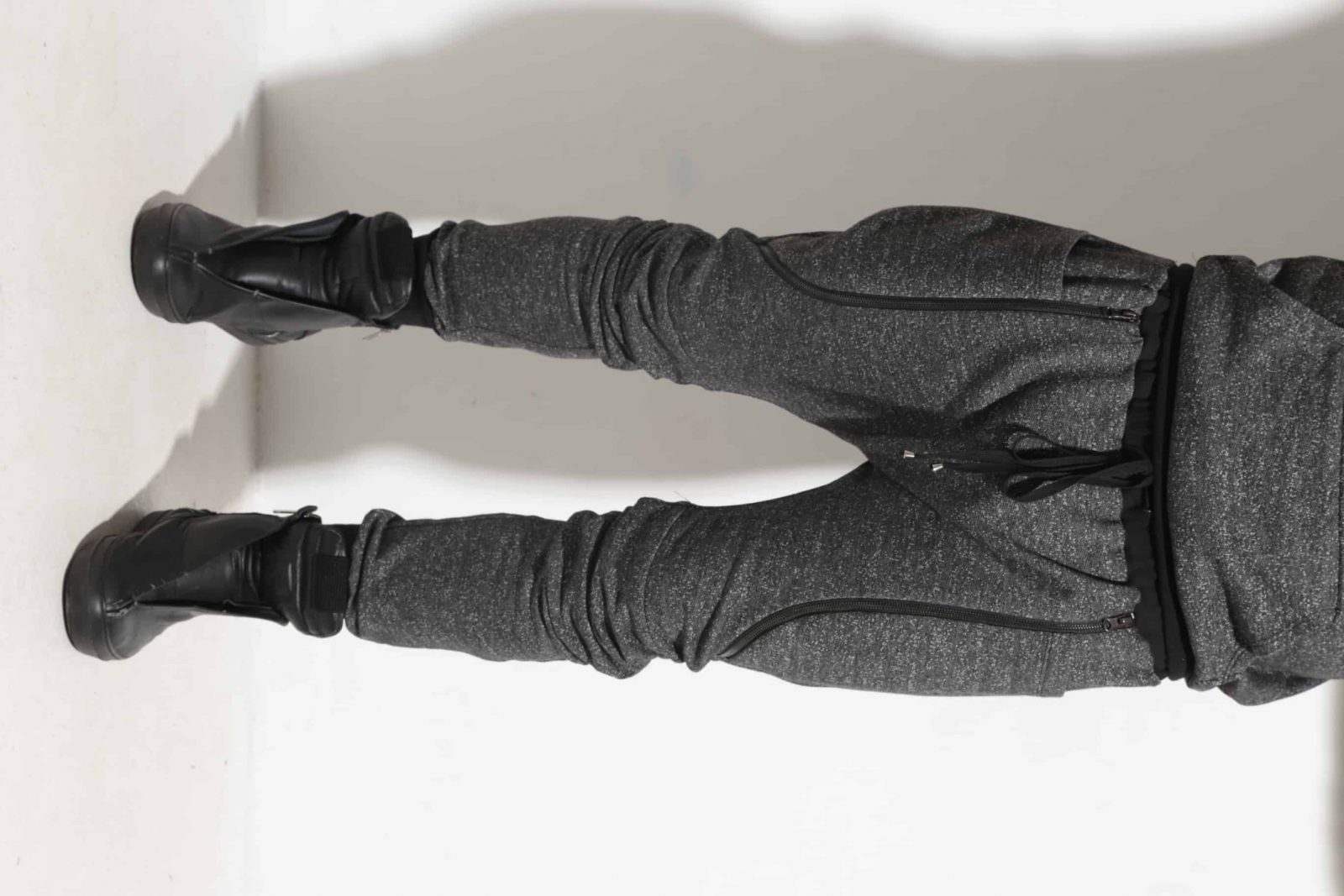 Extravagant men`s pants made of thick elastic fabric with hand-painted details and elasticated waistband at the bottom of the legs.