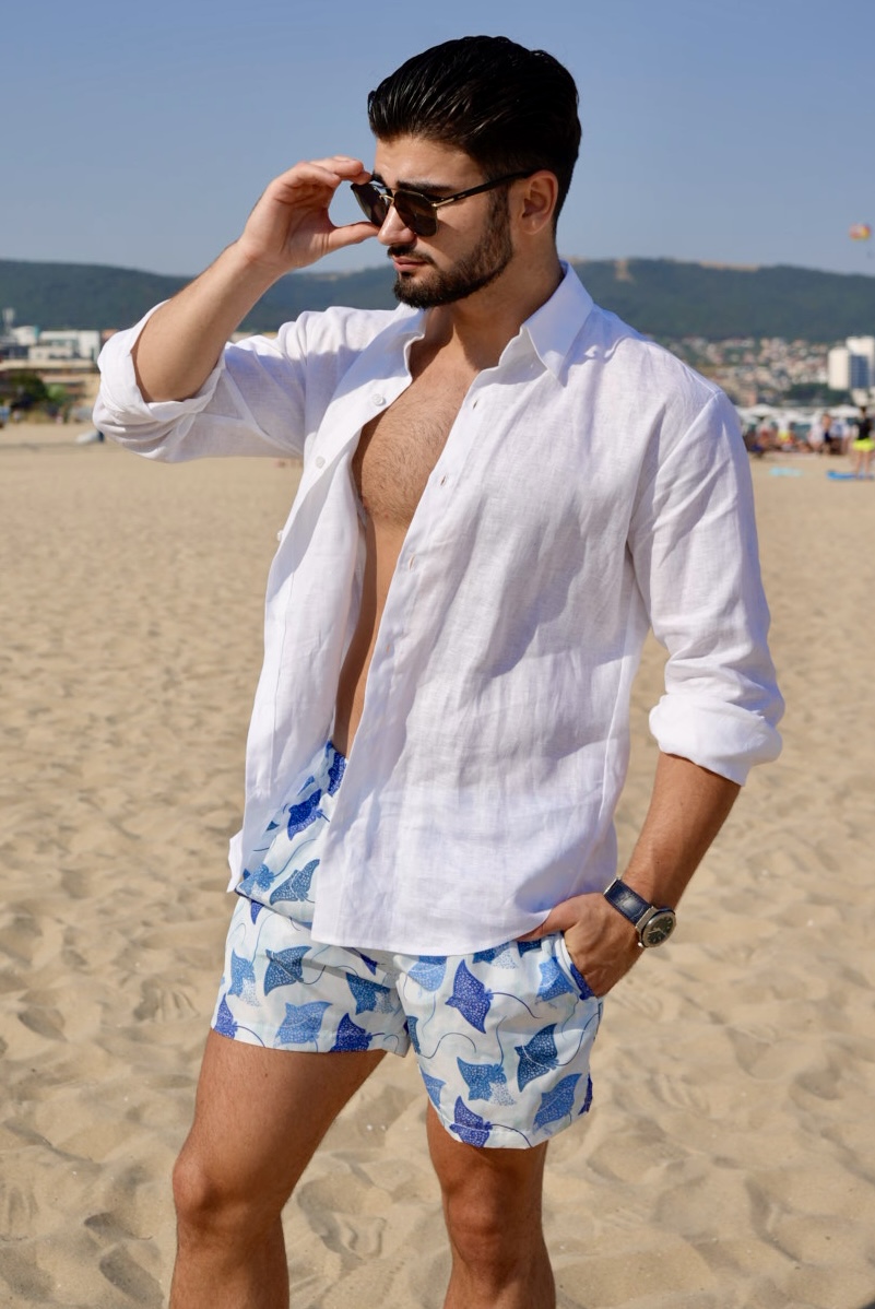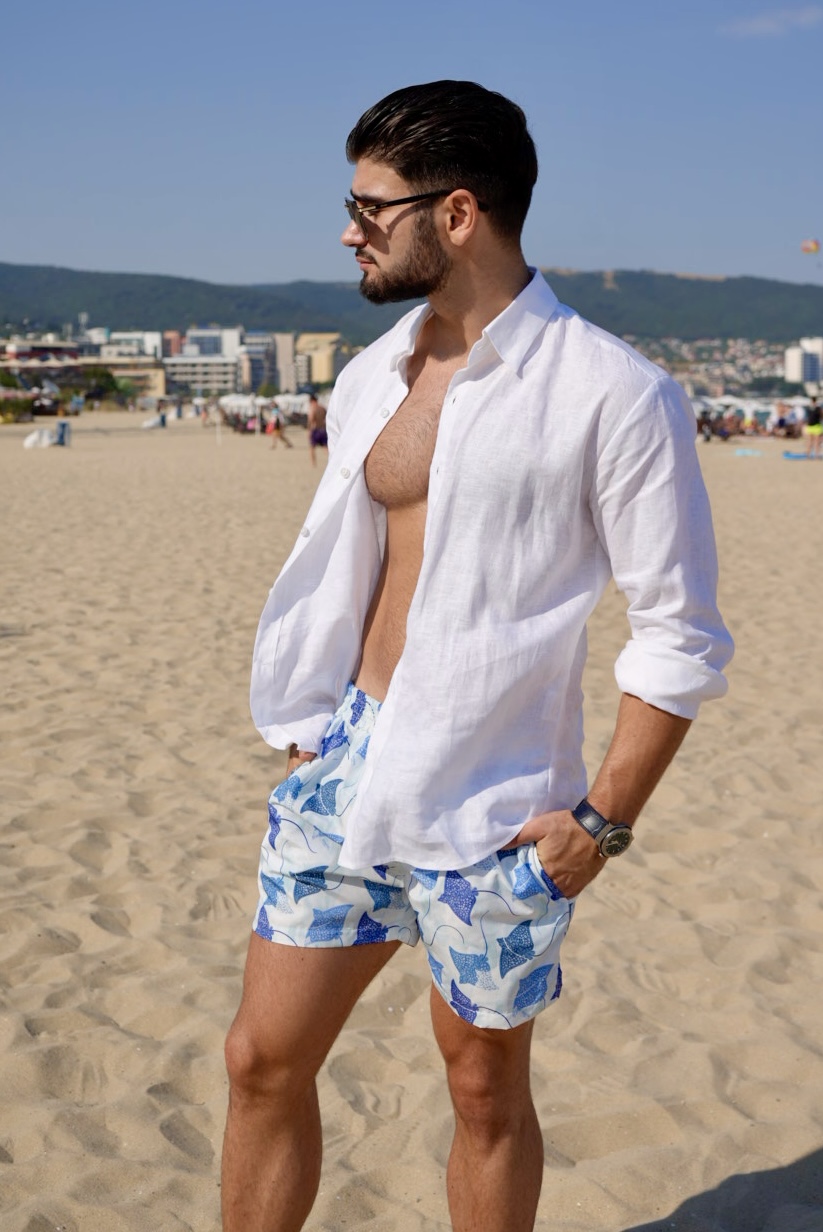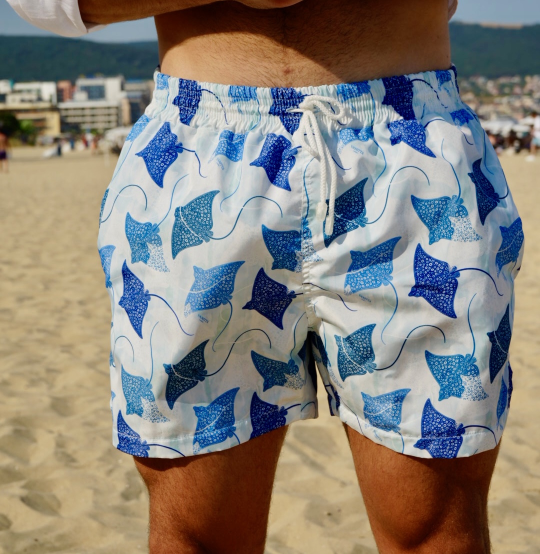 Lightweight and quick-drying swimsuit with a nautical pattern of blue rays. Elastic waistband with drawstring, mesh lining and side pockets – perfect for the beach and pool.