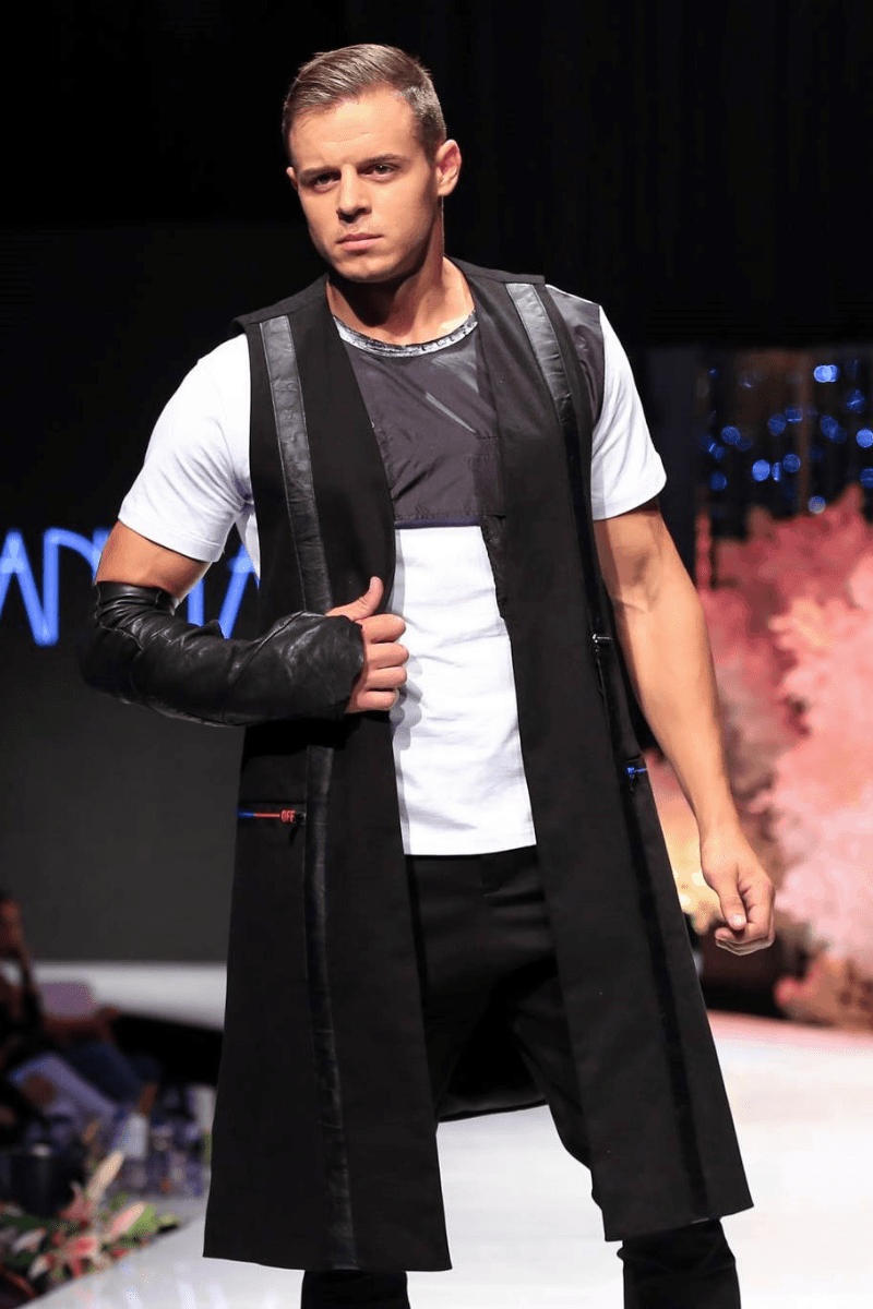 Casual men’s trousers made of thick cotton fabric with striking exterior pockets and zippers with rubberized surface. The model has a lacing rib on the waist and at the bottom of the legs.