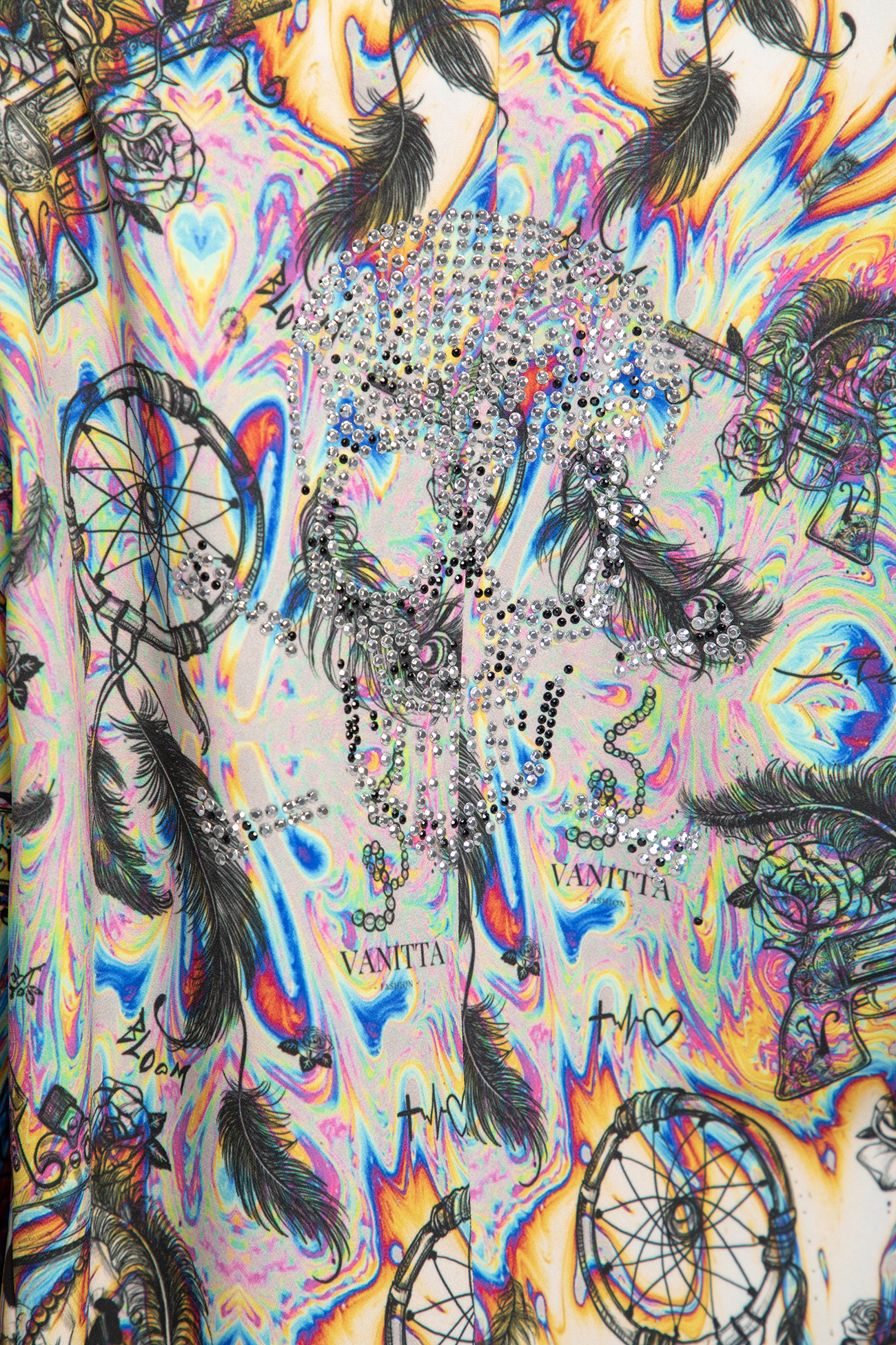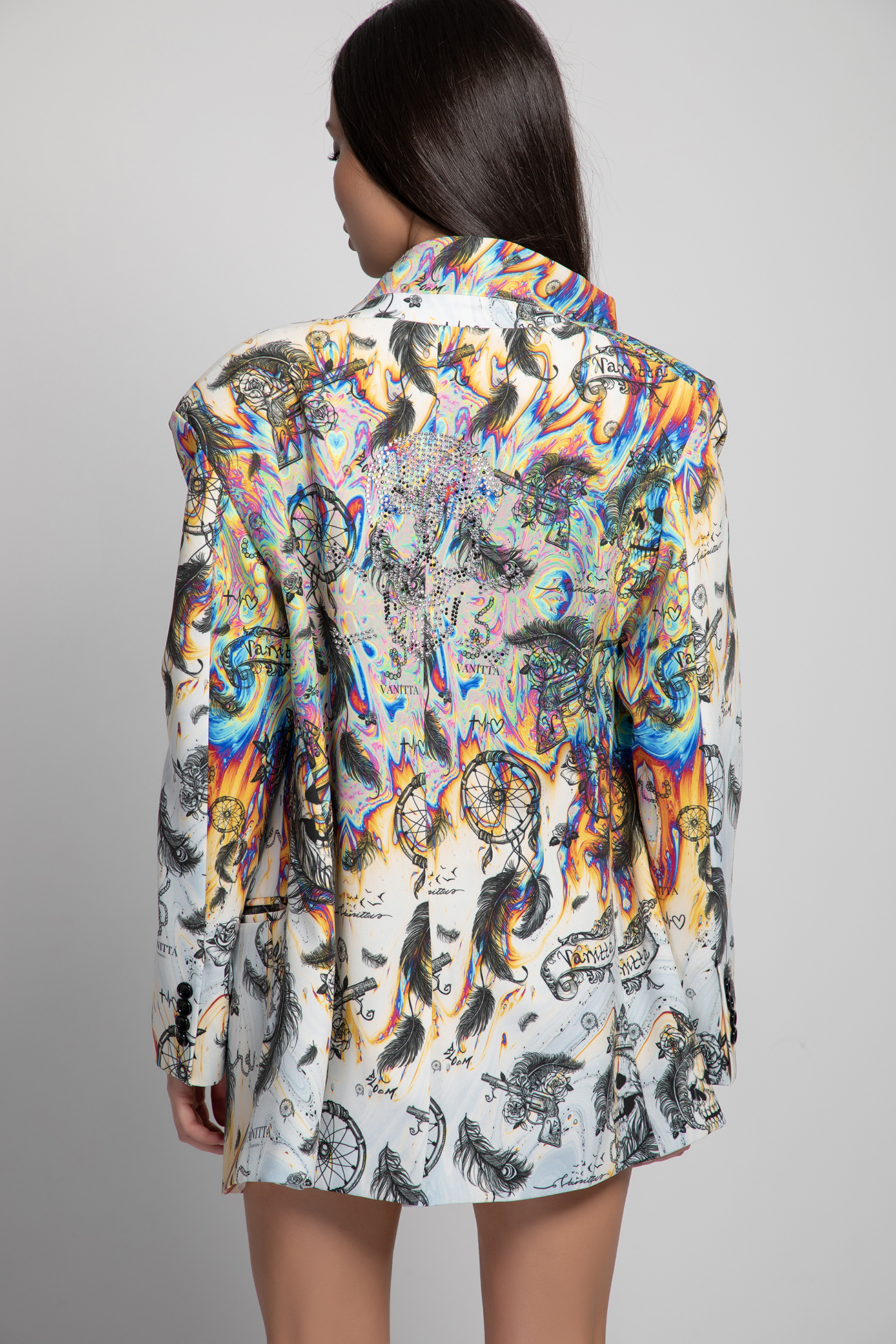 An incredible women’s “oversize” type jacket, made of a rich author’s pattern and appliqué with stones on the back. The product has a classic cut, a straight silhouette with pockets.