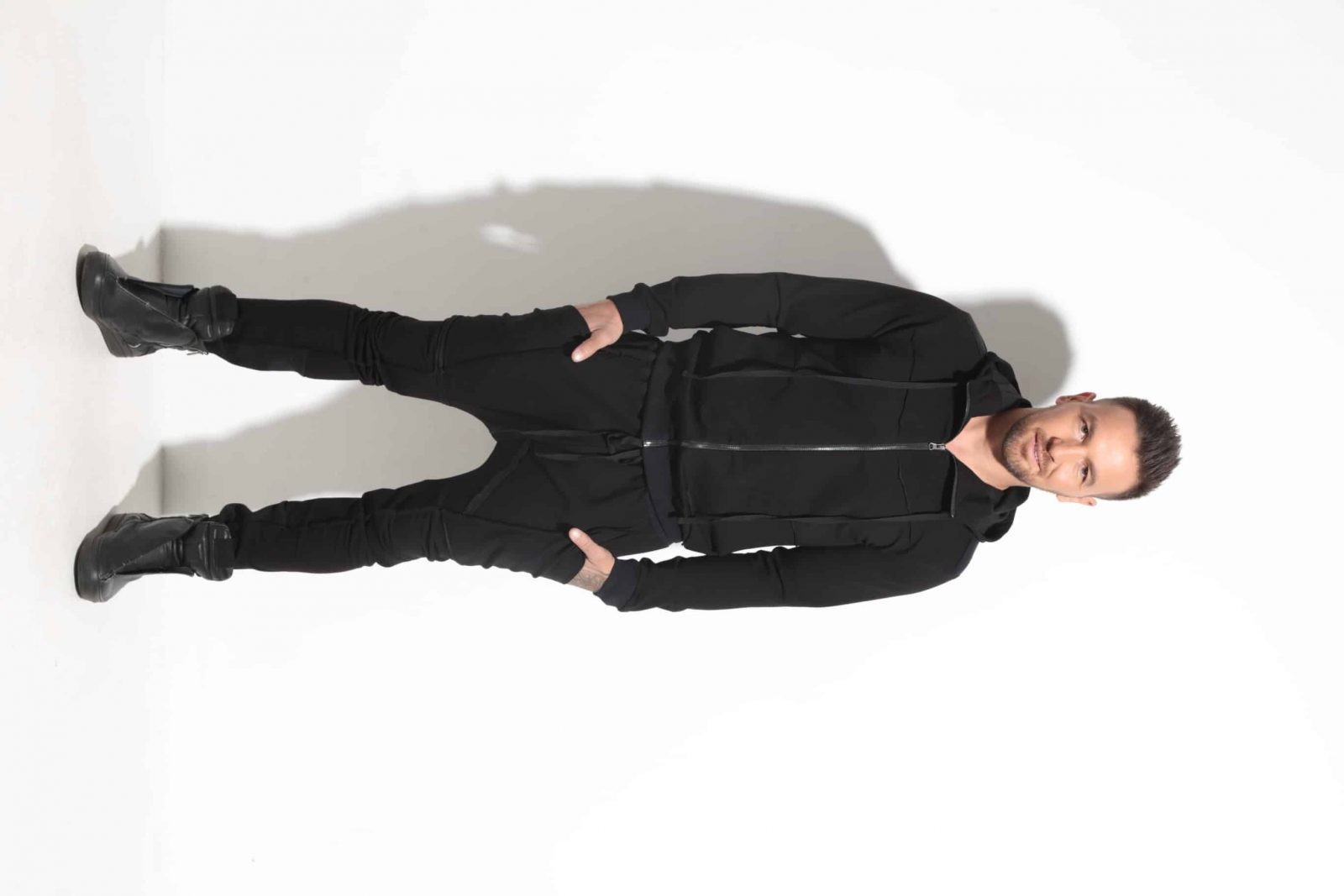 Sport-elegant men’s set made of elastic embossed fabric with leather details. It consists of trousers and a blouse with leather details and spectacular zippers.