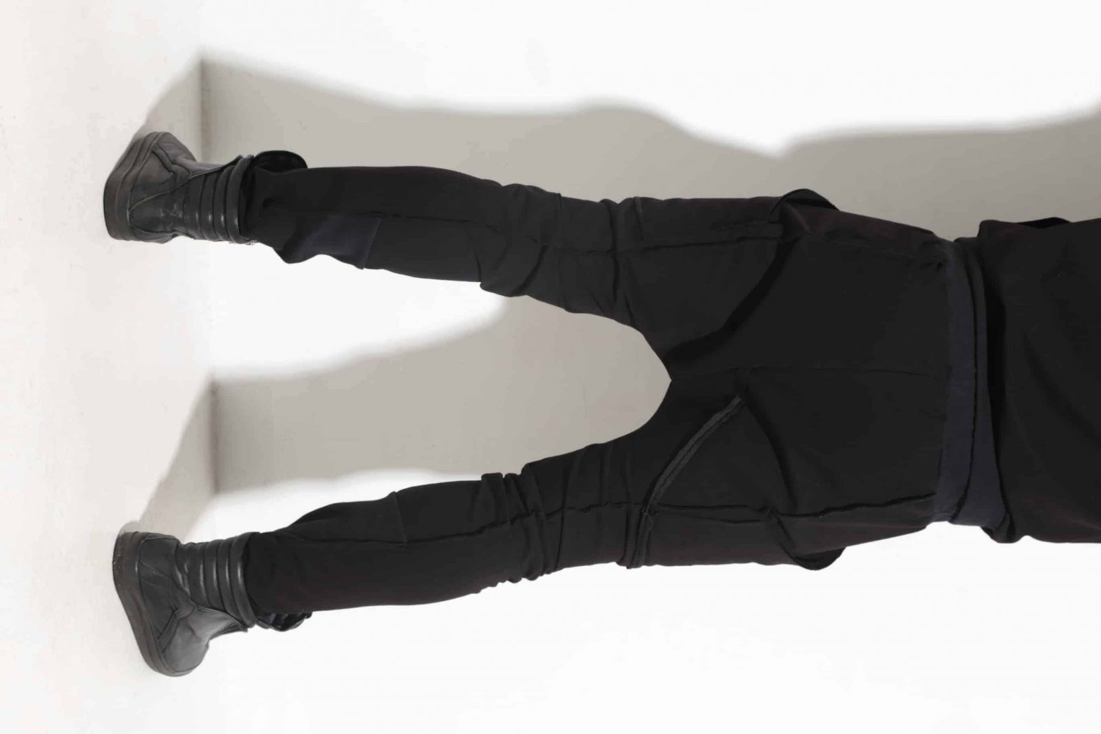 Asymmetrical shorts combined with spectacular socks. Extravagant model made of interesting fabrics with spectacular details.