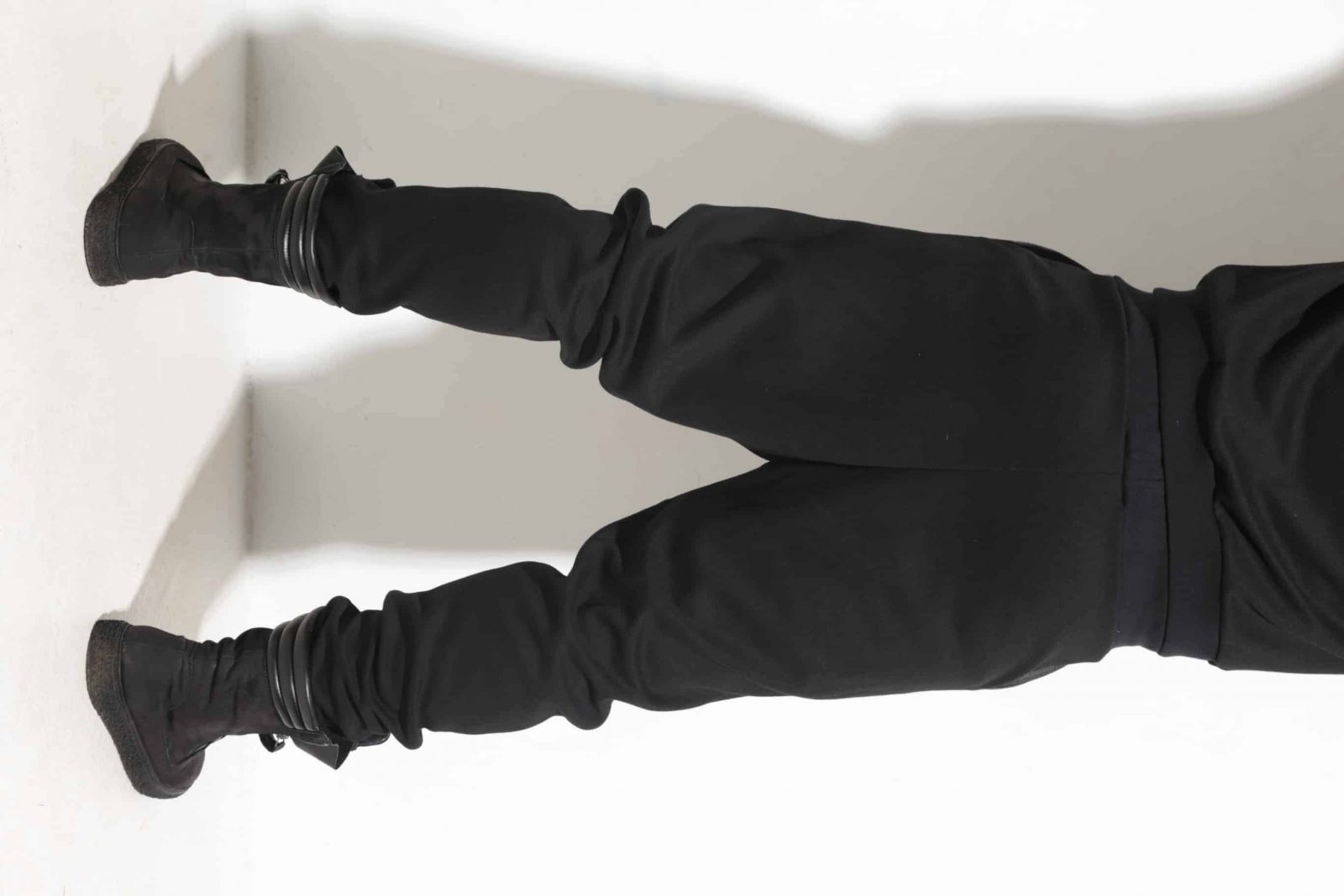 Asymmetrical shorts combined with spectacular socks. Extravagant model made of interesting fabrics with spectacular details.