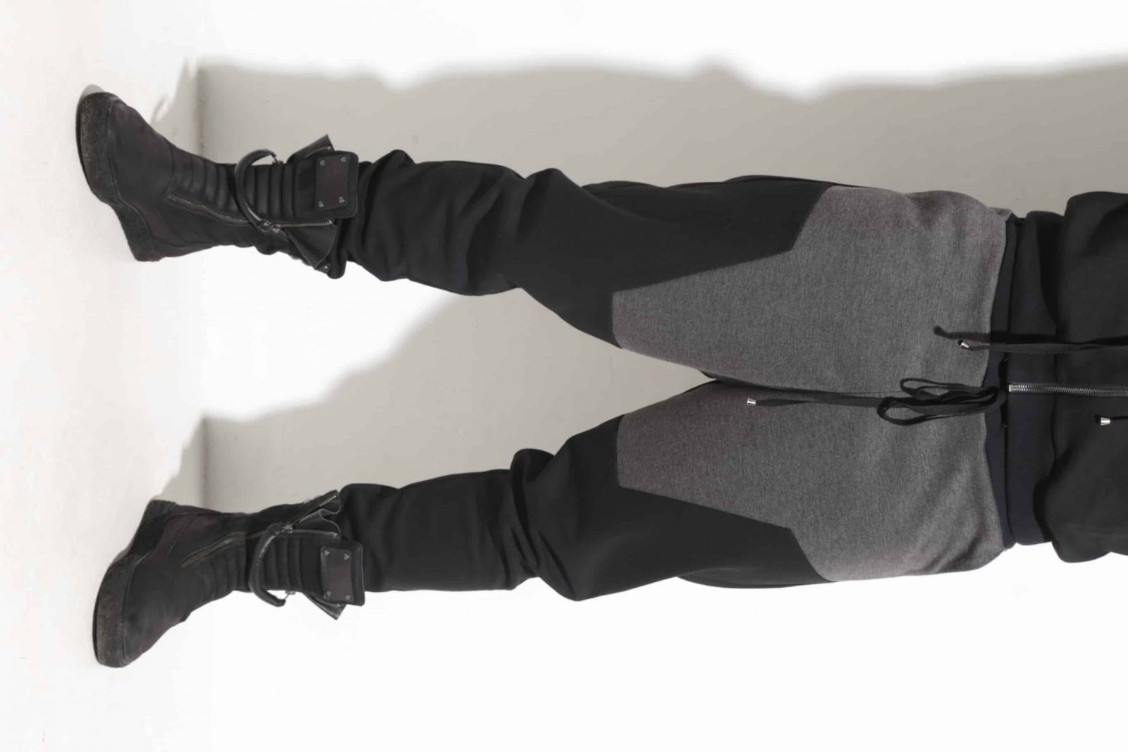 Sporty men’s set made of thick elastic fabric. Pants with waist and waistband and hooded sweatshirt with hood and front zip fastening.