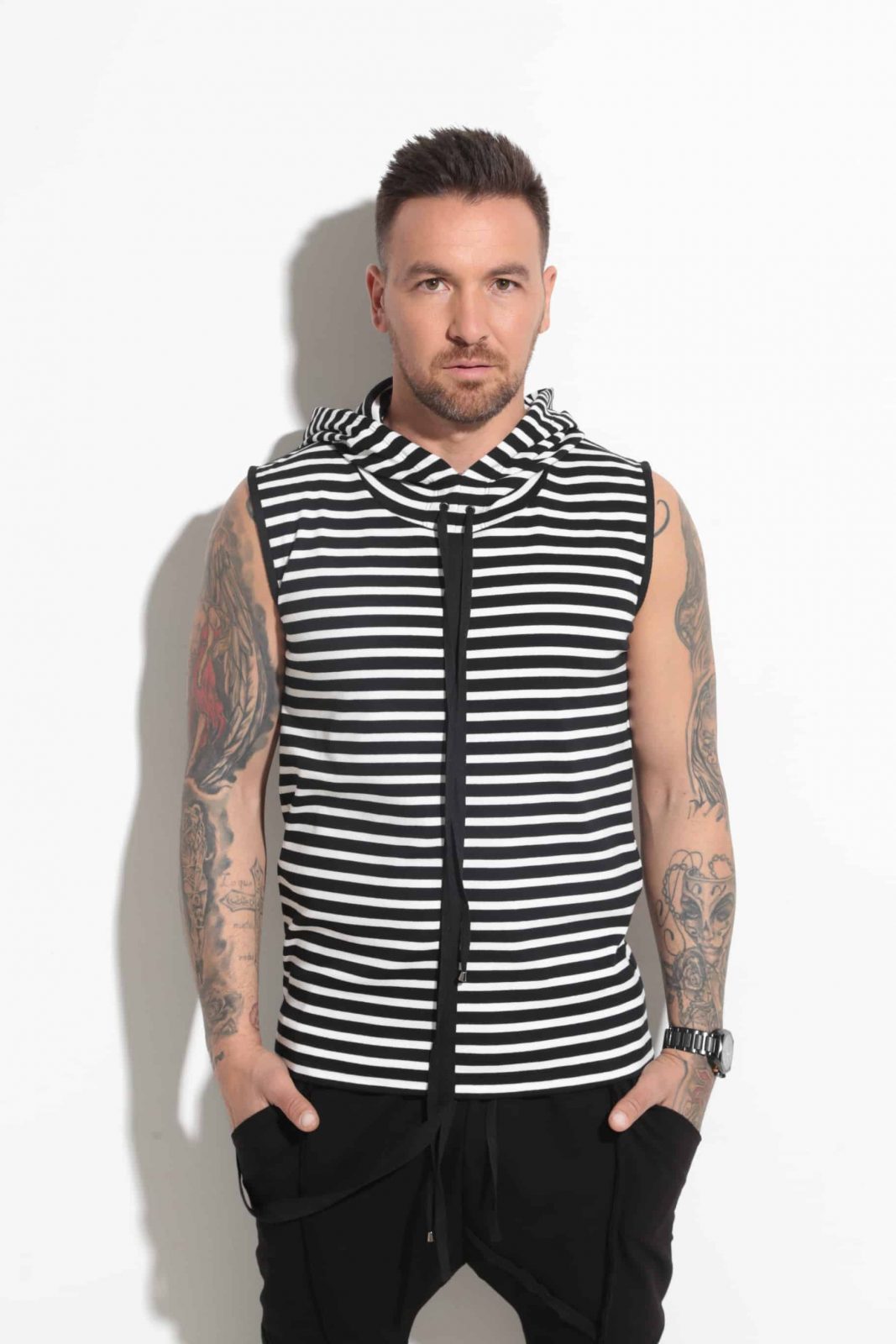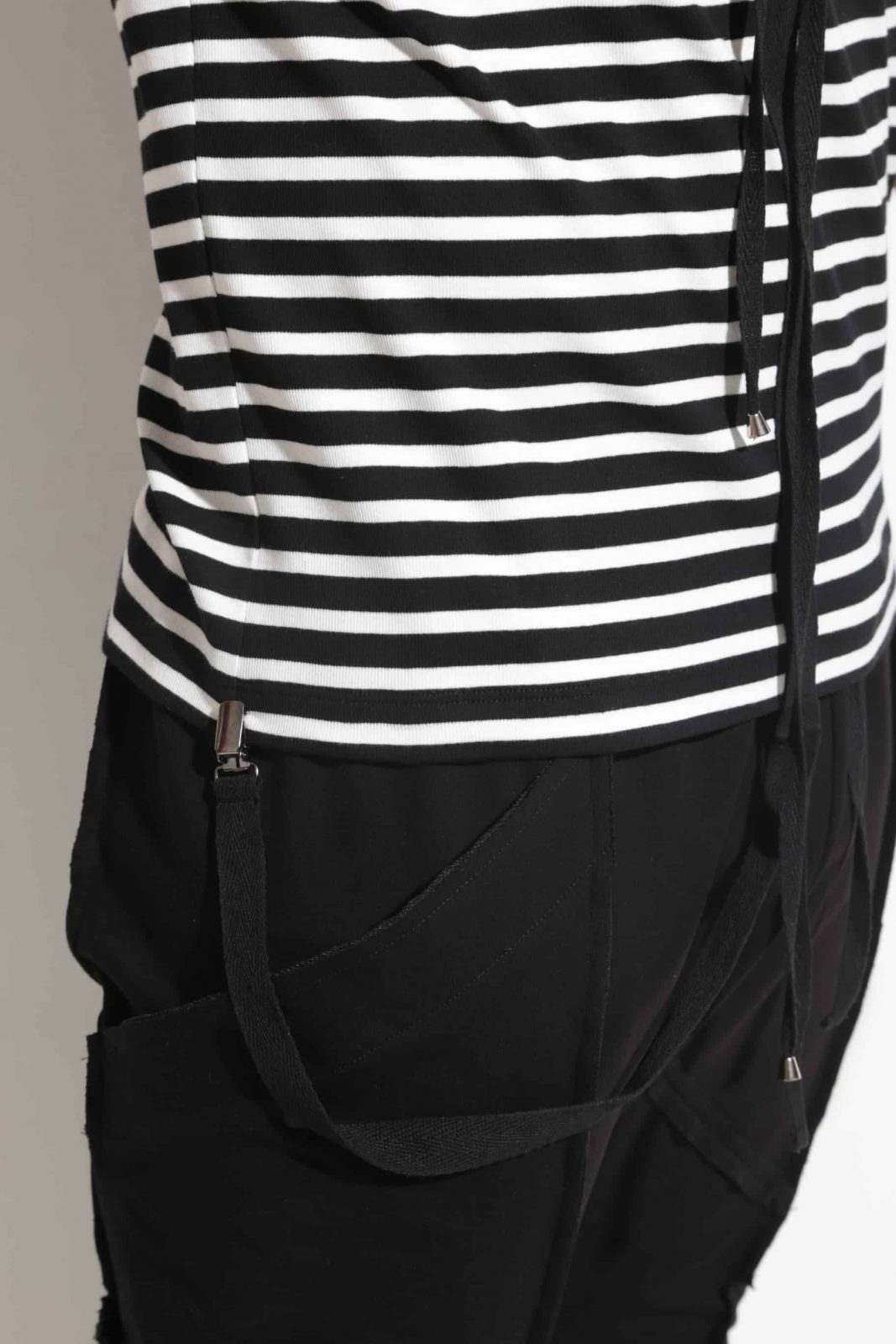Men’s hooded blouse, made of cotton-striped stripe in white and black. The model has a cotton strap that runs through the middle of the front and ends with a buckle that can be attached to different edges of the blouse.