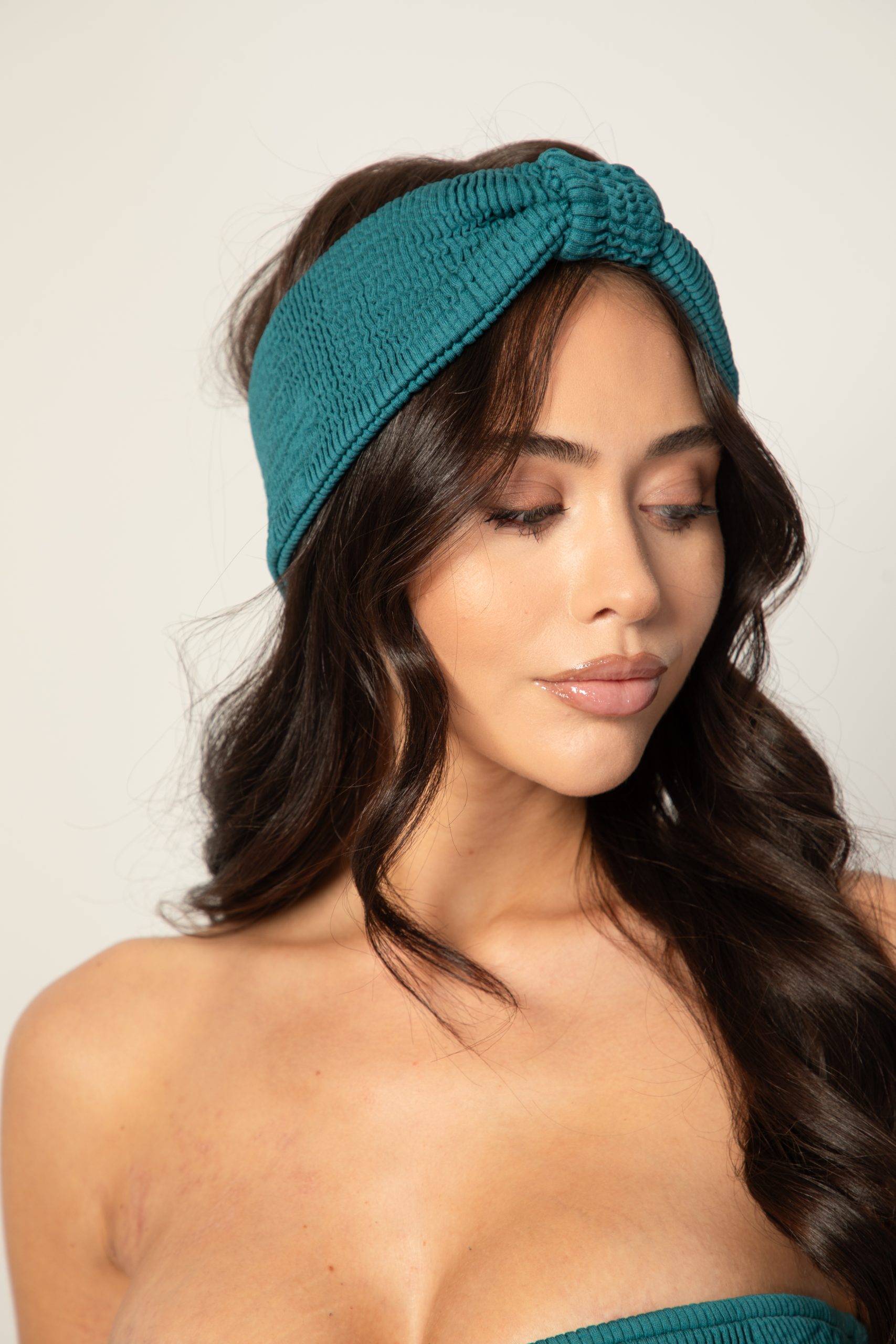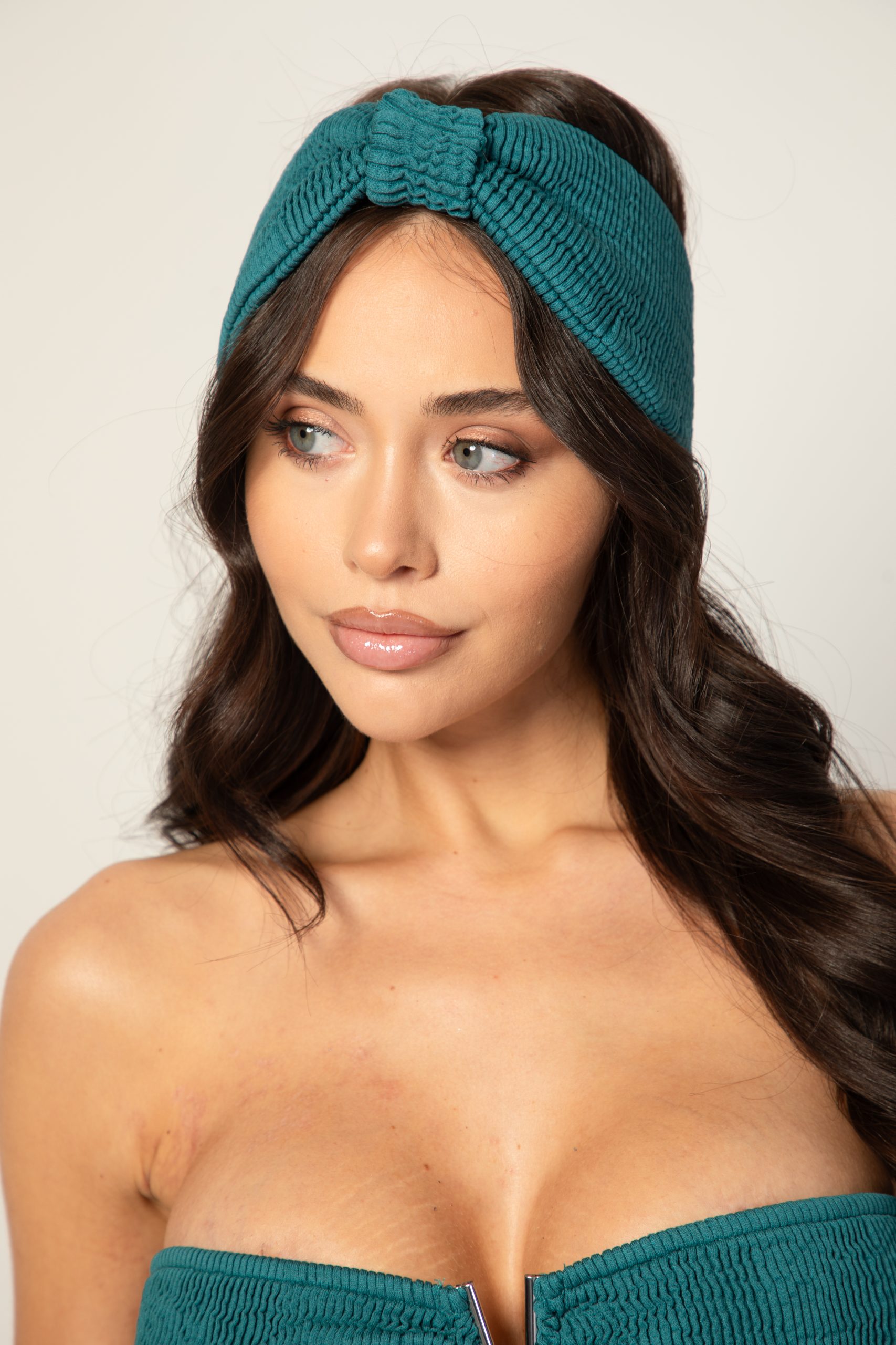 This swimsuit made of corrugated fabric hugs the body and emphasizes the shapes with a feminine V-cut and you can combine it with a stylish headband.