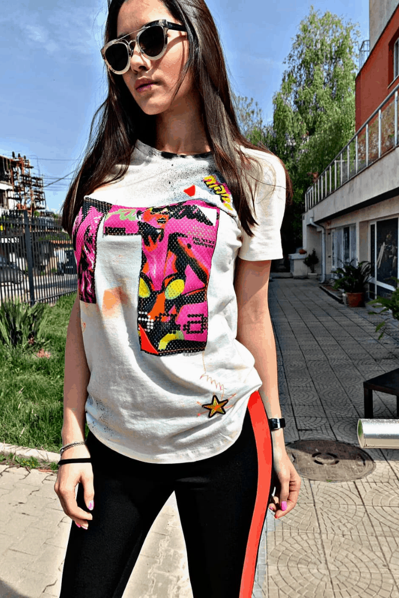 Sport-elegant ladies t-shirt made of cotton jersey with interesting stripes and hand-painted details. Comfortable and stylish, suitable for everyday life.