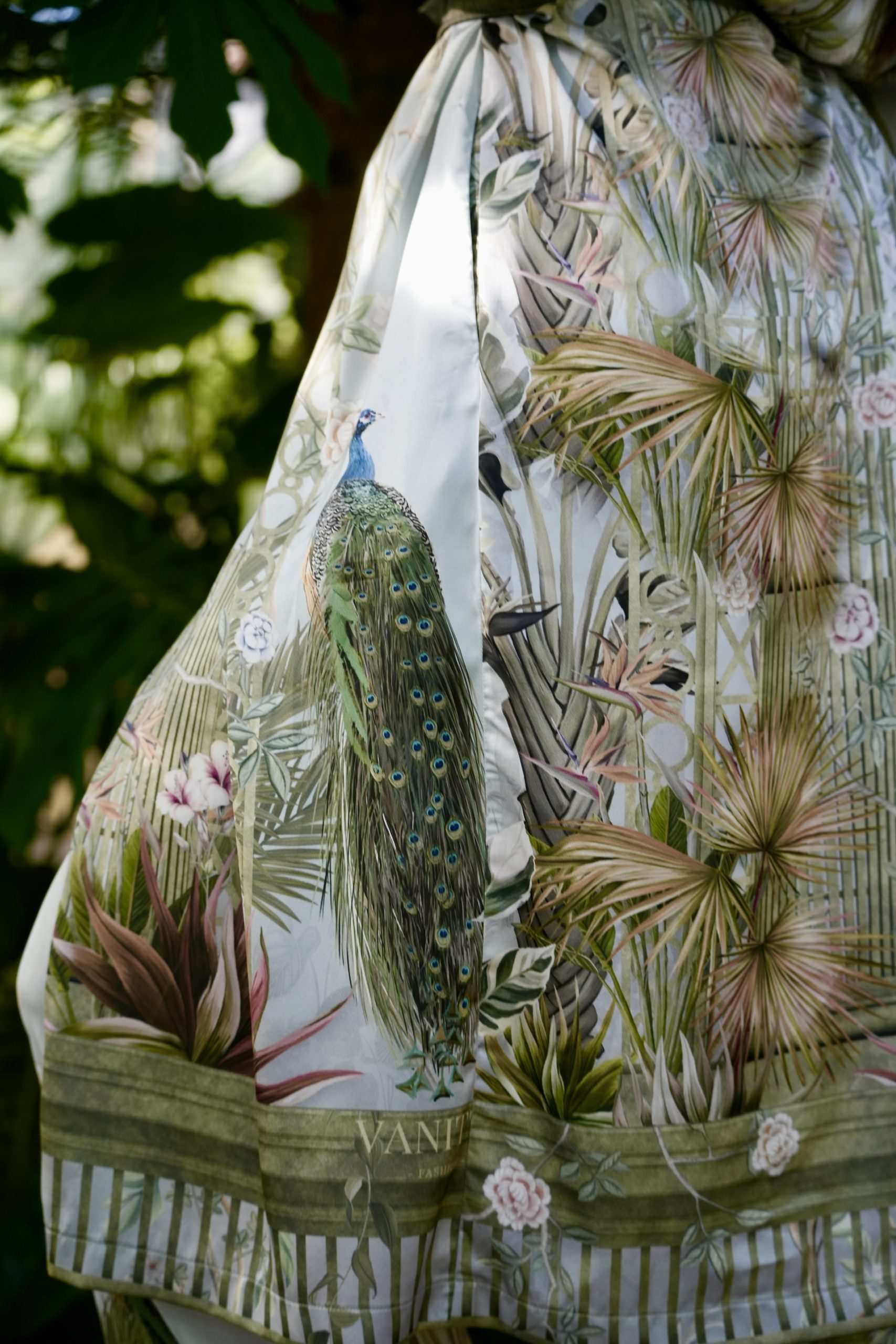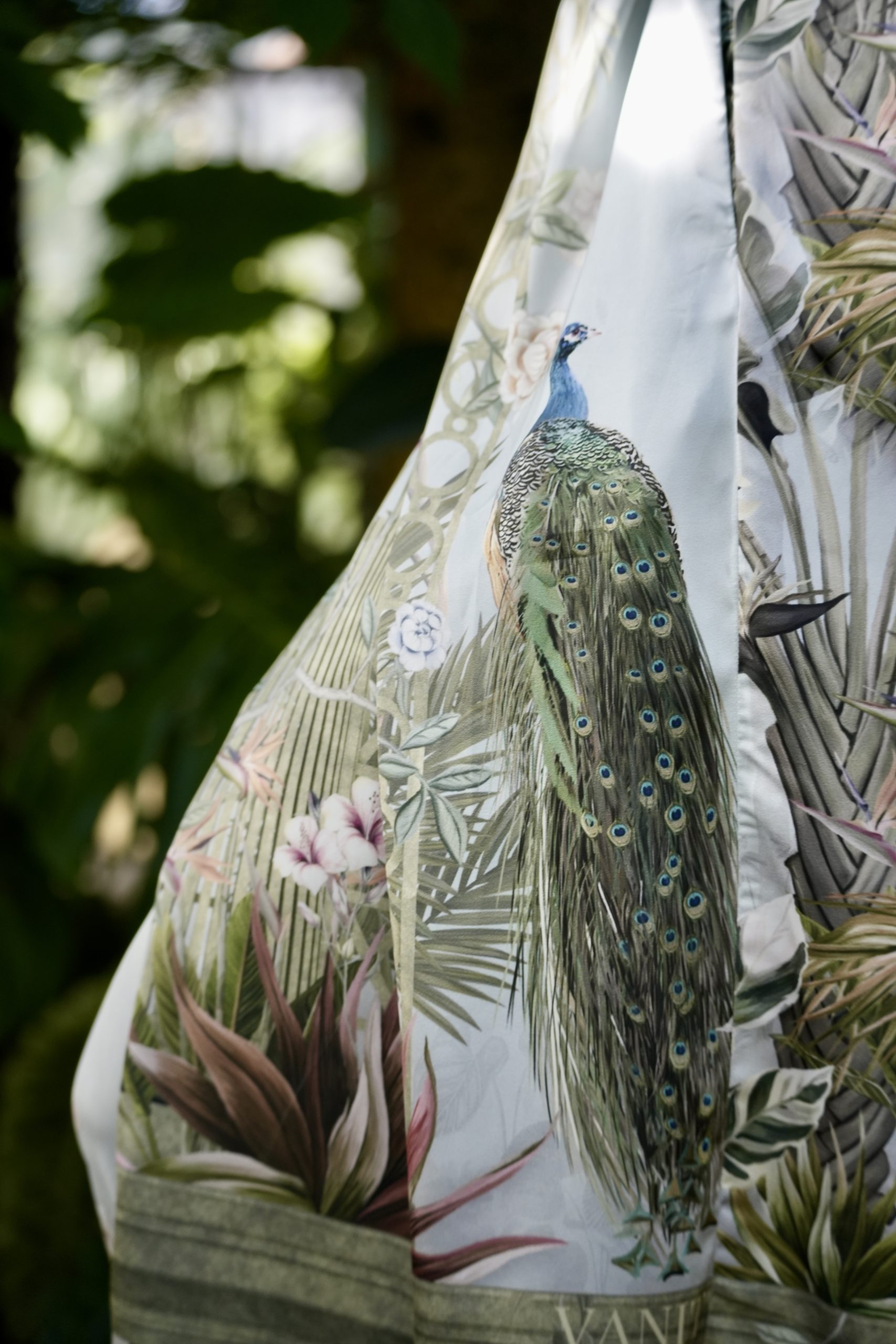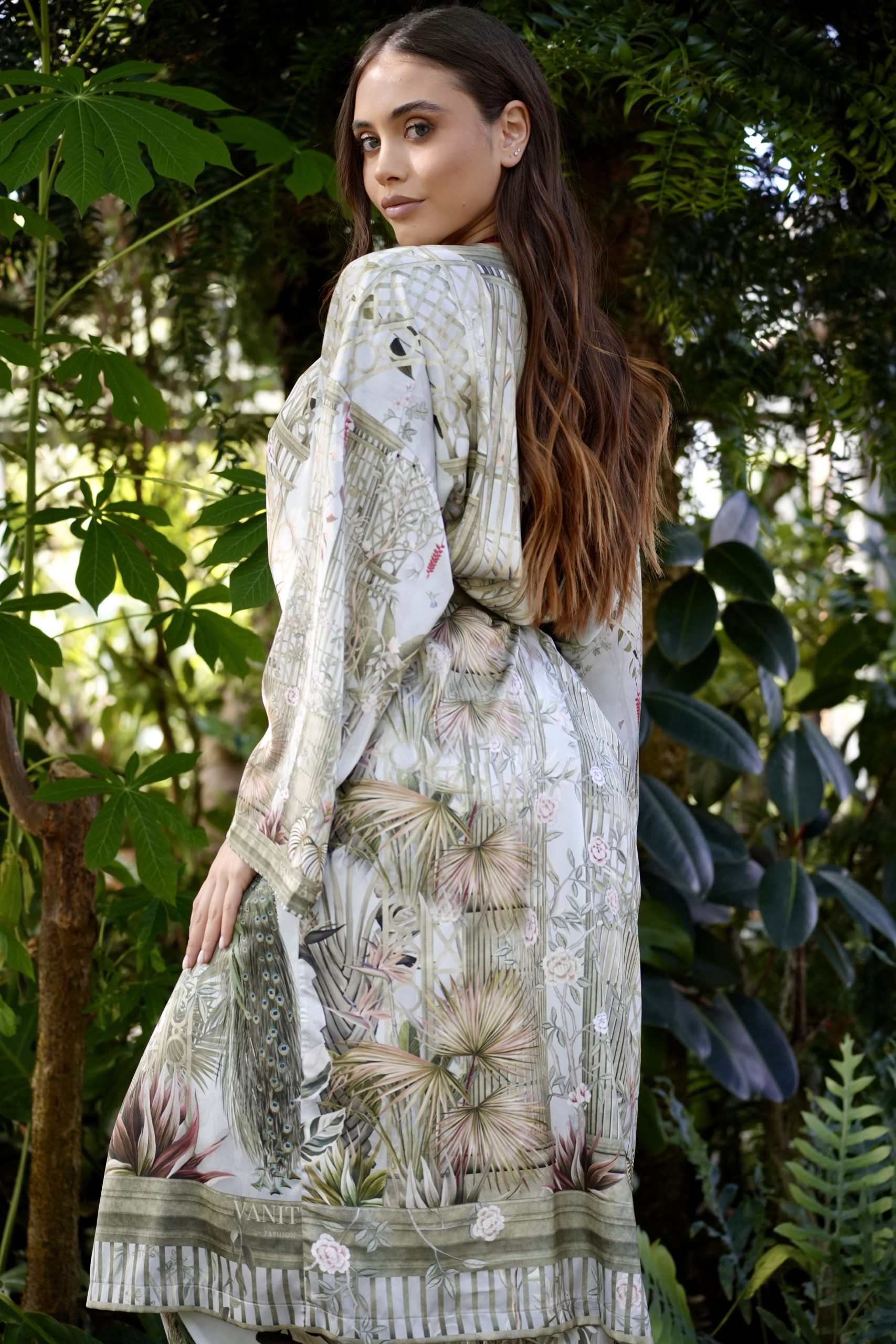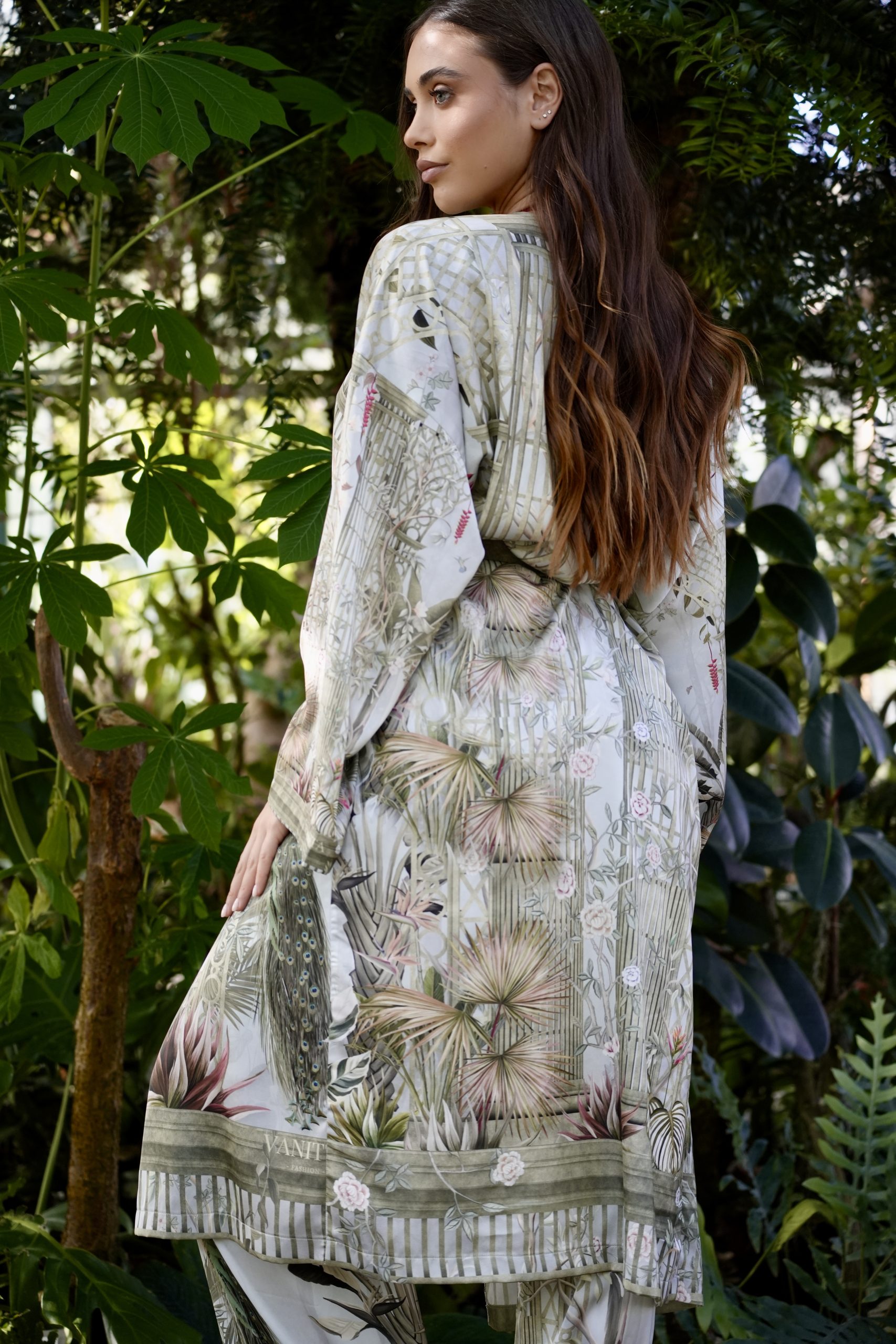 An airy and extremely feminine kimono, created from fine satin with a silky soft touch. The design impresses with an exquisite author’s exotic pattern, inspired by tropical nature – delicate leaves, floral motifs and delicate ornaments, shimmering in a harmonious palette of natural green and sand tones. The free silhouette and wide sleeves give a feeling of lightness and movement, and the belt at the waist allows for stylish shaping of the figure. A perfect addition to the beach look – sophisticated, elegant and memorable.