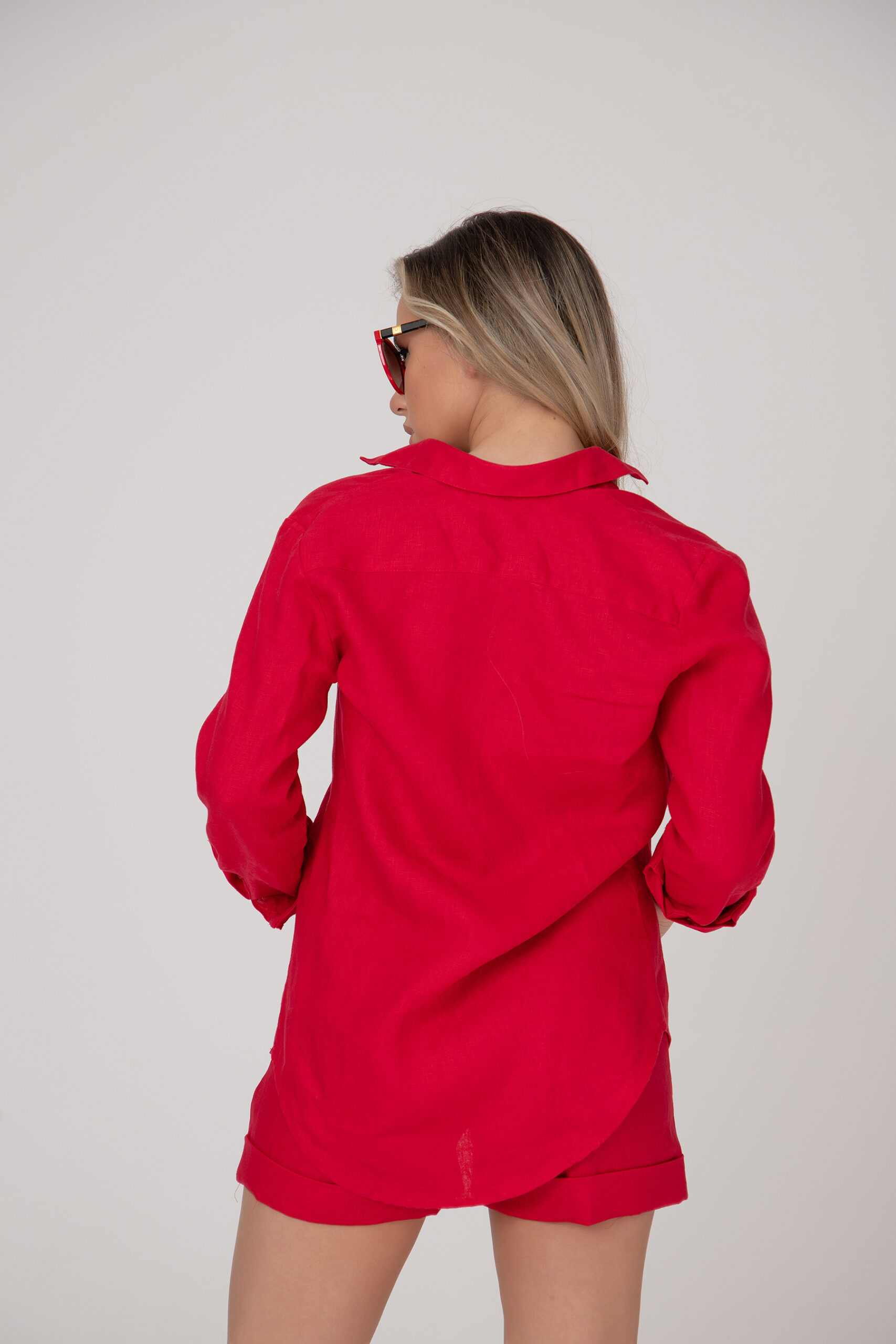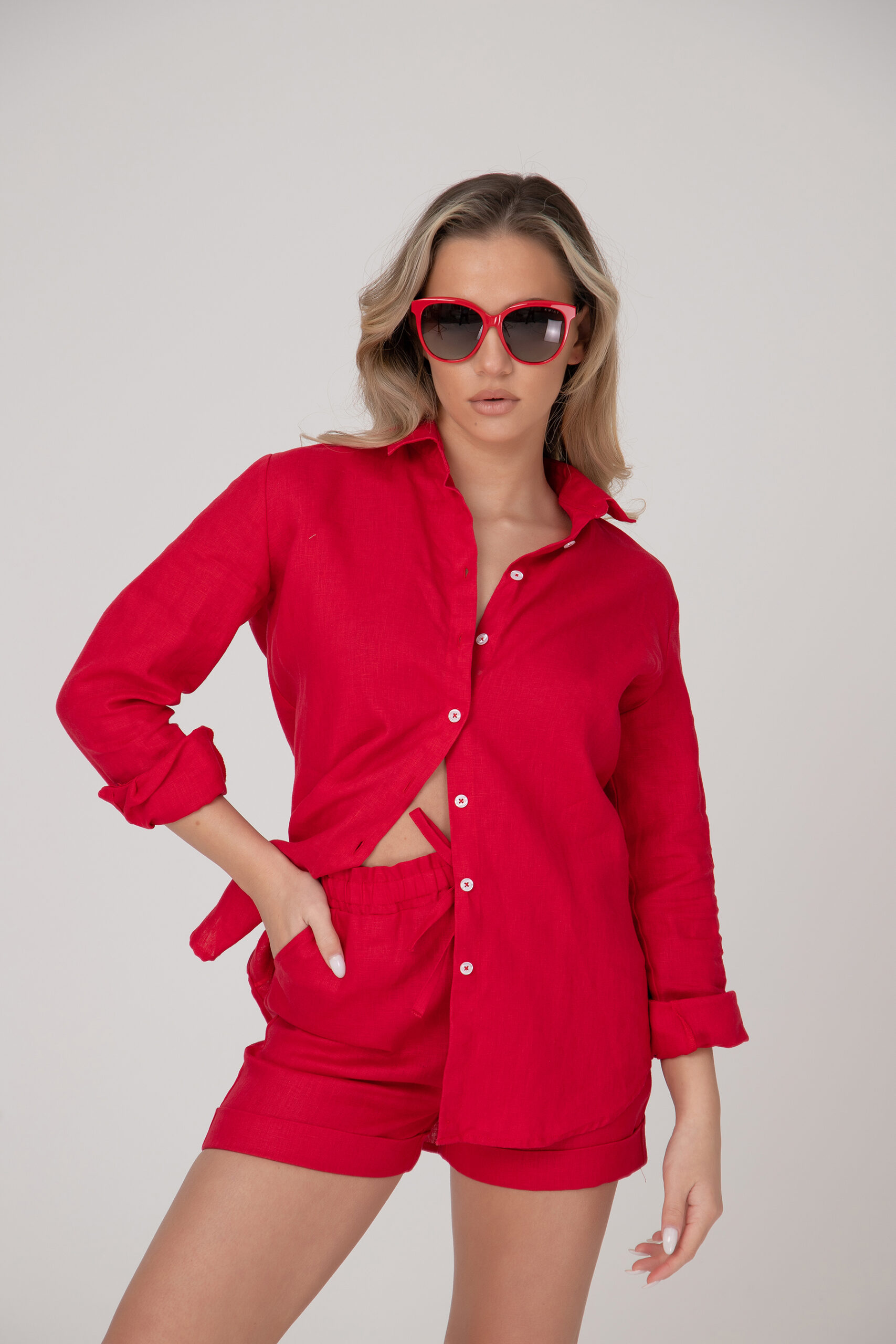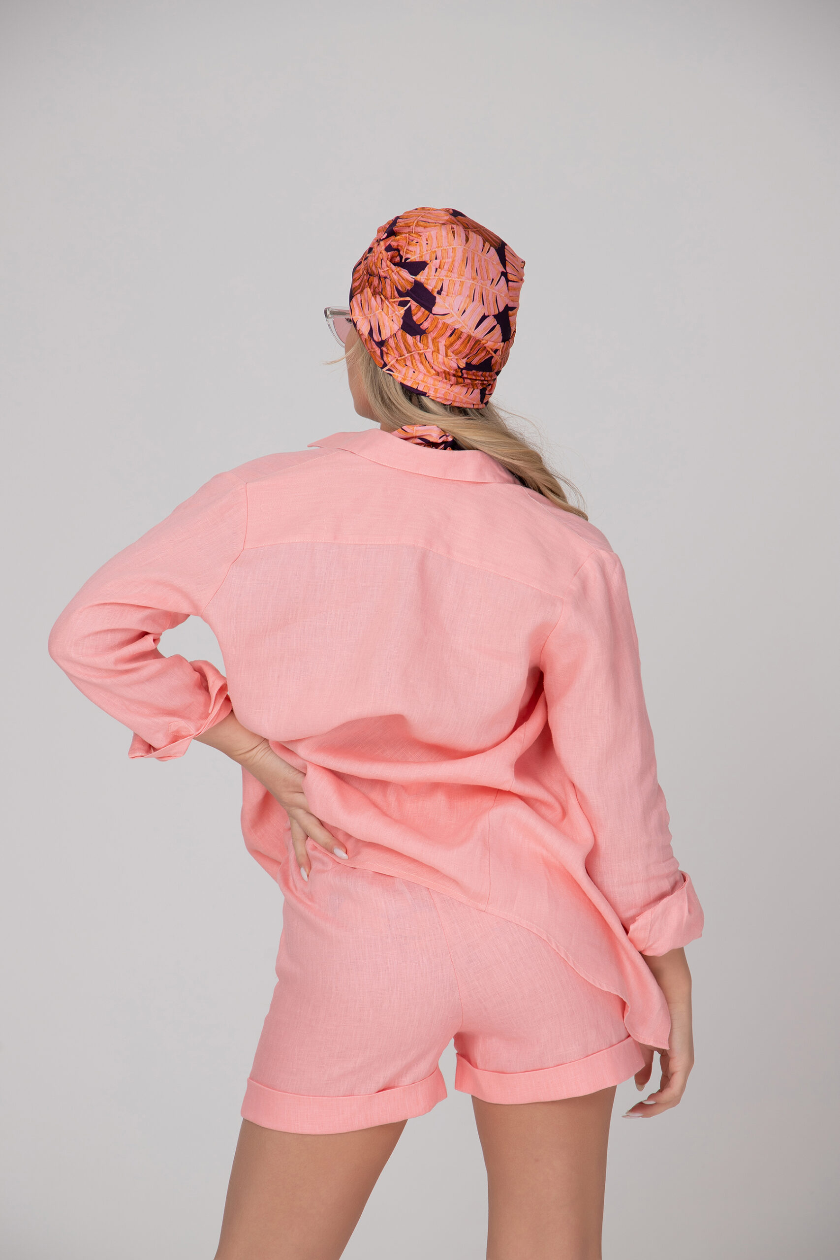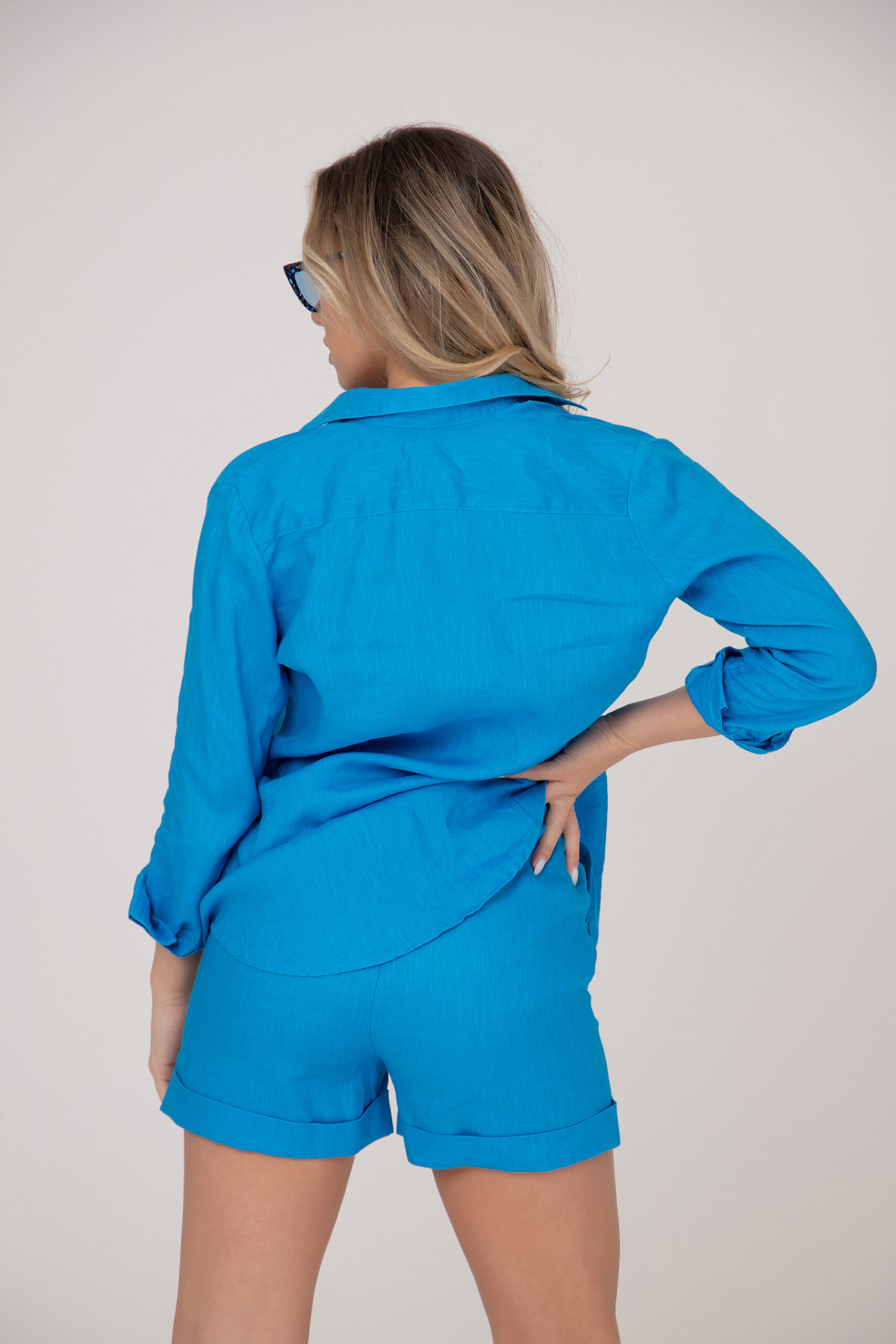 Women’s linen set in two parts. Classic shirt with circuit board, straight silhouette and shorts with elastic waist.