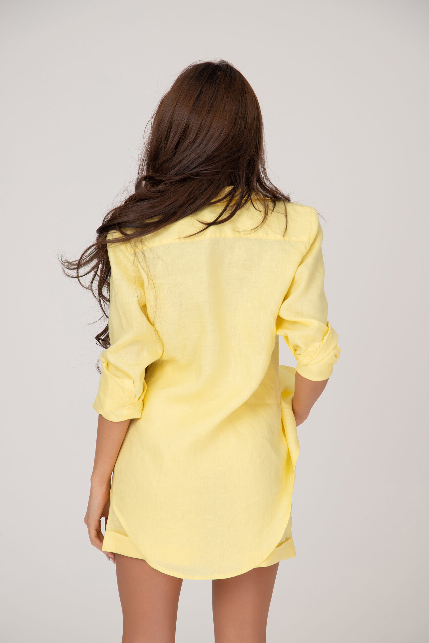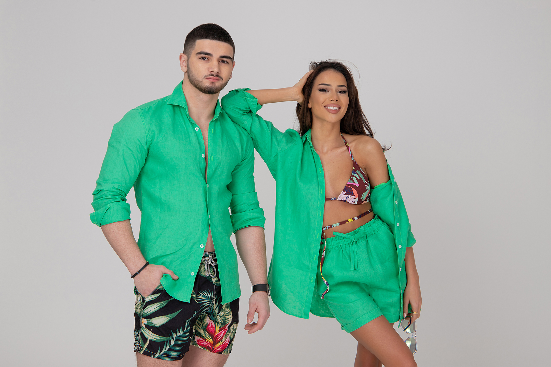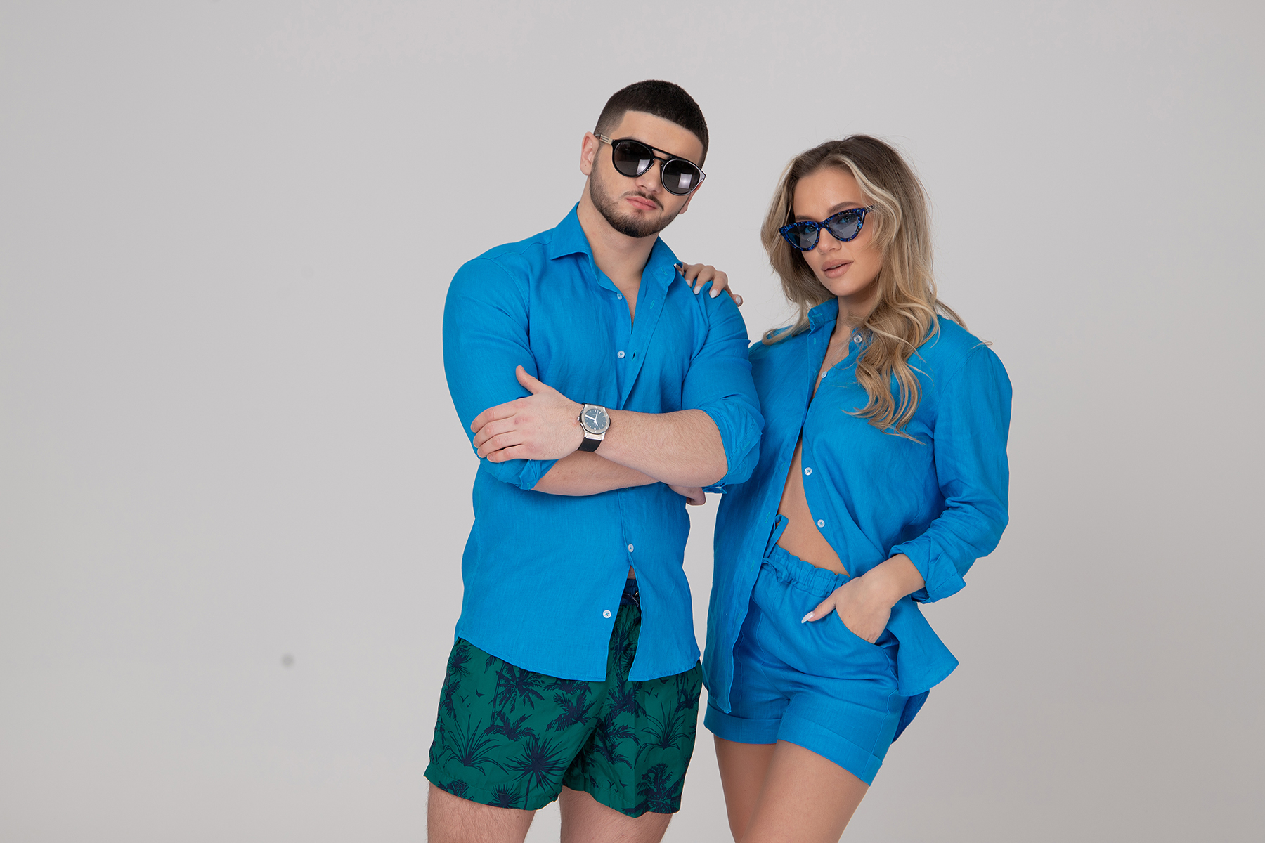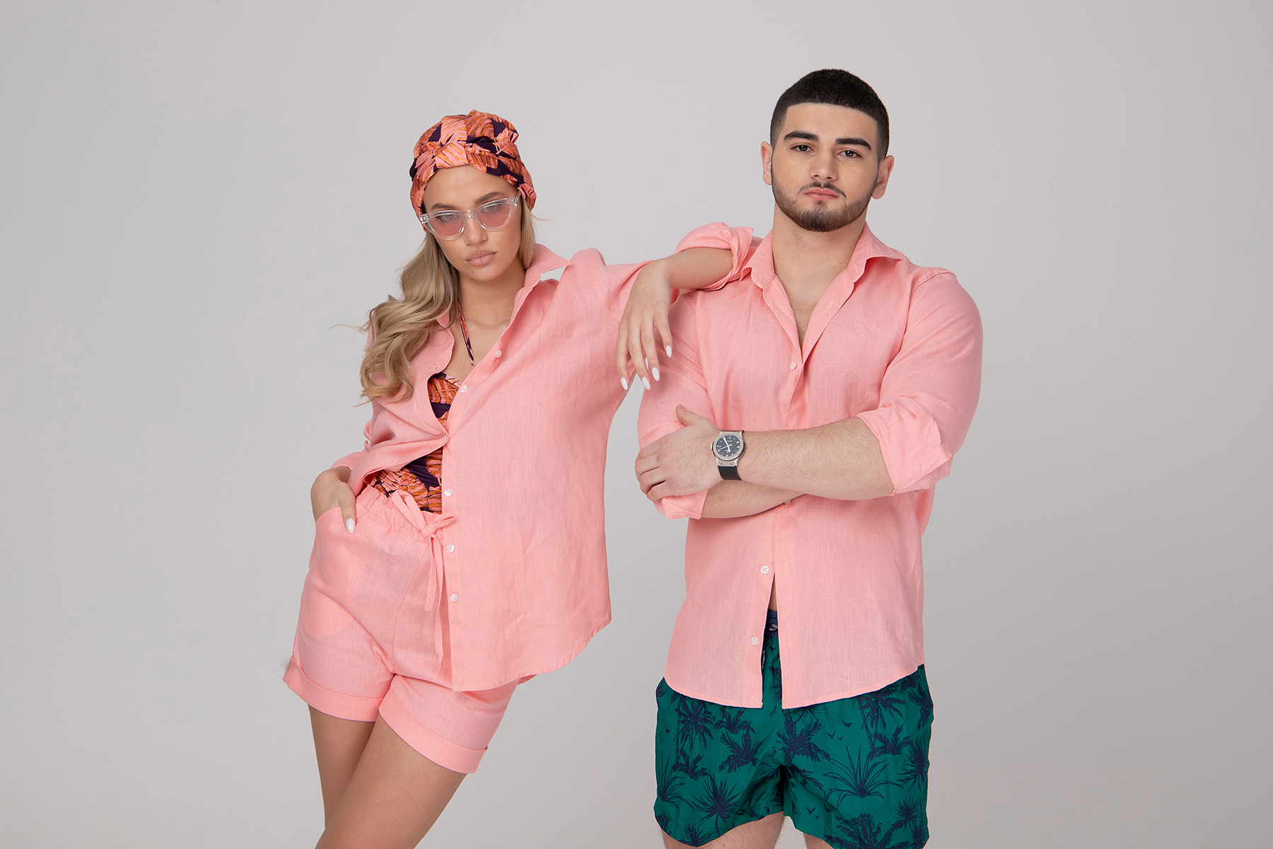 Women’s linen set in two parts. Classic shirt with circuit board, straight silhouette and shorts with elastic waist.