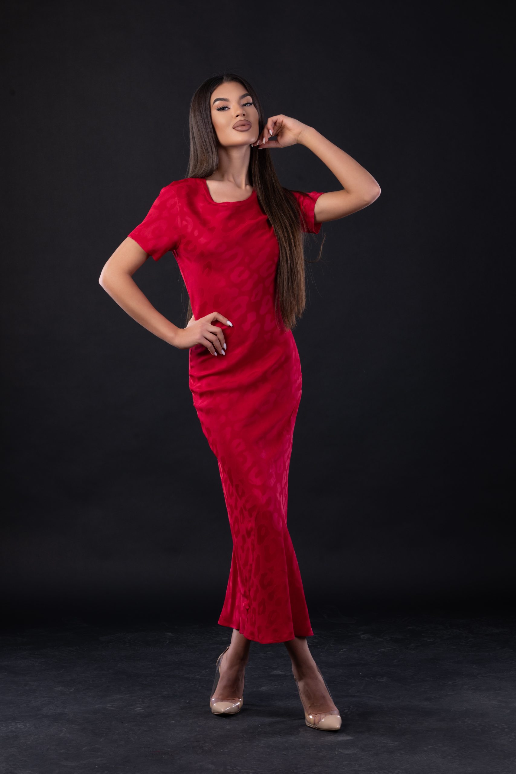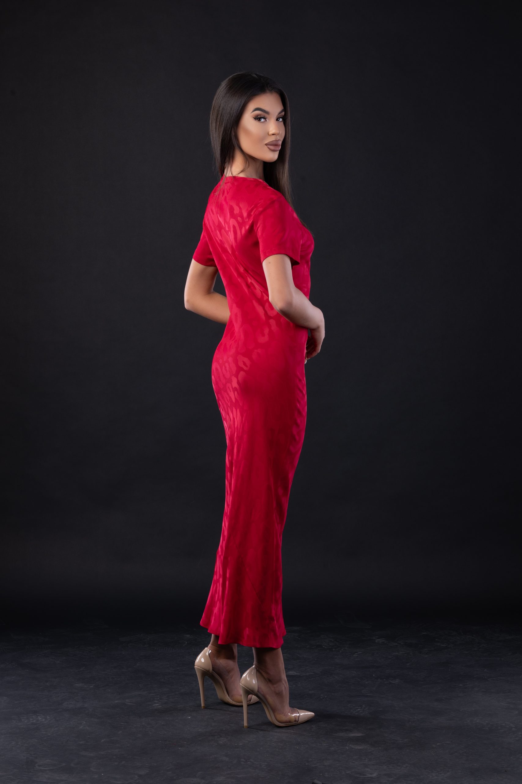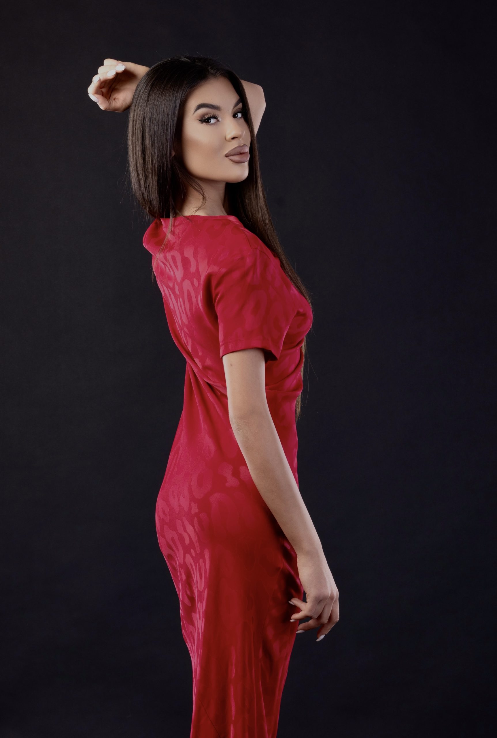 Elegant dress made of satin fabric with an exquisite jacquard animal effect, woven directly into the fabric for a luxurious embossed look. The texture gently catches the light and emphasizes the feminine silhouette, as the dress falls beautifully and shapes the figure in a natural way. It is suitable for formal events, evening occasions and special moments when you want to impress with elegance and subtle shine.