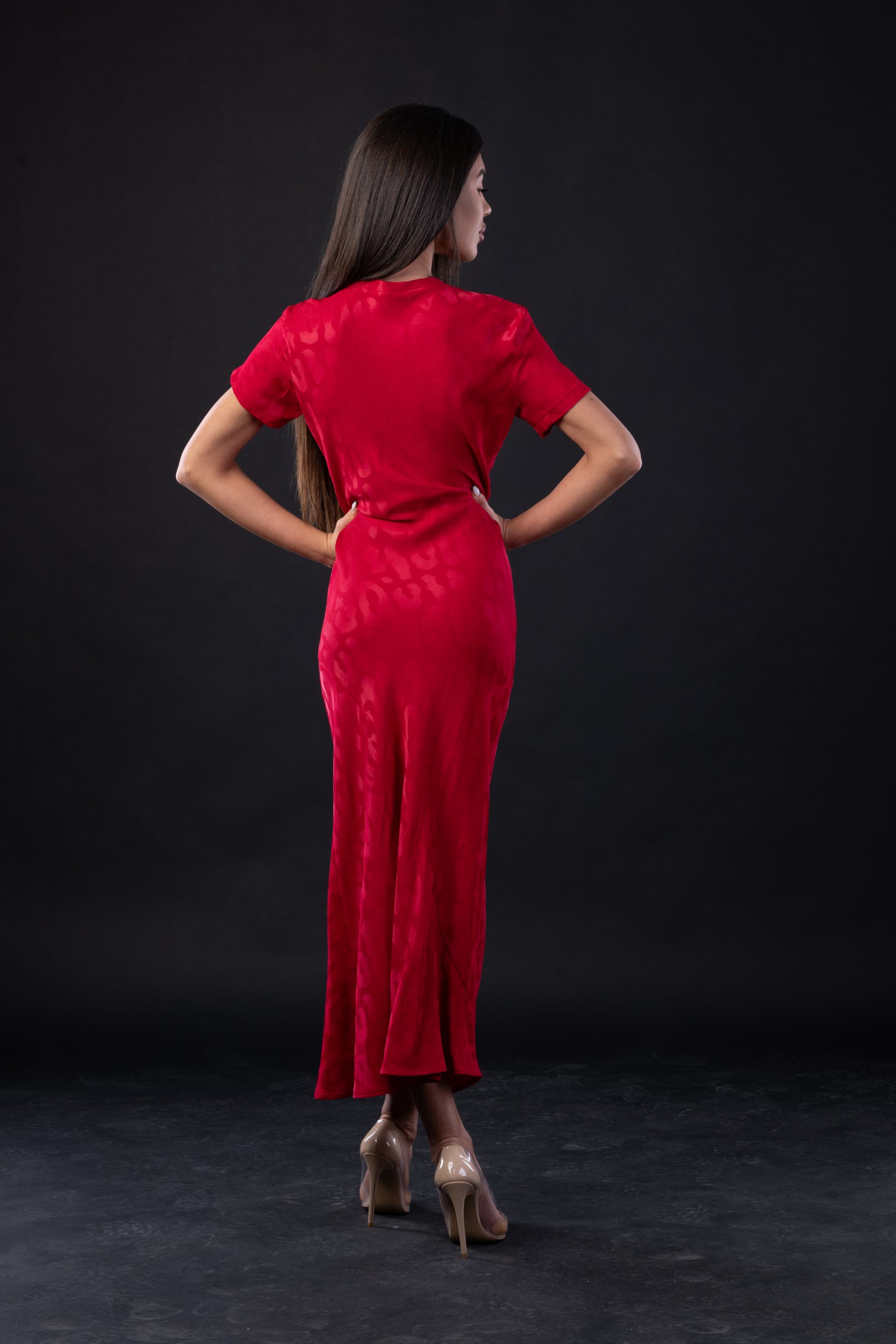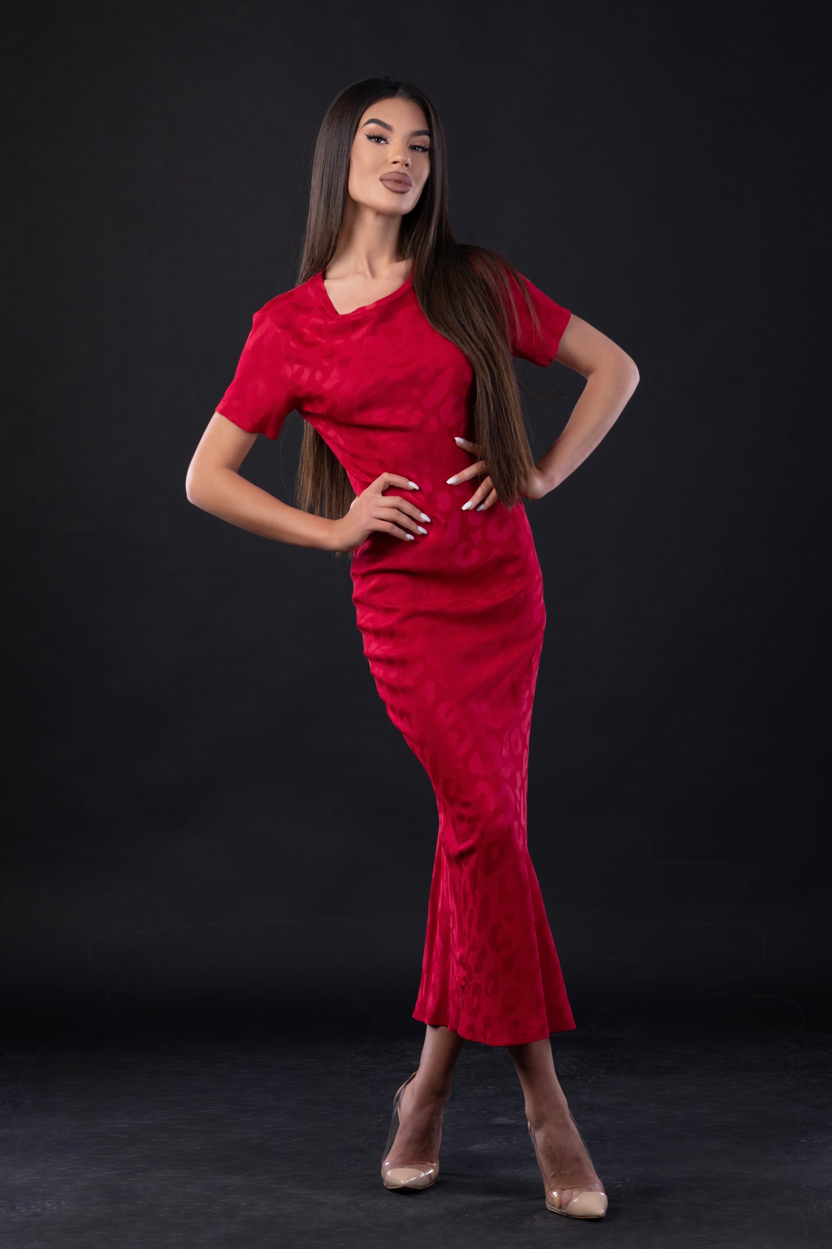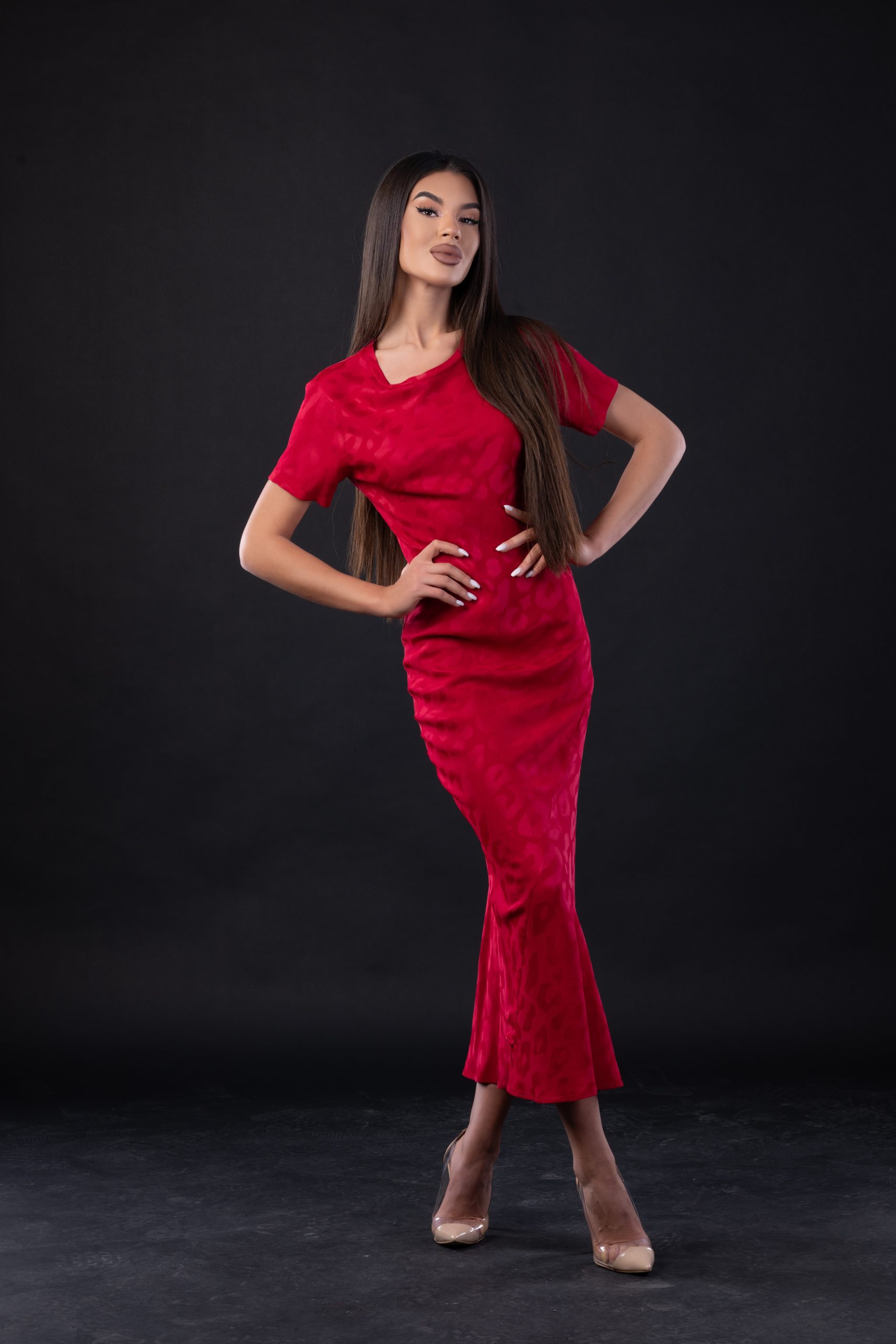 Elegant dress made of satin fabric with an exquisite jacquard animal effect, woven directly into the fabric for a luxurious embossed look. The texture gently catches the light and emphasizes the feminine silhouette, as the dress falls beautifully and shapes the figure in a natural way. It is suitable for formal events, evening occasions and special moments when you want to impress with elegance and subtle shine.