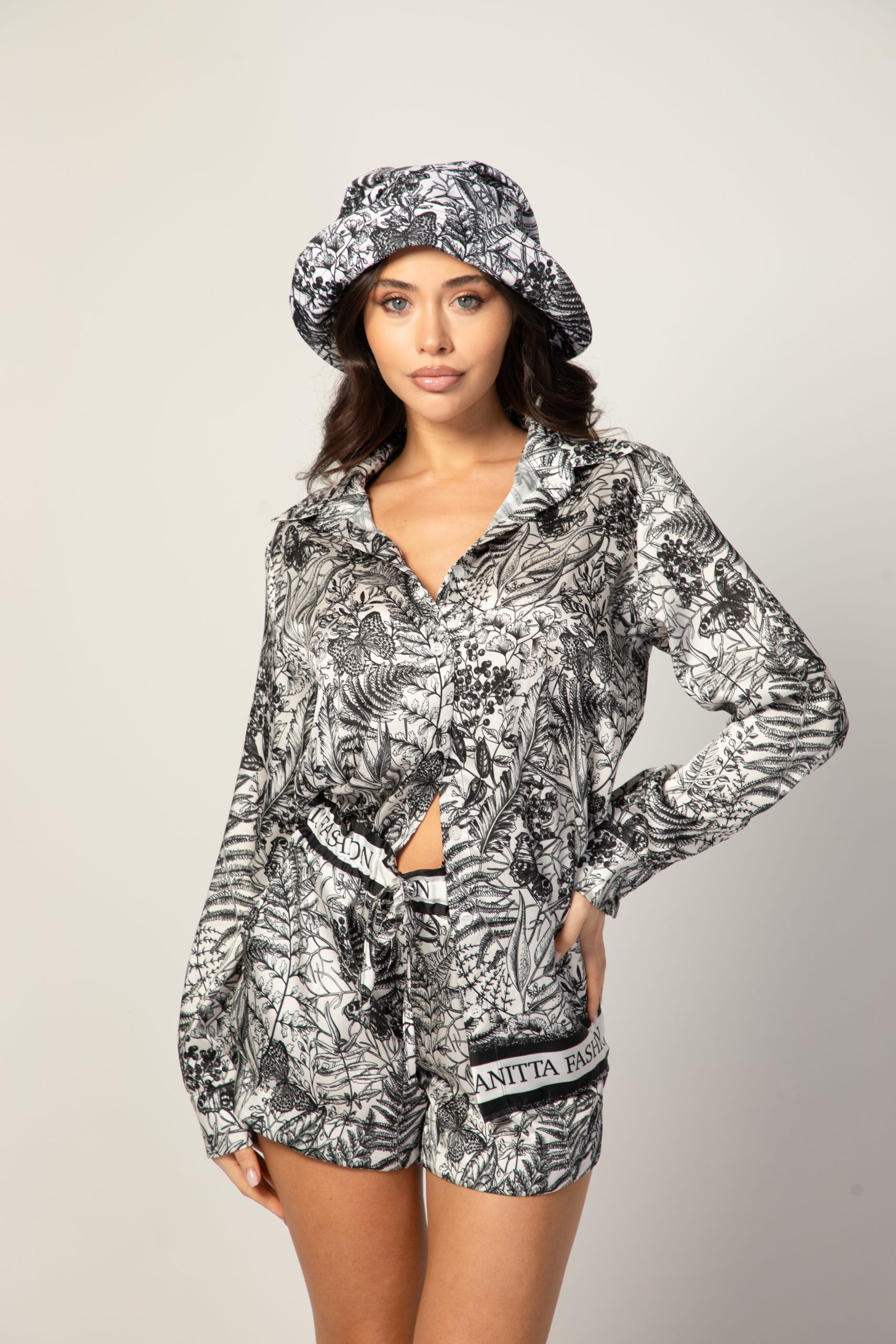 Daily ladies set made of thick elastic fabric. It consists of a wide blouse with long sleeves and short pants.