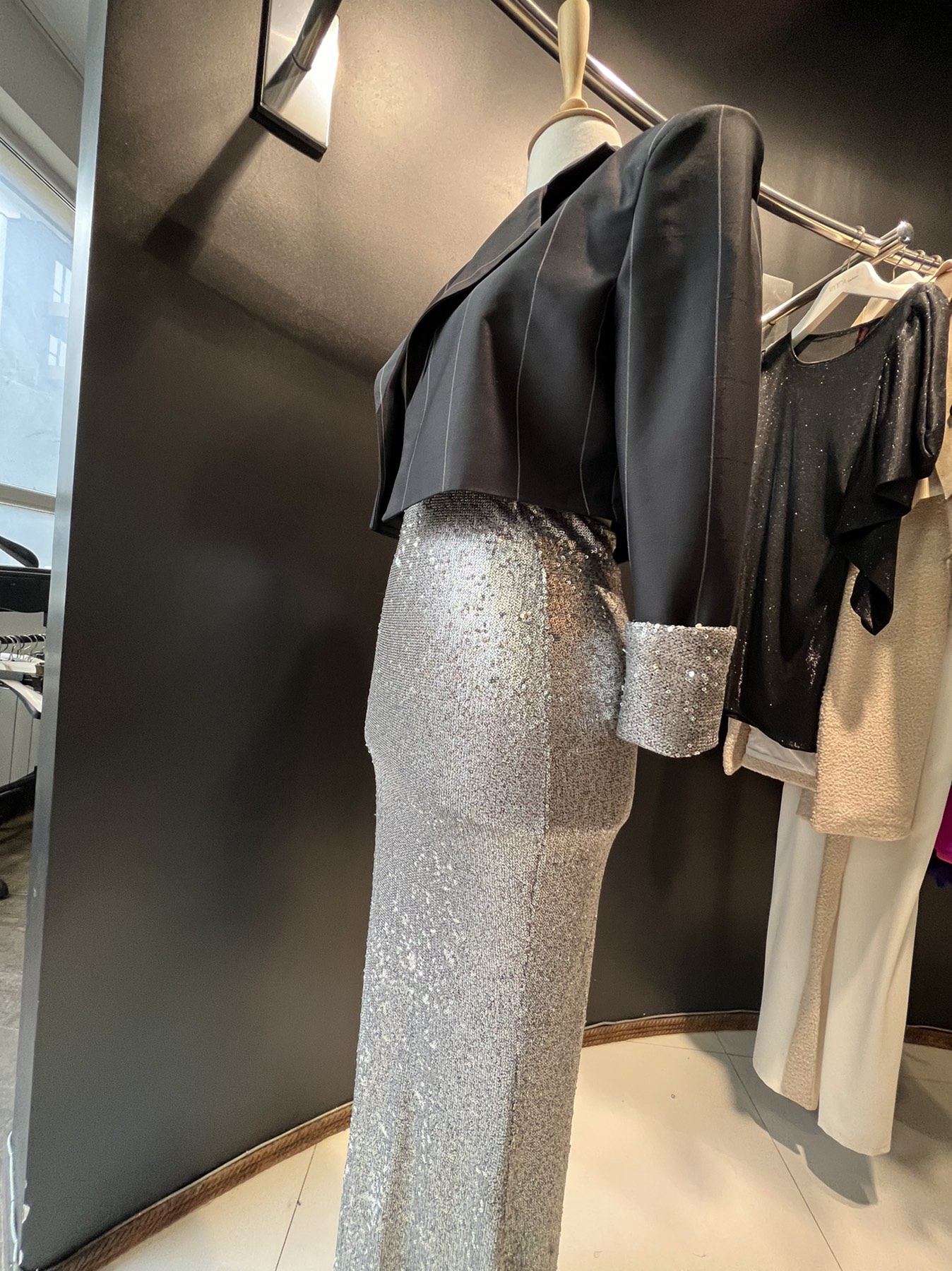 The jacket has a classic cut and a silver sequin cuff.