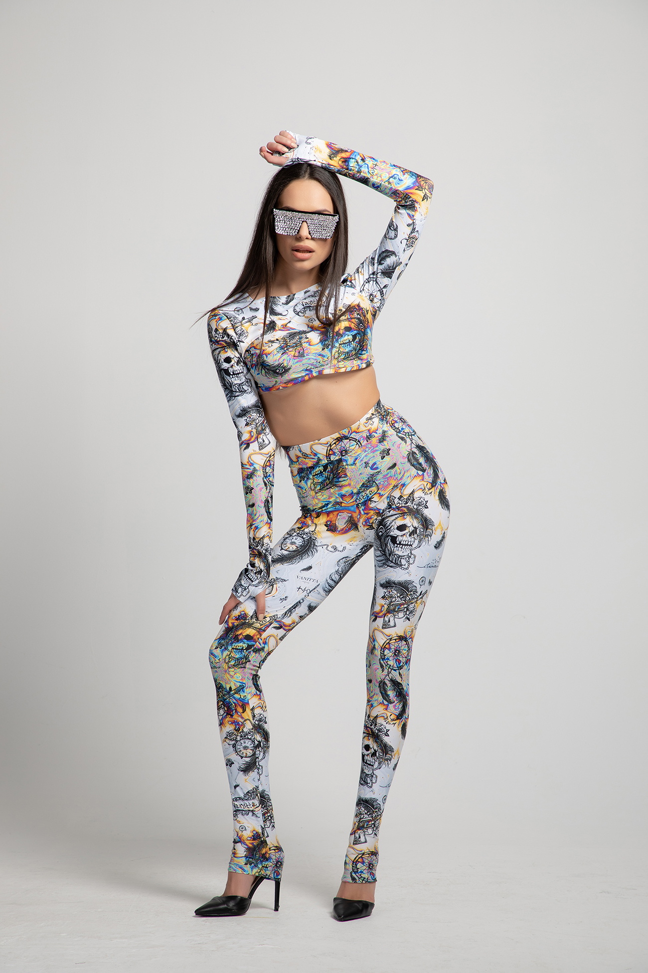 Daily ladies set made of thick elastic fabric. It consists of a wide blouse with long sleeves and short pants.