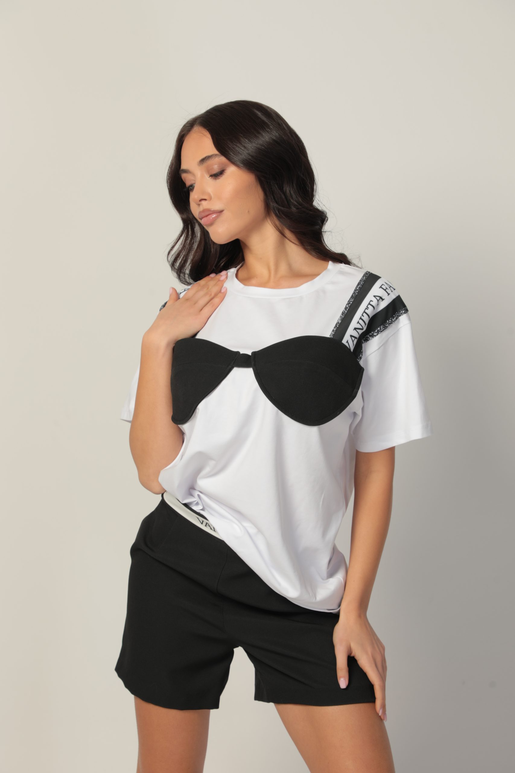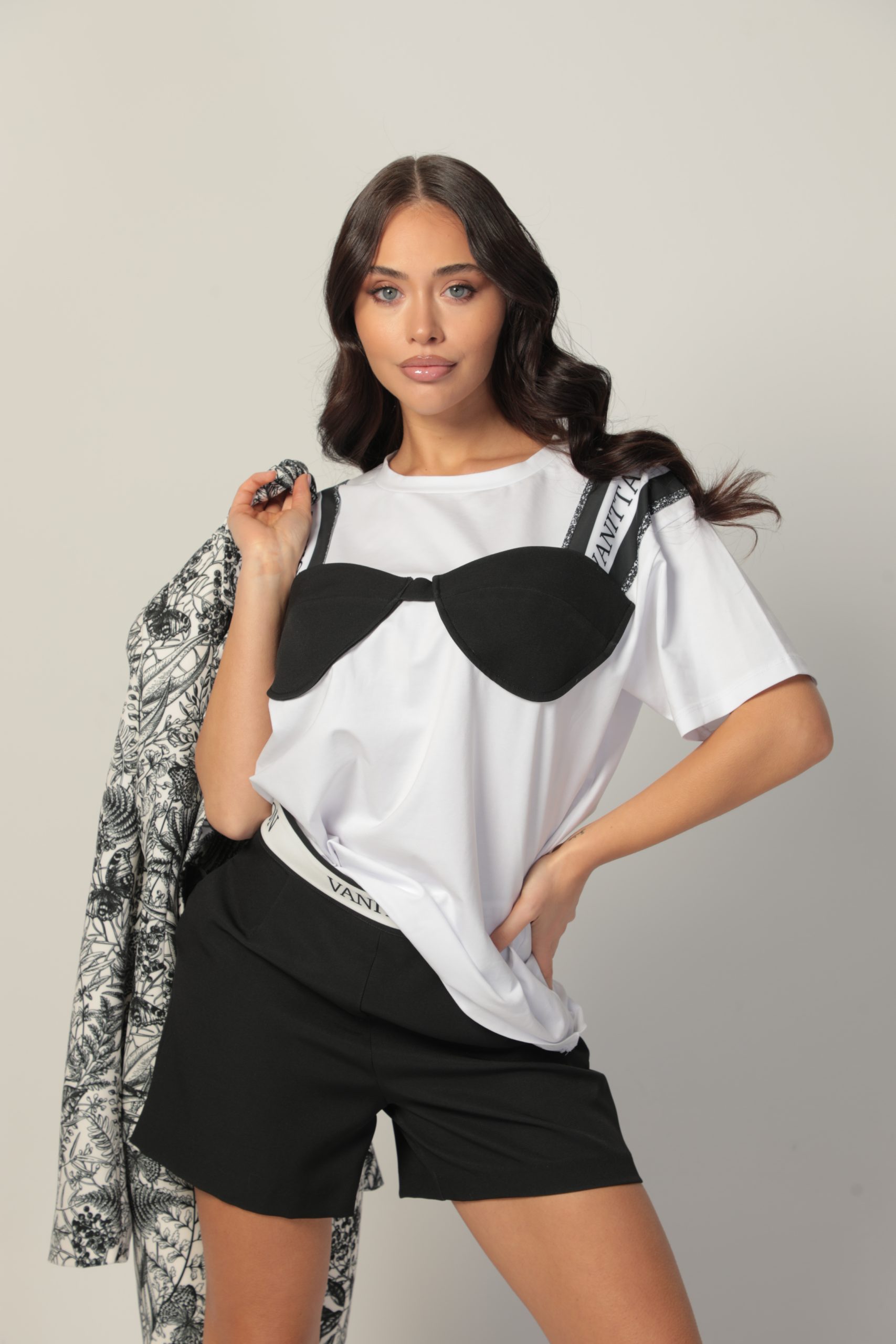 Daily ladies set made of thick elastic fabric. It consists of a wide blouse with long sleeves and short pants.