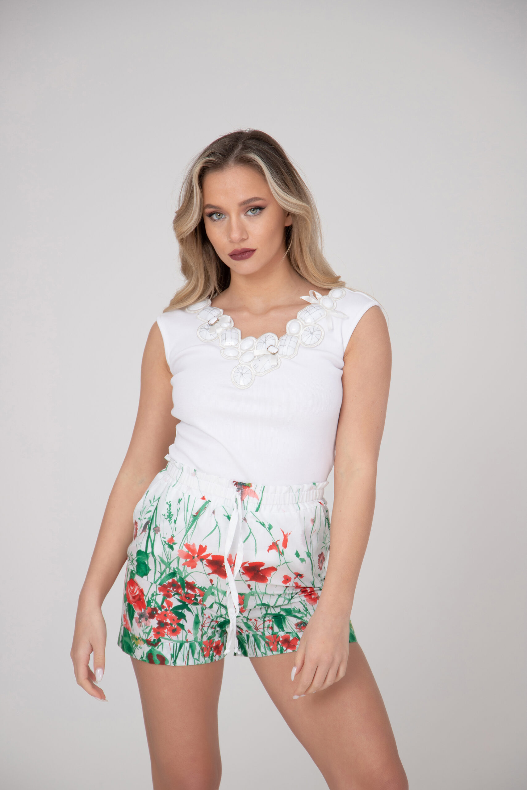 Women’s top made of delicate white fabric with beautiful embroidery and stones wrapped with silver threads.