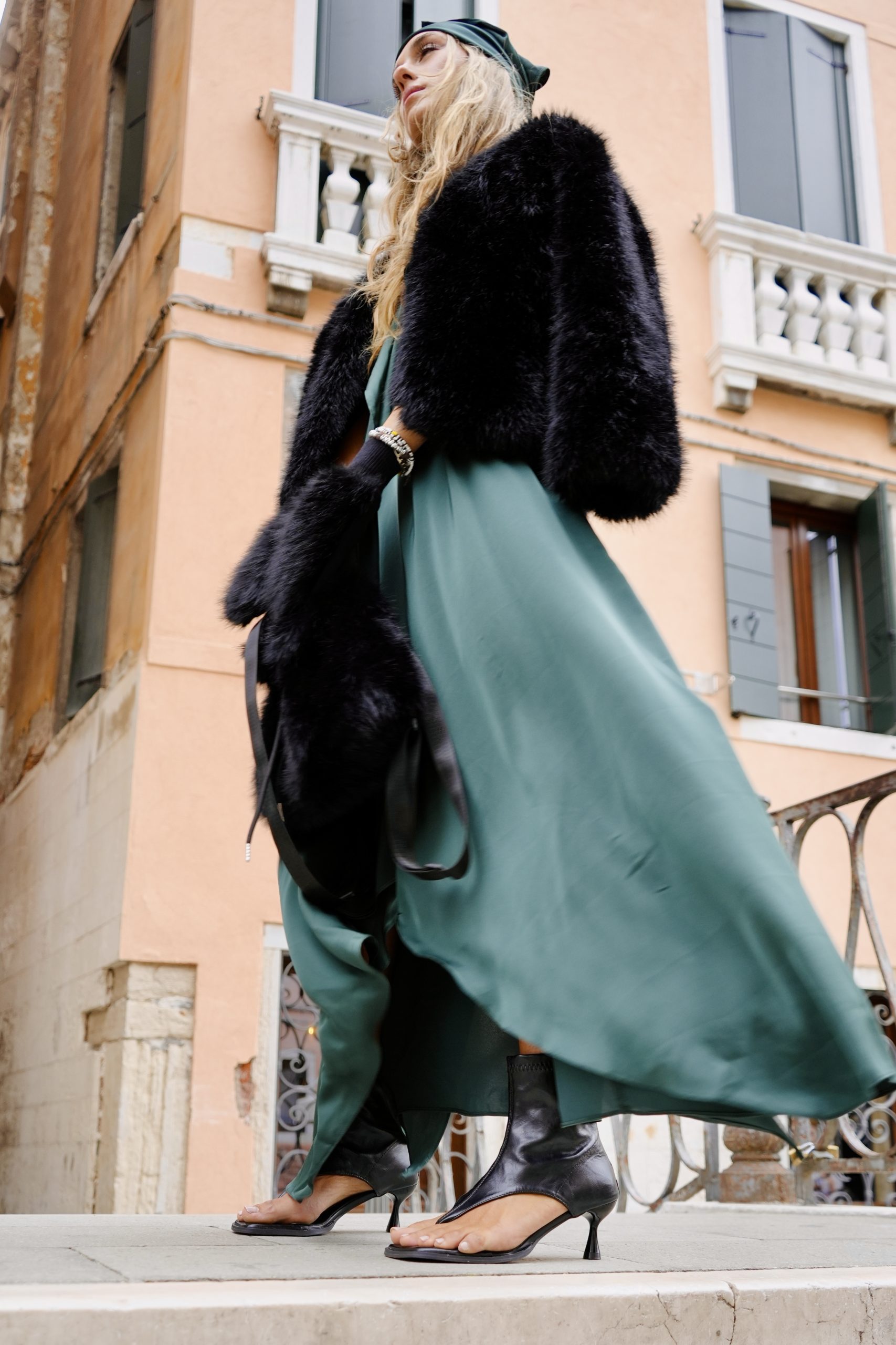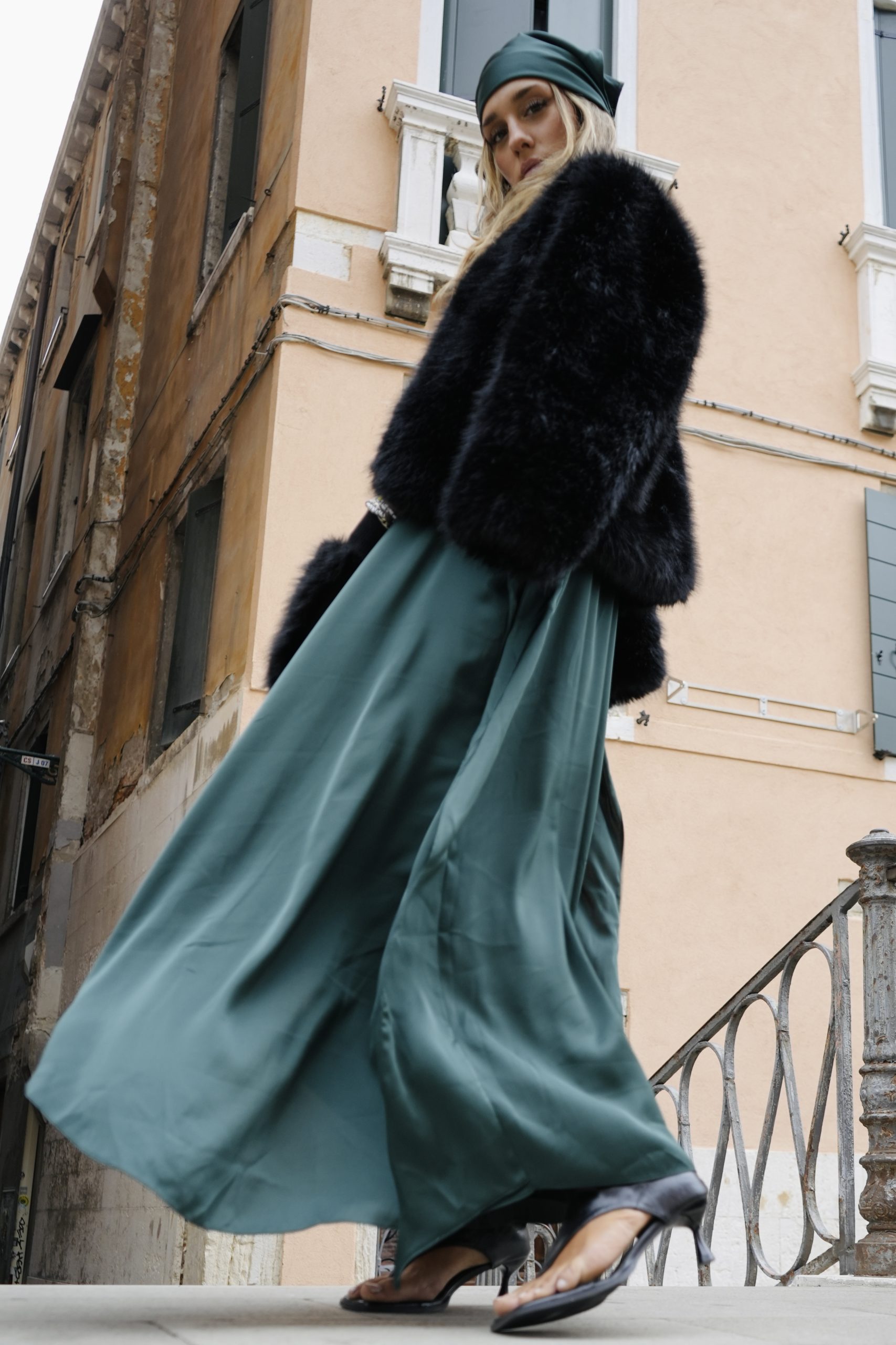 Луксозно късо палто, изработено от висококачествен еко косъм в наситено черен цвят. Моделът е с права линия и обемни ръкави, които създават изразителен силует и придават елегантен завършек на всяка визия. Дължината до кръста го прави универсално и лесно за комбиниране – както с вечерни рокли, така и с ежедневни тоалети. Меката текстура и пухкавата структура създават усещане за комфорт и стил.