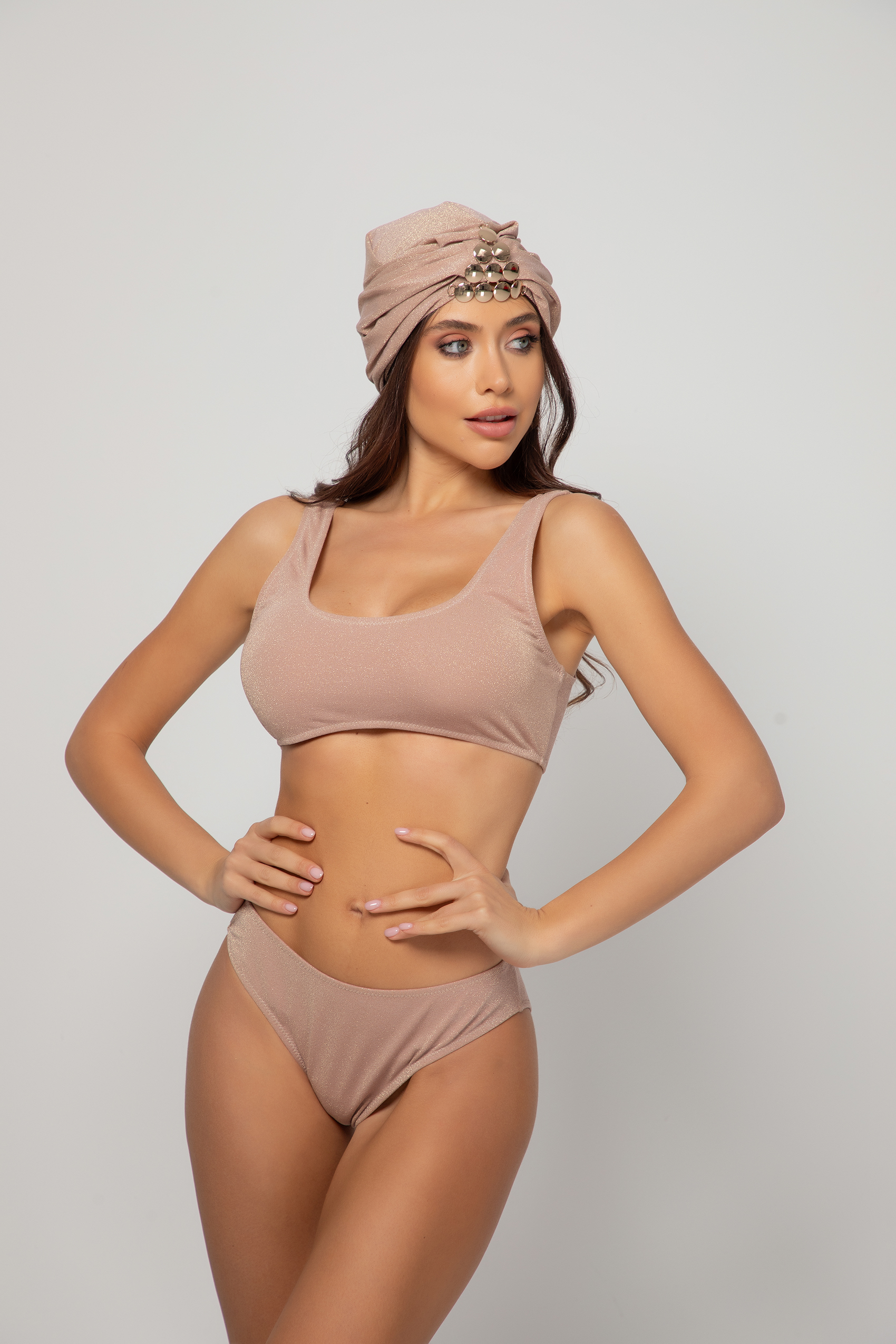 Горната част е T-bustier с деликатна подплата, която осигурява комфорт и подкрепа, подчертавайки естествената красота на бюста. Дизайнът на бюстието придава модерност и изтънченост, съчетавайки стил и функционалност. Долната част е класическа бикина, която перфектно допълва горната част, предлагайки комфорт и свобода на движение. Този модел е създаден за дами, които искат да изглеждат елегантно и да се чувстват уверени на плажа.