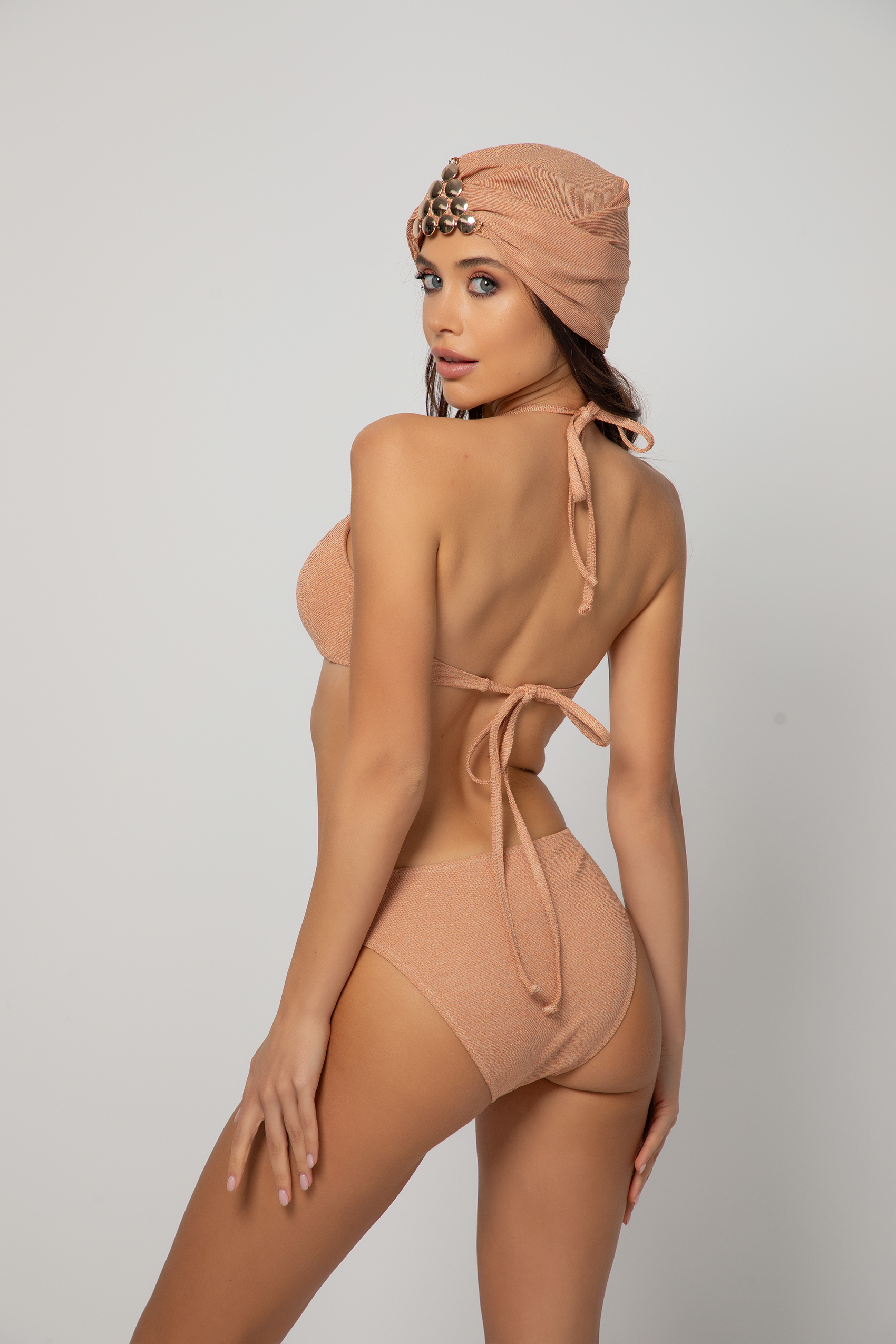 Красив бански от две части в телесен пясъчен цвят, изработен от фино плетиво с дискретна лъскавина – Lurex. Банският е мек и много комфортен за носене. Изключително бързосъхнещ!