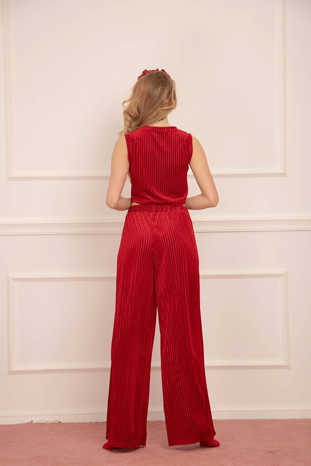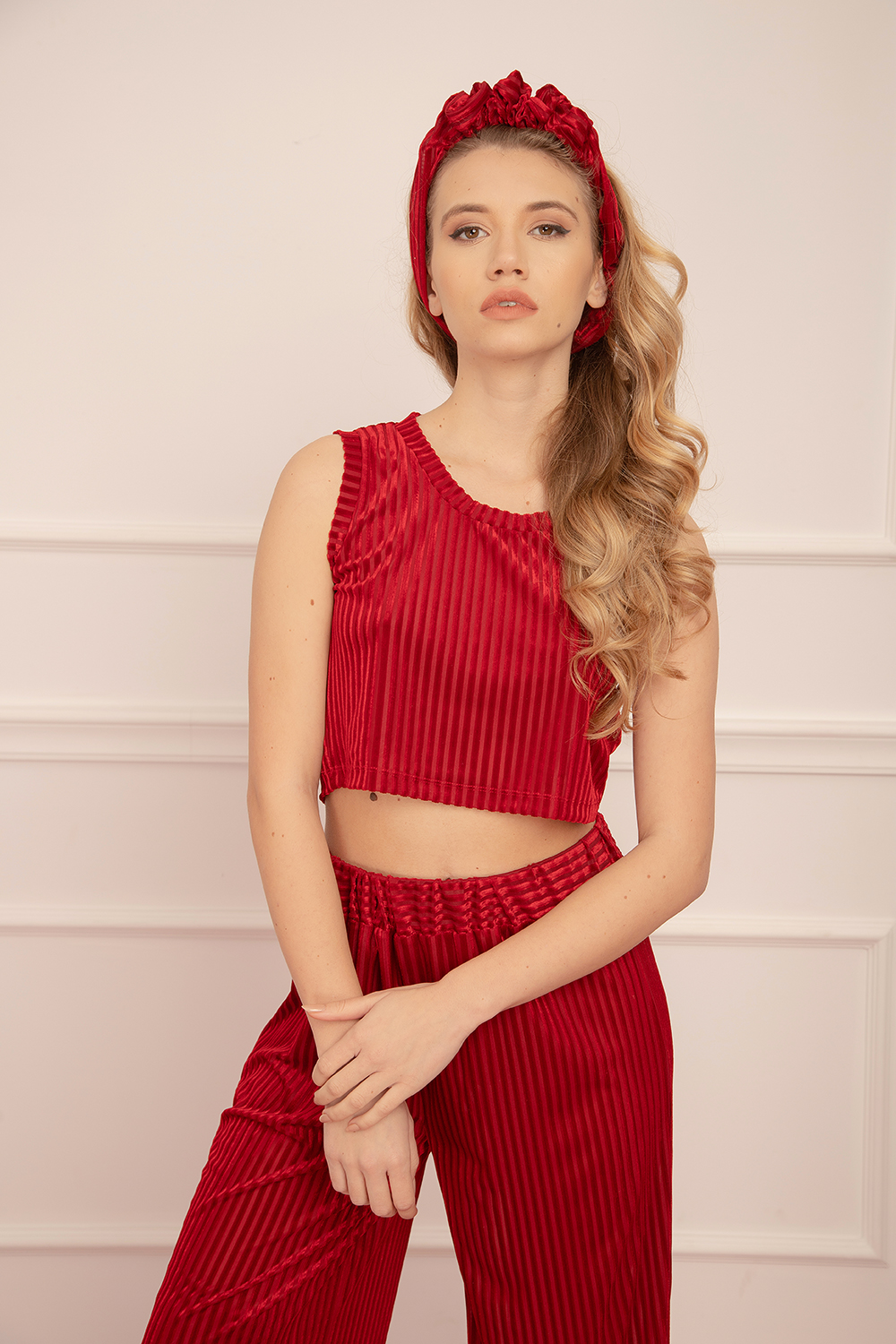 Дамски комплект, къс потник с презрамки свободен силует и панталон с ластик на талията, изработен от кадифе на ефектно райе.